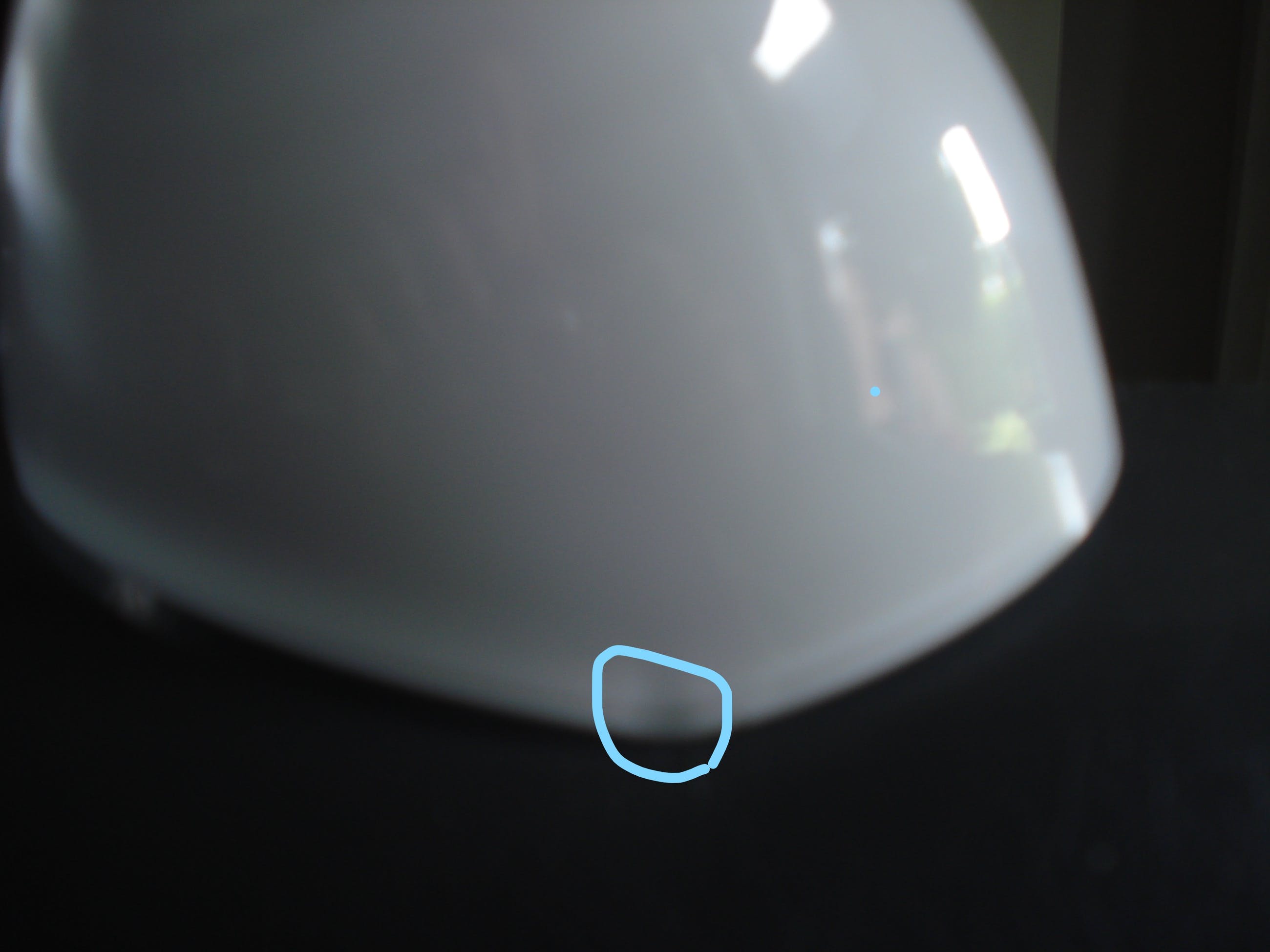 Er zijn twee minimale chipjes (zie foto's, gemerkt met blauw cirkeltje) vandaar de lage prijs, maar nauwelijks te zien en dus ook moeilijk te fotograferen
