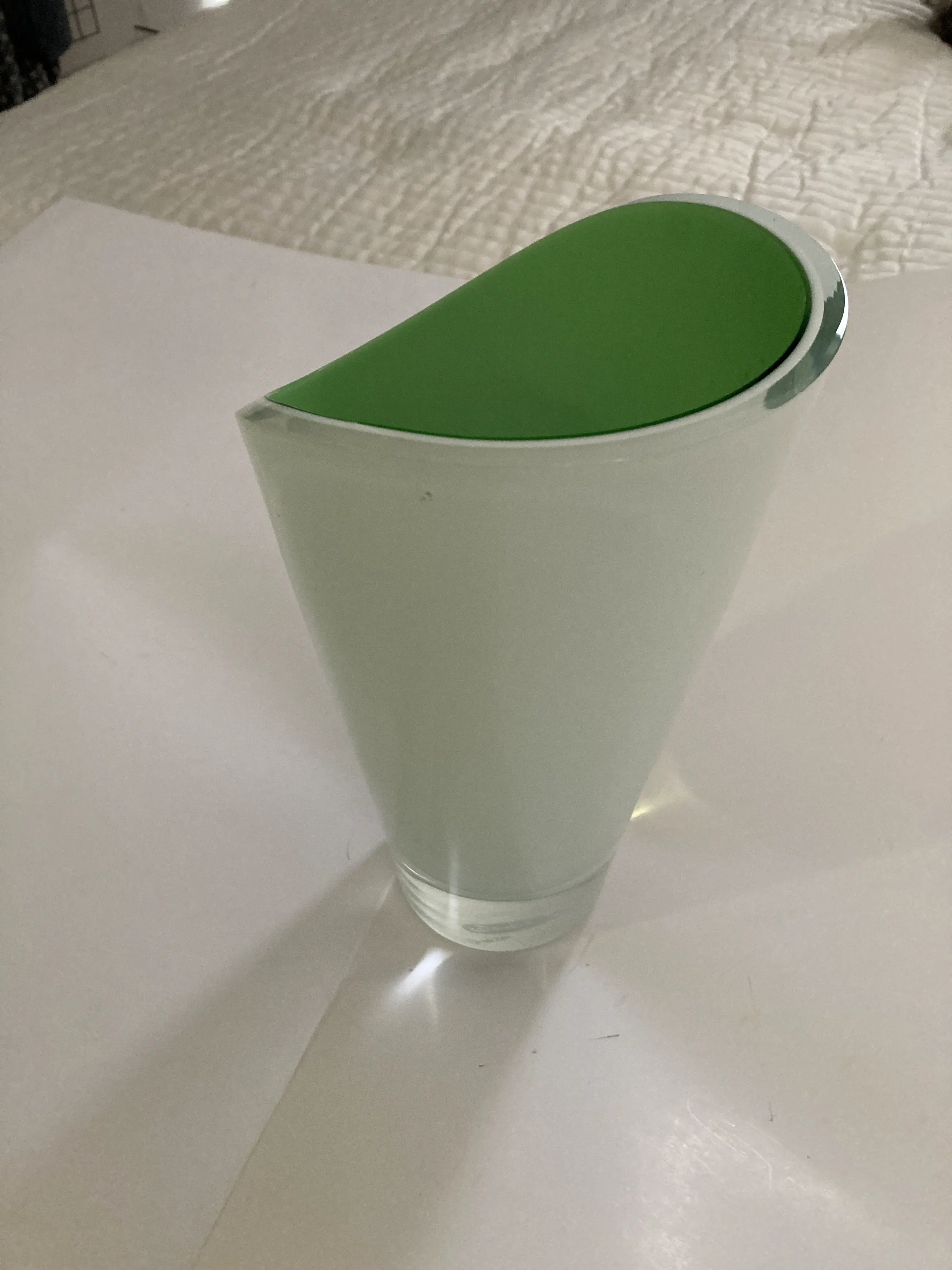 Deze vaas is gemaakt voor Campina en is een afgeleide van de bekende Batman vaas en heeft de kleuren die refereren aan melk, ijs en groen van het logo van Campina. Techniek: In vorm geblazen, multi-layered conisch gestileerd,bovenzijde schuin met aflopende ronding. Op de onderkant 105/300 met signature CR. Etsmerk : Logo van Campina.