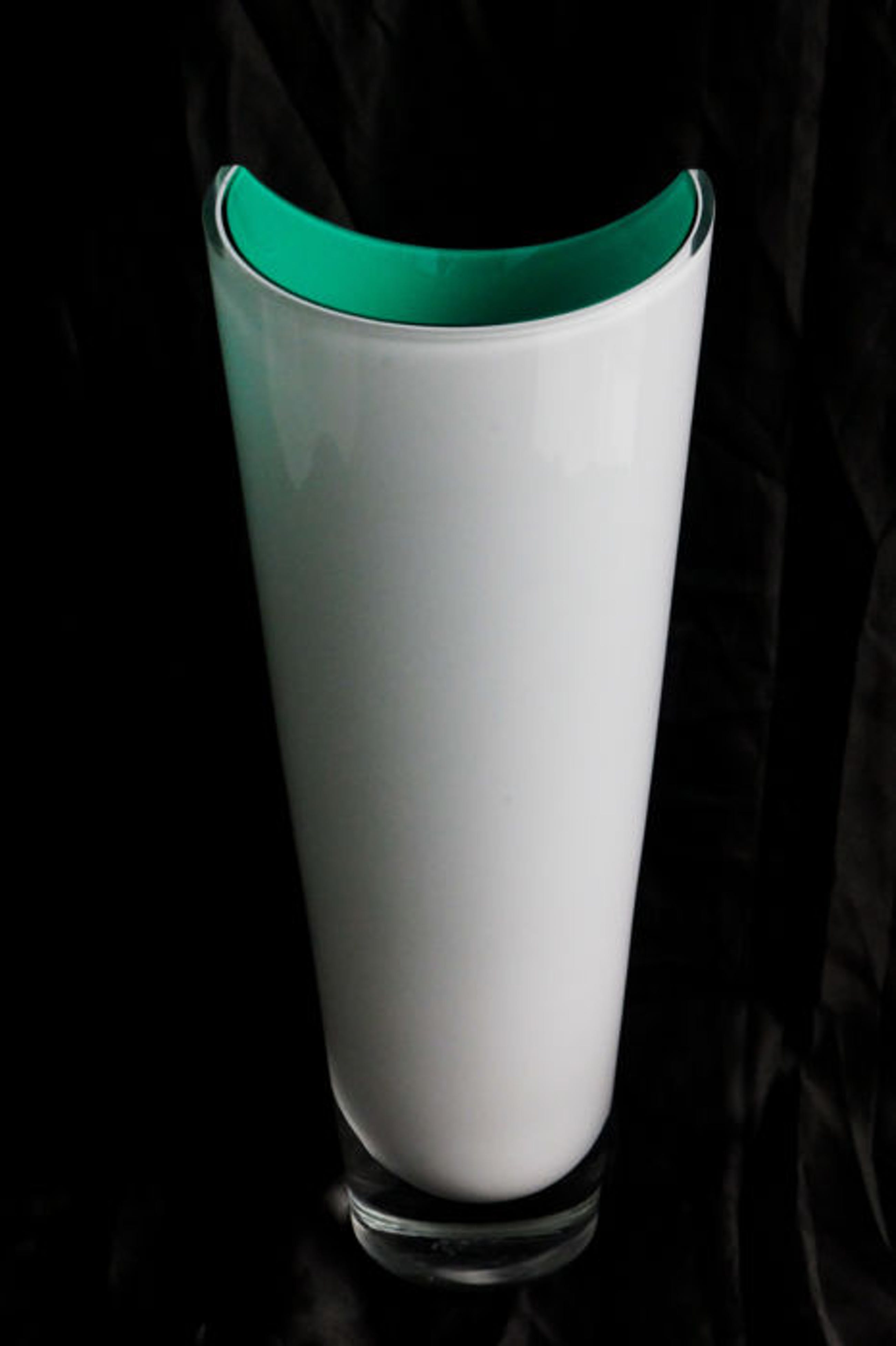 Ontwerp is van Carina Riezebos (huisontwerpster van Royal Leerdam glas). De vaas heeft een blauw-groene binnenkant, dan een witte overlay en een heldere buitenkant en basis. Mondgeblazen, verschillende lagen glas in een keer aan de blaasstok en uitgeblazen in een houten mal. Vervolgens geslepen en gepolijst met de grootste zorgvuldigheid en blijk van ambachtelijke kennis en kunde. GEEN VERZENDING NAAR NIET-EU LANDEN