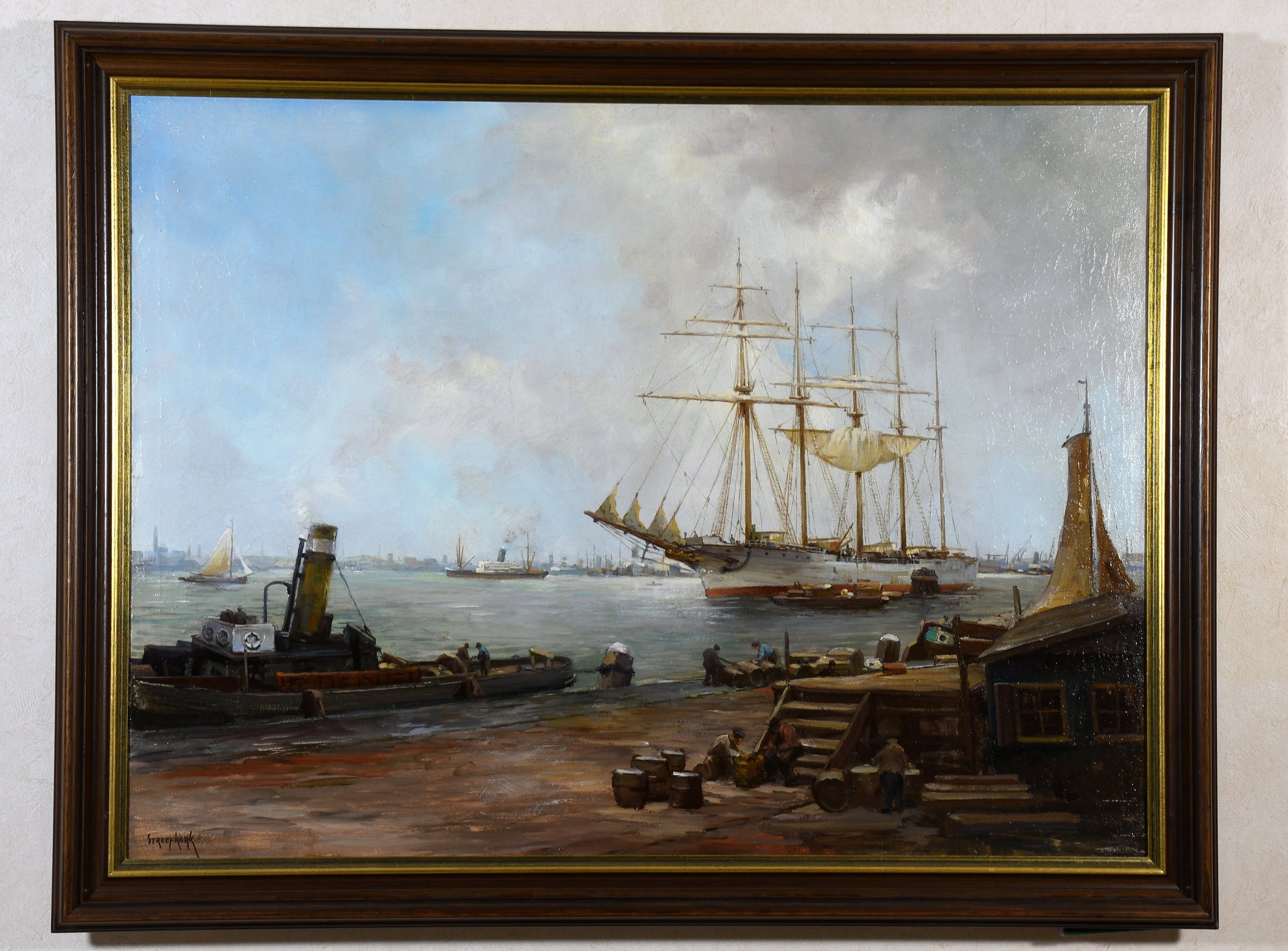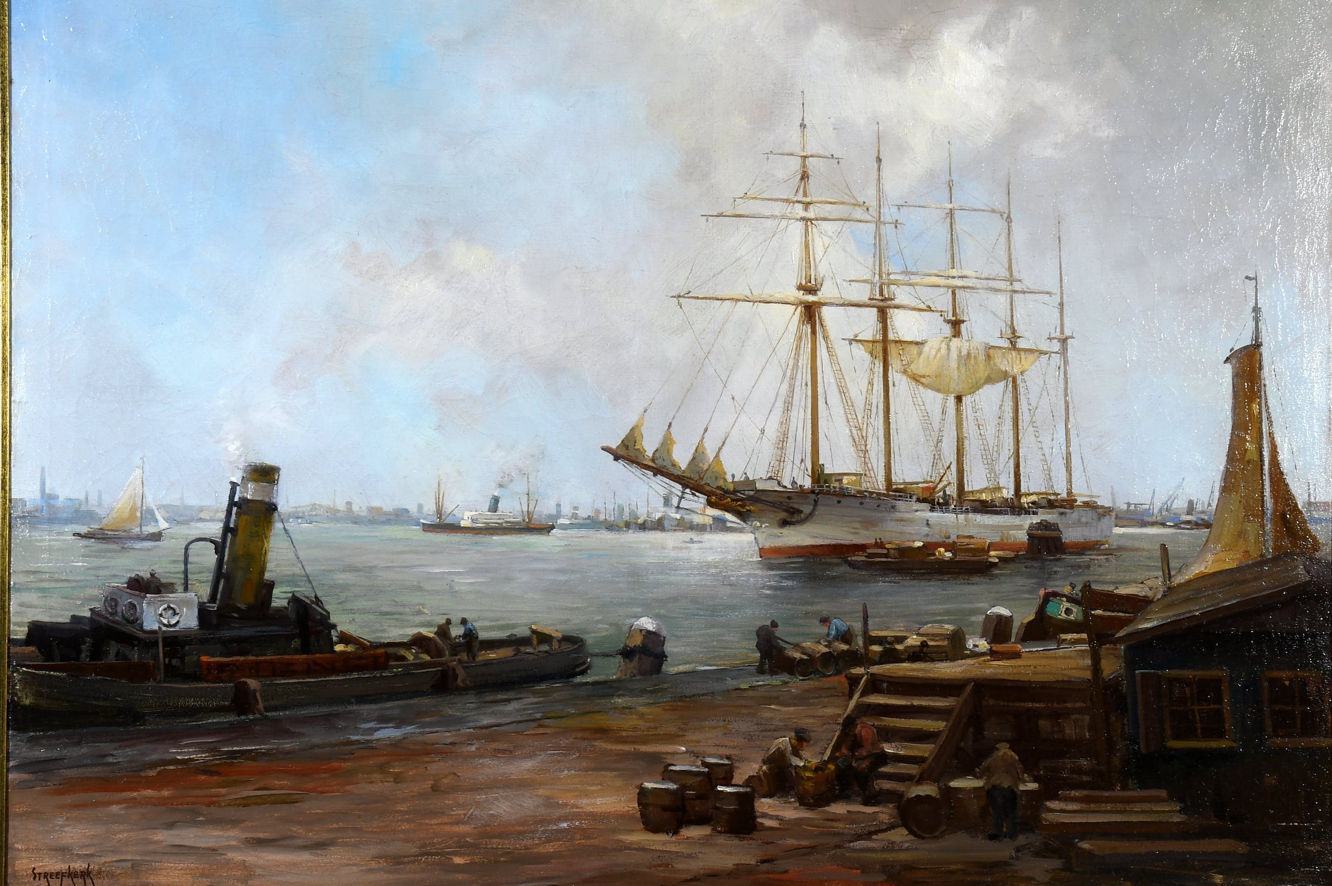 Fraai geschilderd havengezicht van boten, zeilschepen, sleepboot en figuren/havenwerkers aan 't werk op de kade.Streefkerk was een schilder van landschappen, stillevens en vooral Amsterdamse stadsgezichten.Streefkerk werd op 29-05-1884 in Amsterdam geboren. In deze stad bezocht hij de avondtekenschool o.l.v. J. Walraven.Behalve in Amsterdam woonde en werkte Streefkerk in Amstelveen, Enschede, Naarden en Bussum. Hier overleed hij op 22-08-1968 ( bron: lexicon Pieter A. Scheen).Kleurrijk geschilderd in olieverf op doek en gesigneerd links onder, in een mooie bijpassende lijst.