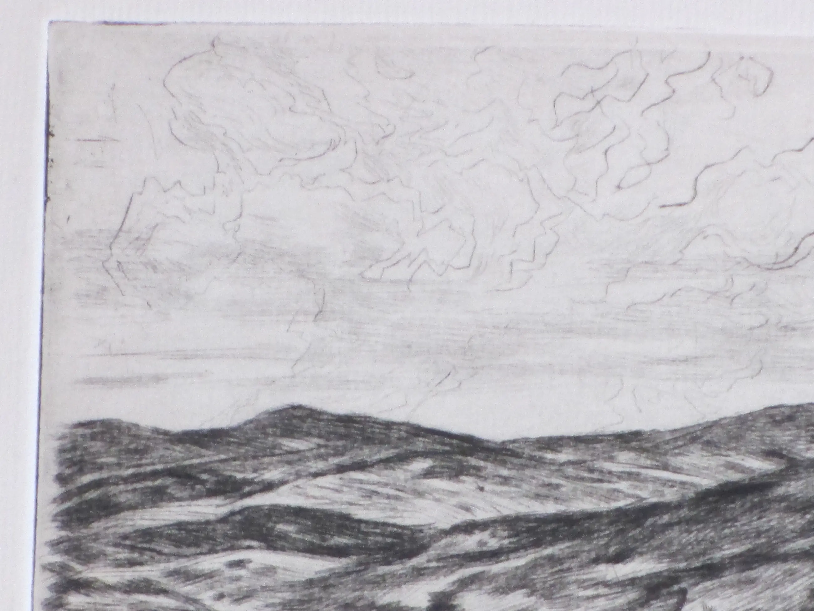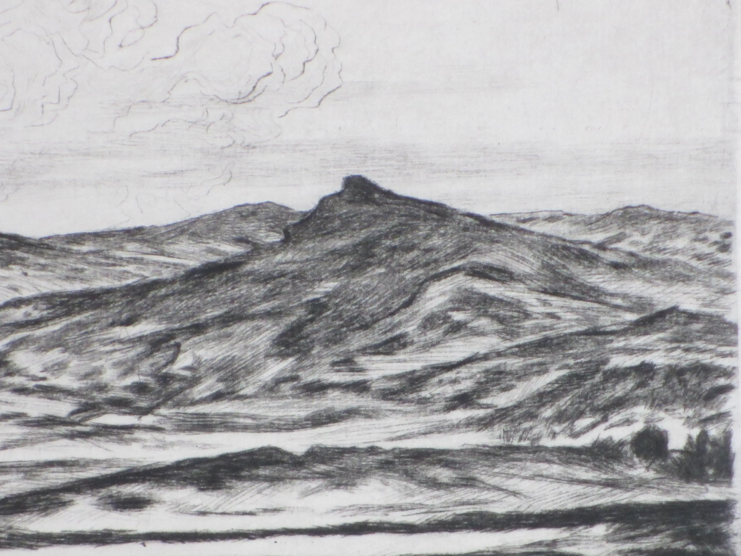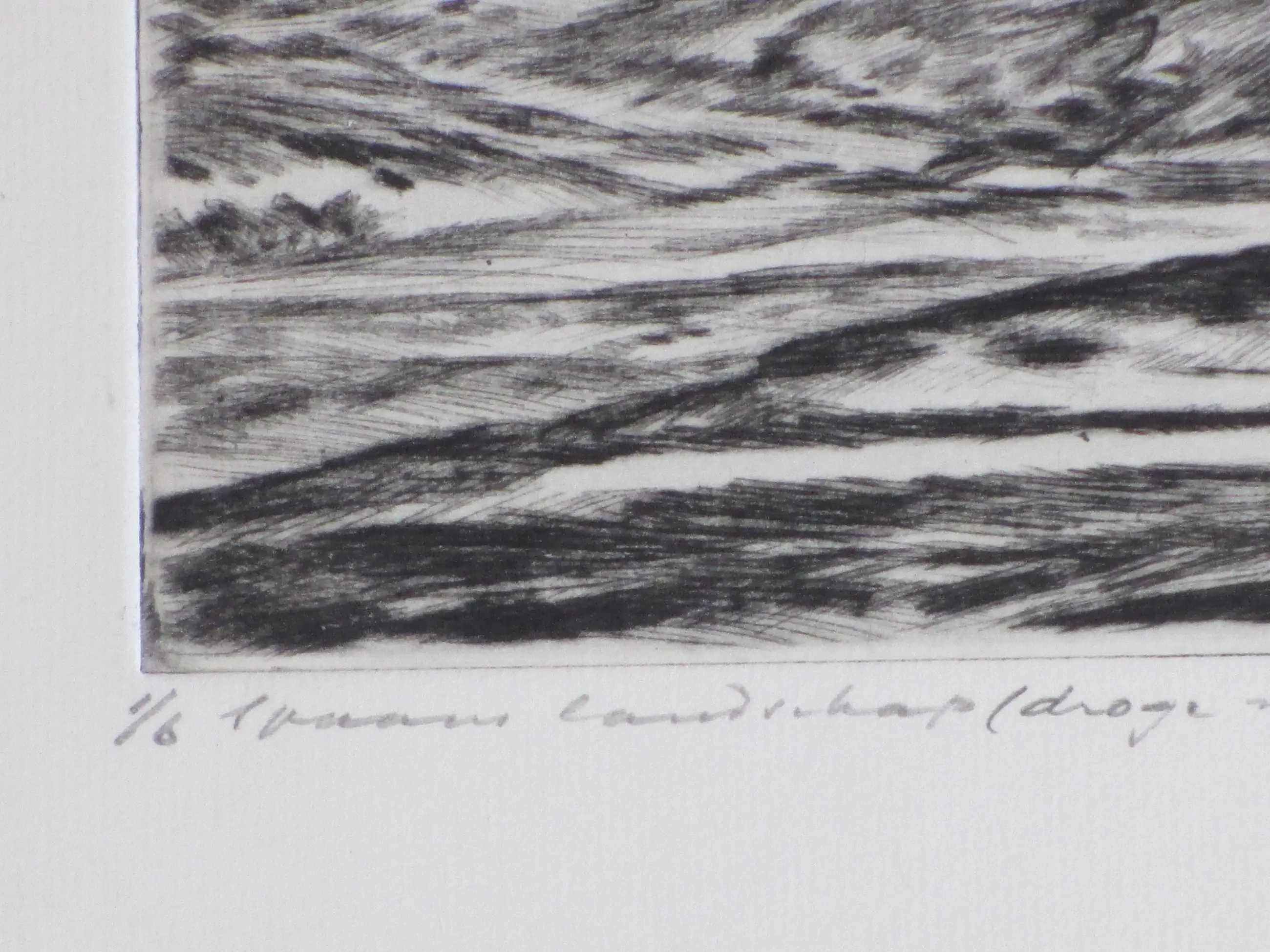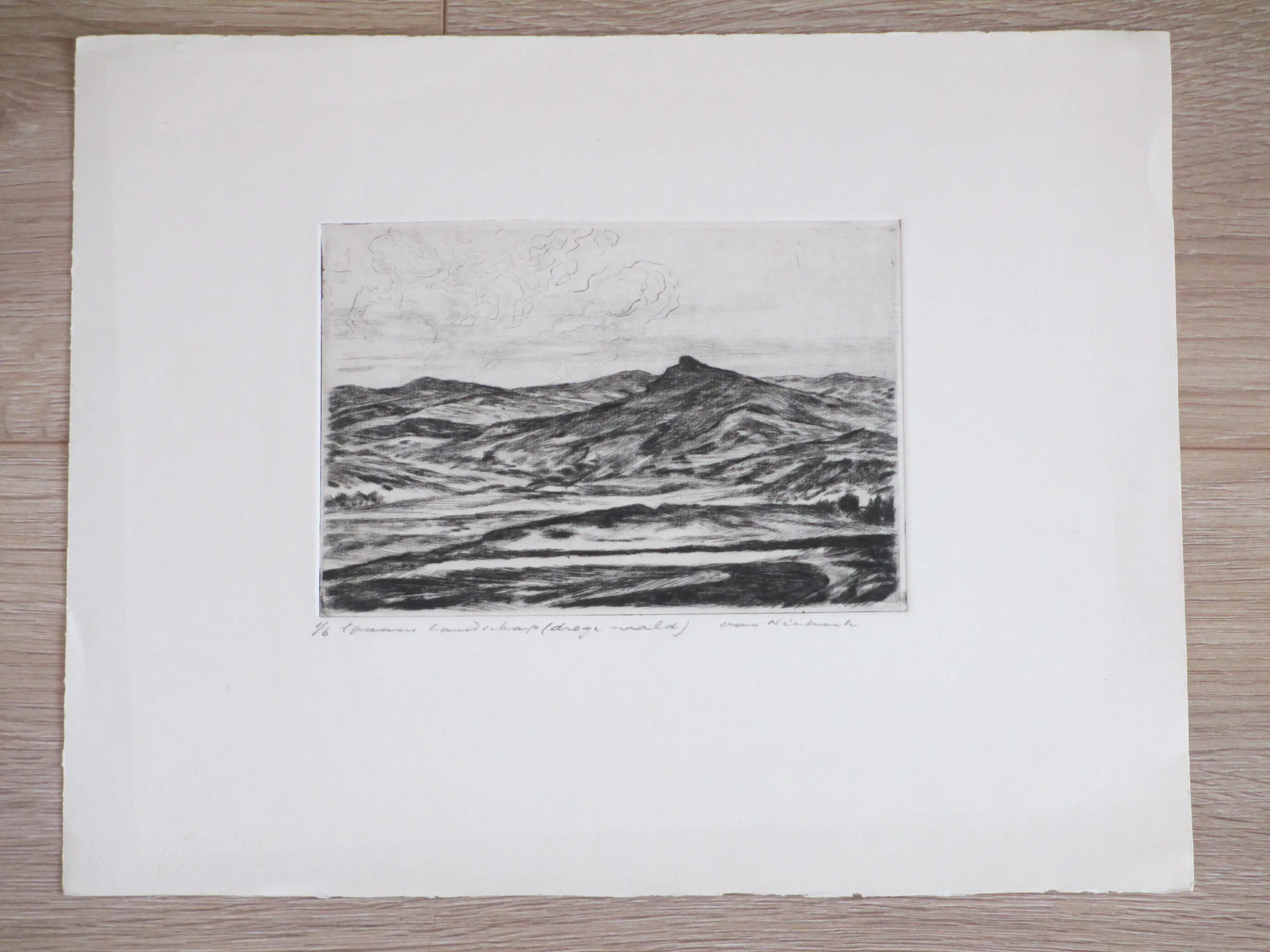 Ets door Carl C. van Niekerk Voorstelling van een Spaans landschap Losbladig, beedmaat 12x18, bladmaat 27x34 Gesigneerd in potlood r.o.: 'van Niekerk' Genummerd, getiteld en annotatie l.o.: '1/6', 'Spaans landschap (droge naald)' Authenticiteit volledig gegarandeerd