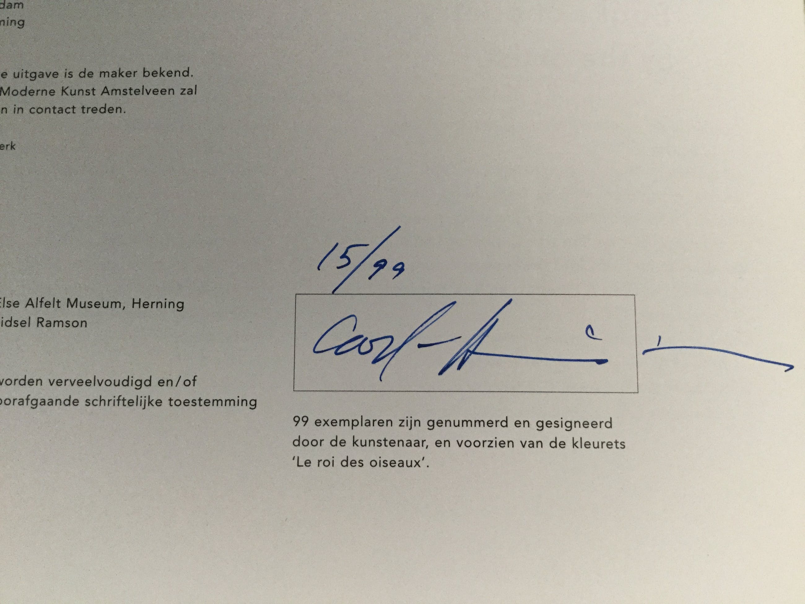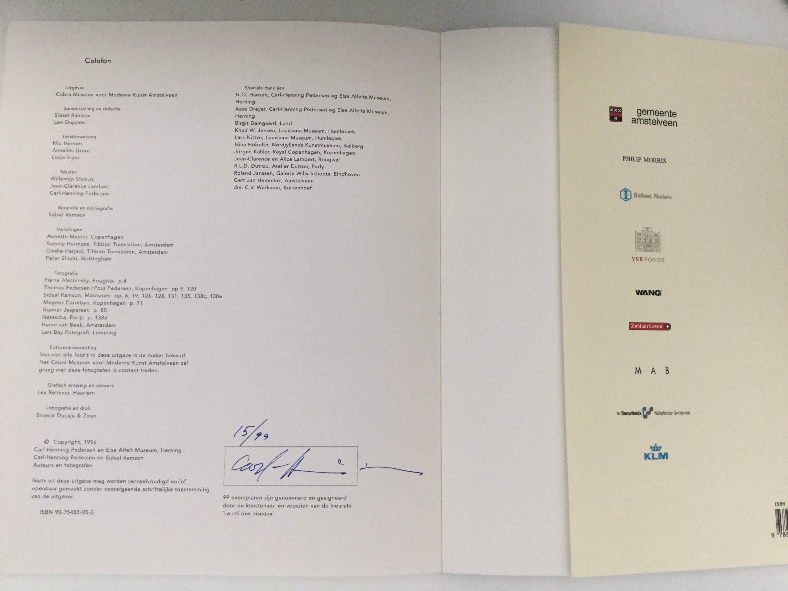 In 1996-97 is er in het Cobra Museum voor Moderne Kunst in Amstelveen een solo-expositie van Carl-Henning Pedersen geweest. Genaamd: ‘Carl-Henning Pedersen or the Good Use of the Marvellous’. Bij de tentoonstelling is een catalogus verschenen. 99 hiervan zijn genummerd en gesigneerd en voorzien van deze ets. Deze gesigneerde catalogus (15/99) is behoort ook bij dit lot/kavel. Foto’s hiervan kunt u bekijken.