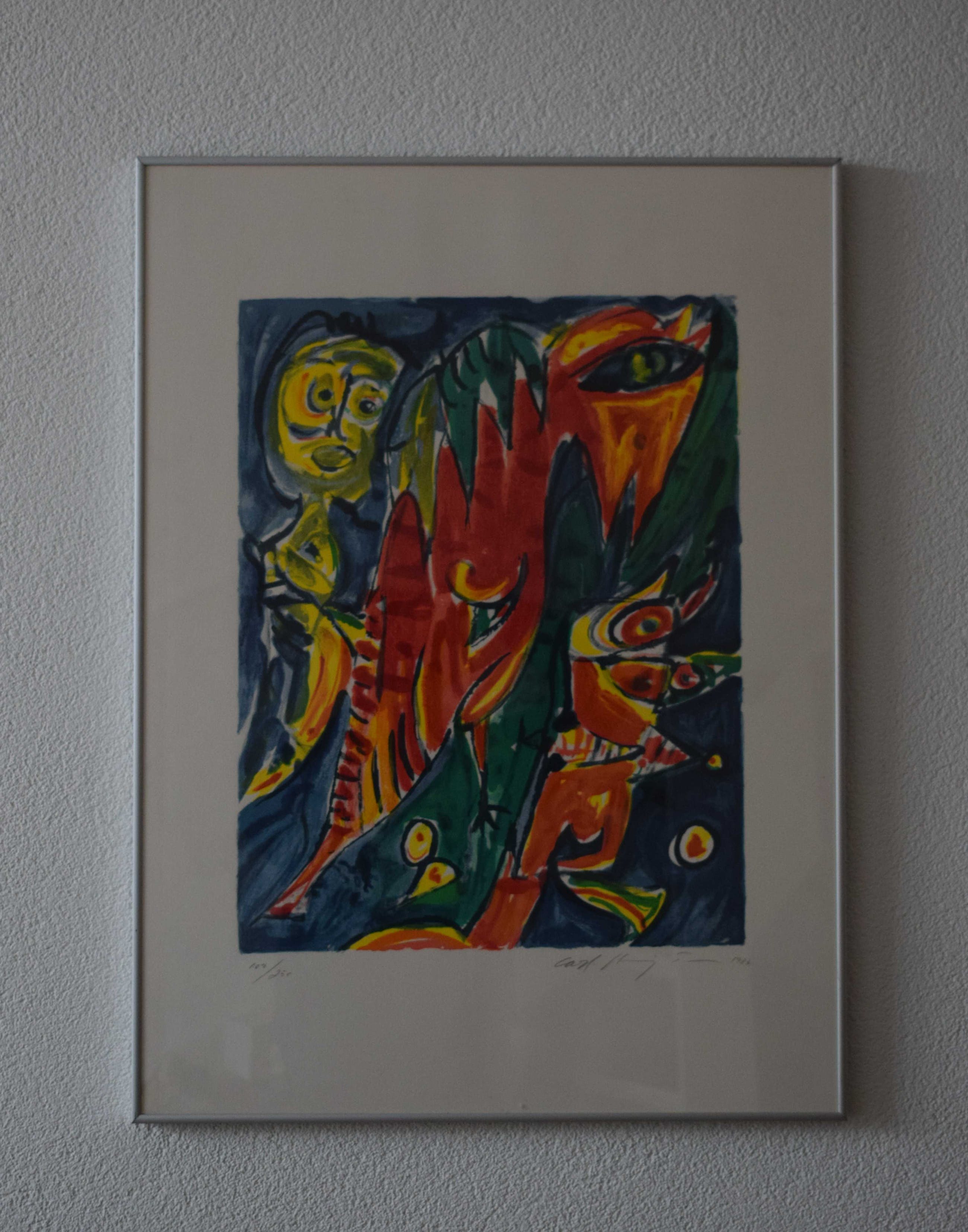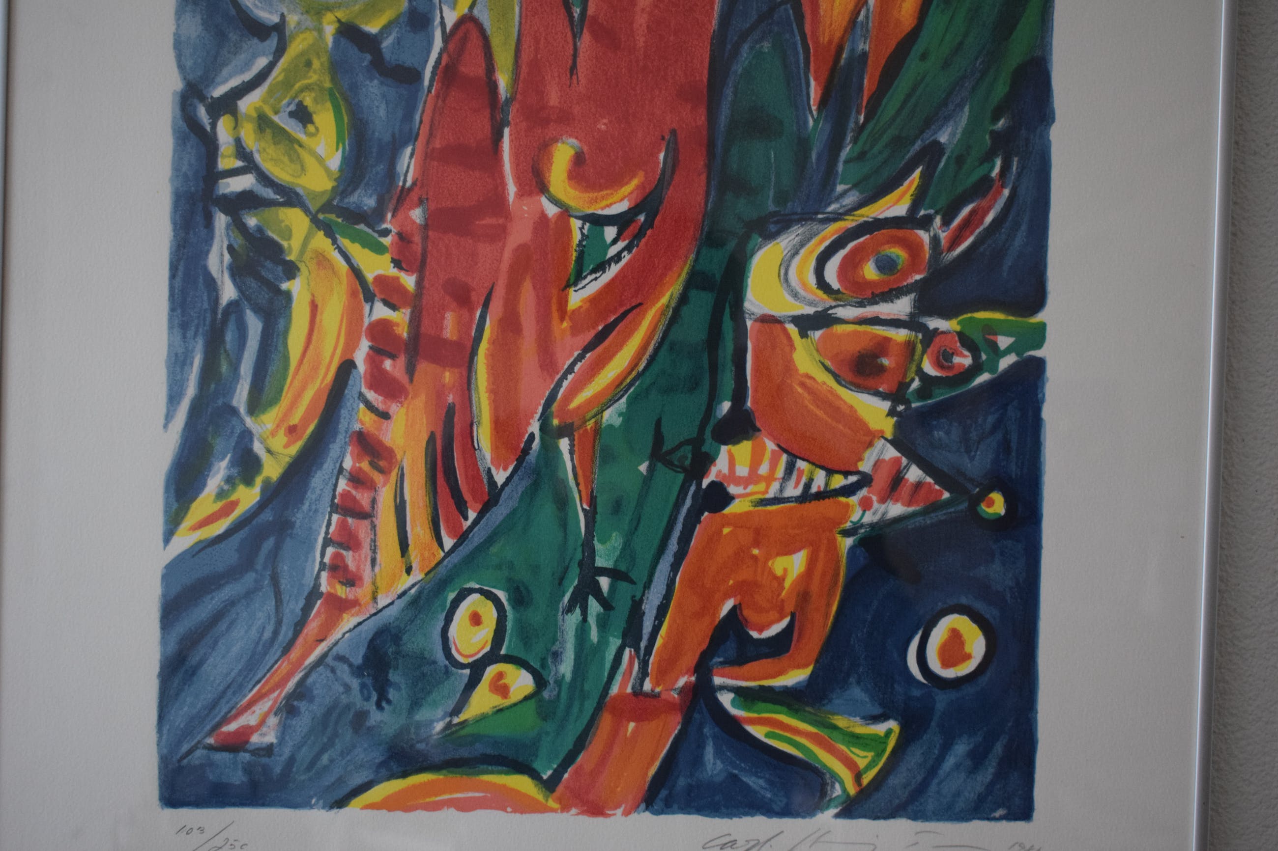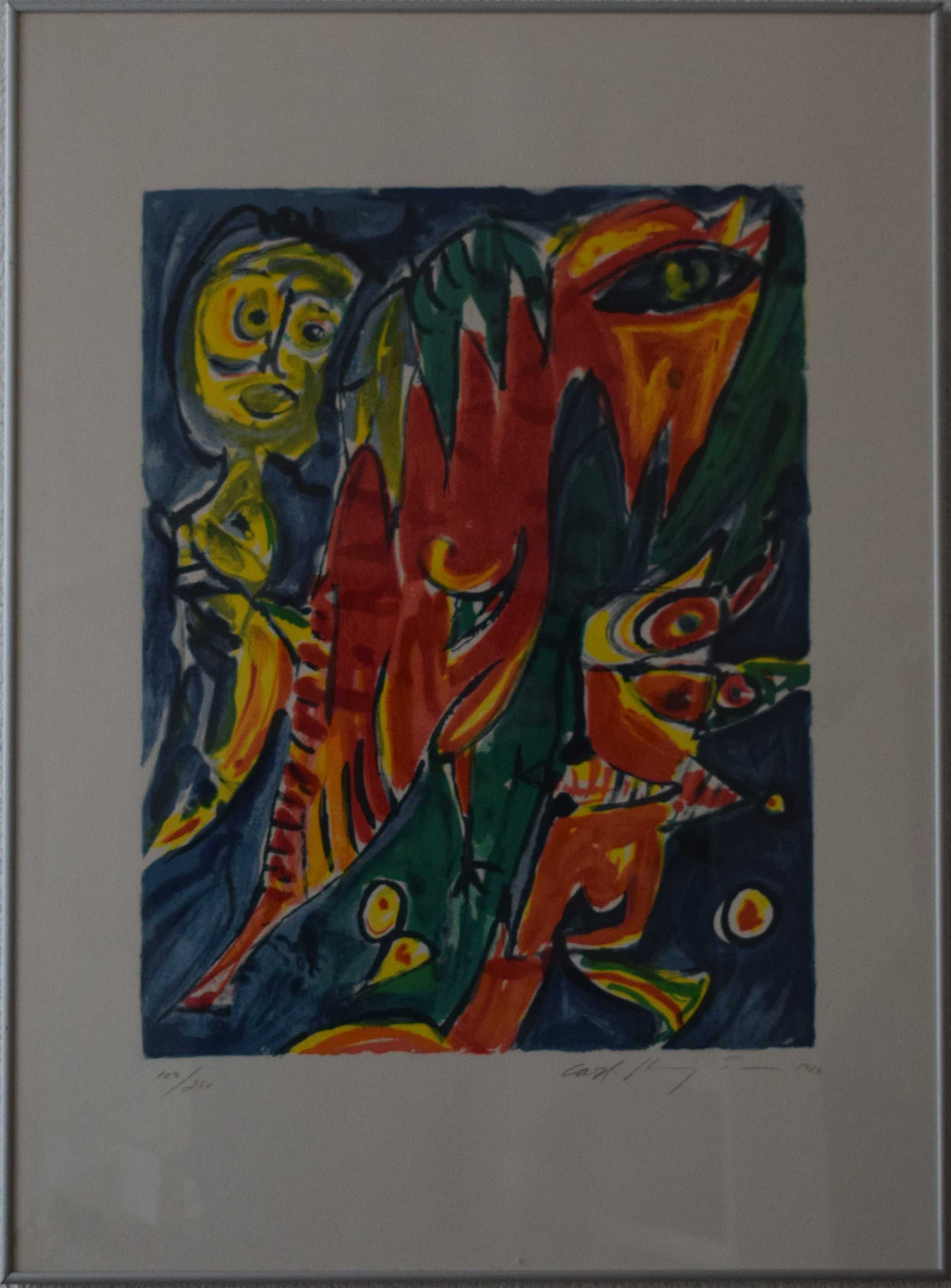 Kleurige grote litho van de Deense Cobra kunstenaar Carl Henning Pedersen (1913 - 2007). Het werk is gedrukt op geschept papier. De litho is voluit gesigneerd, gedateerd (1985) en genummerd 103/250.