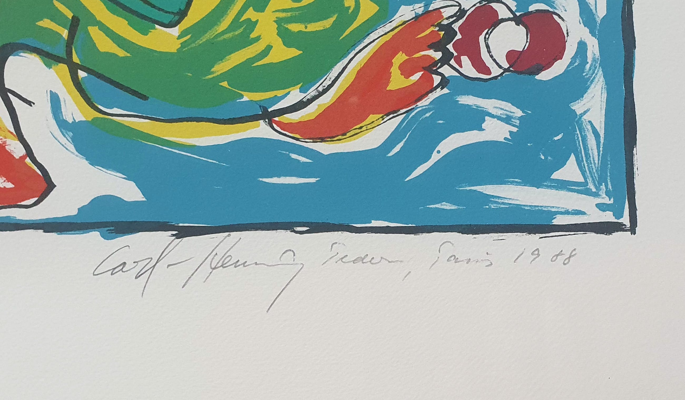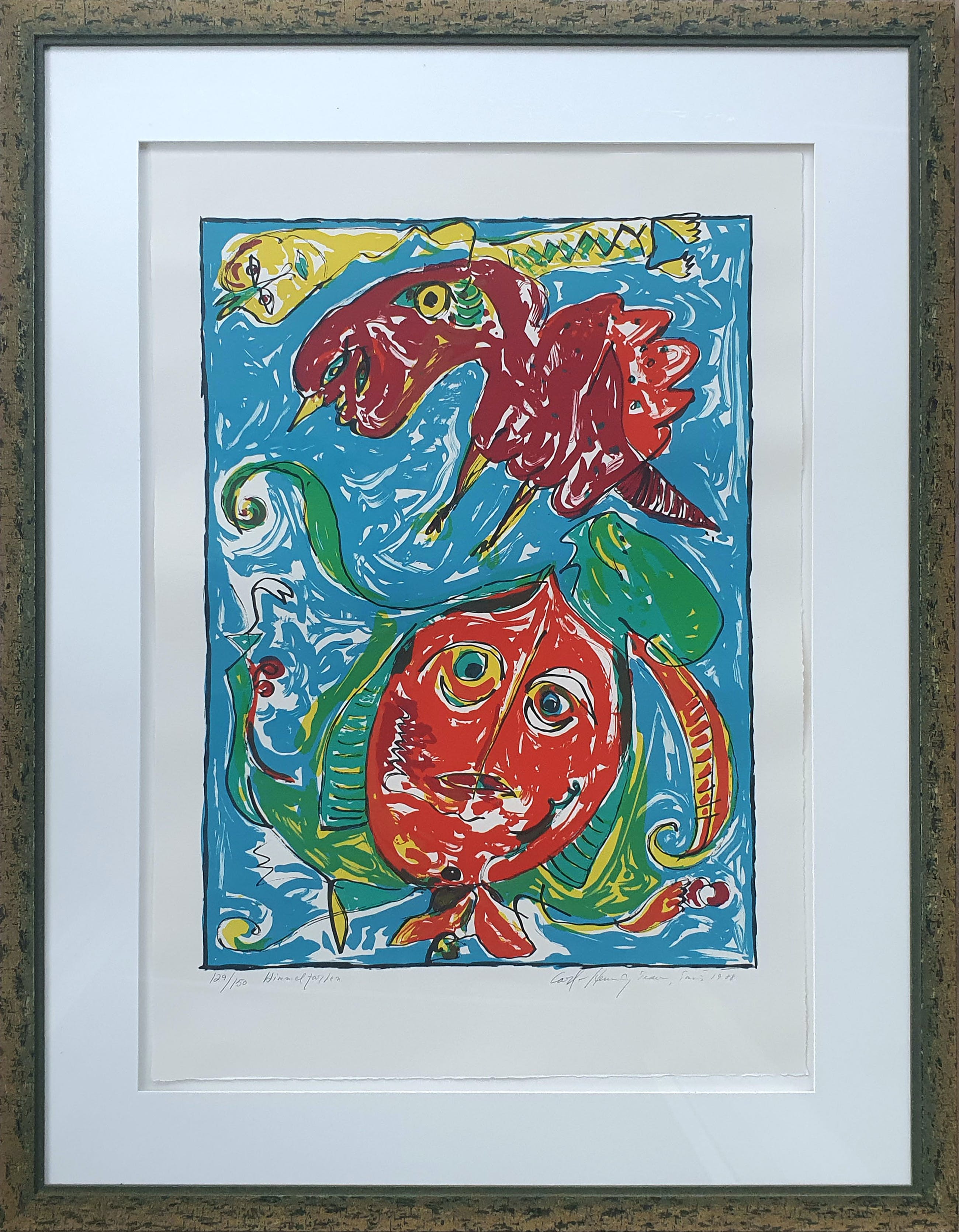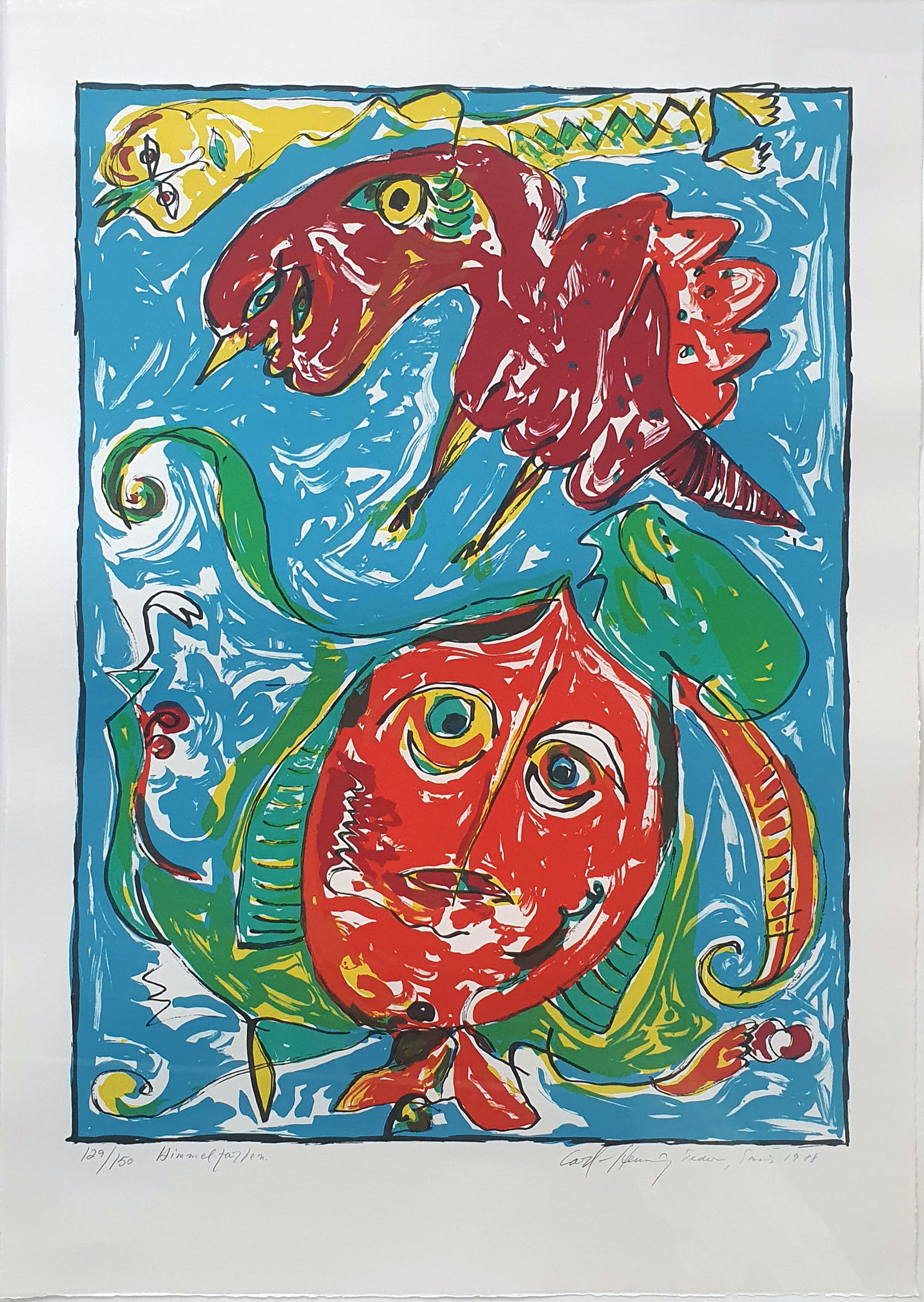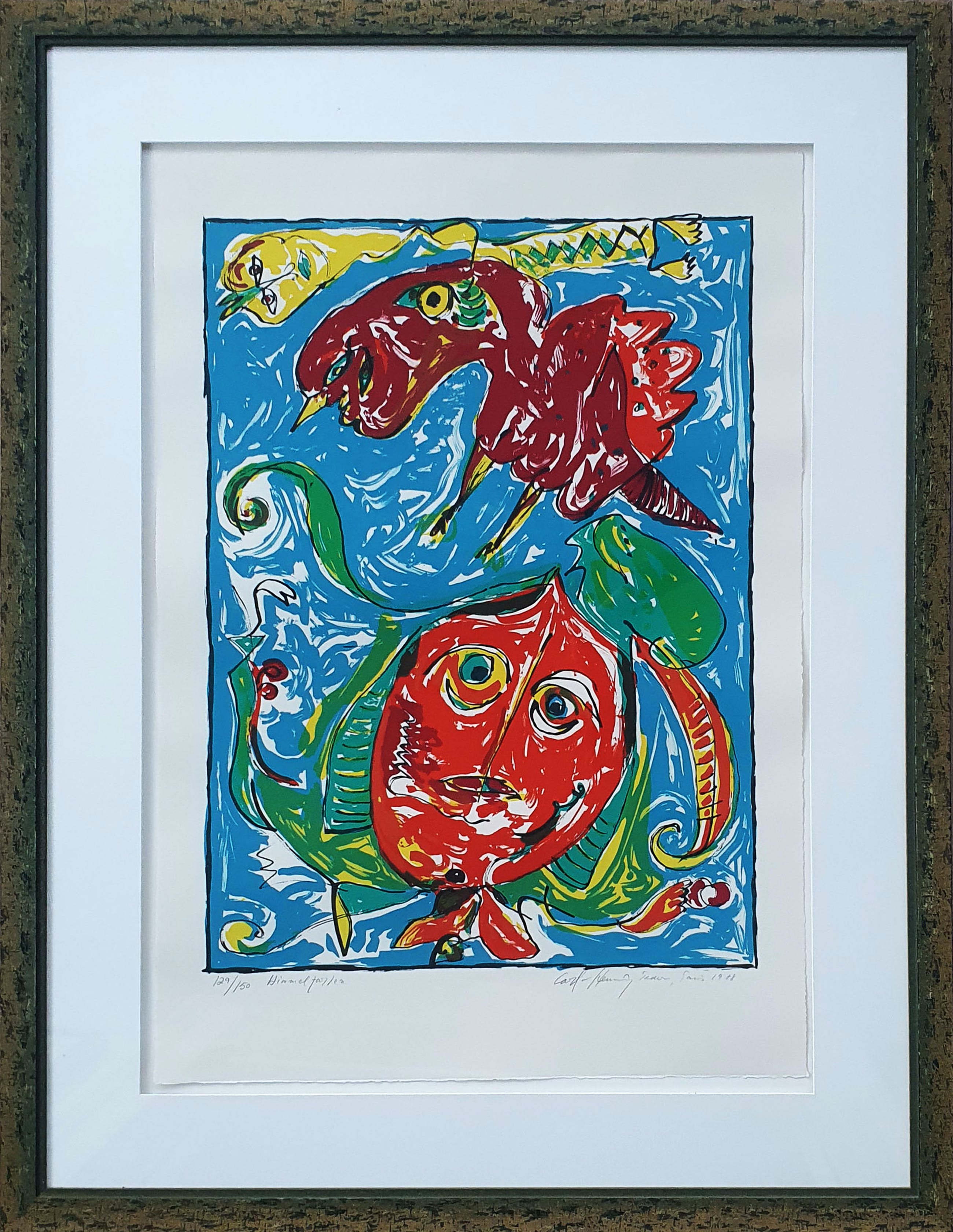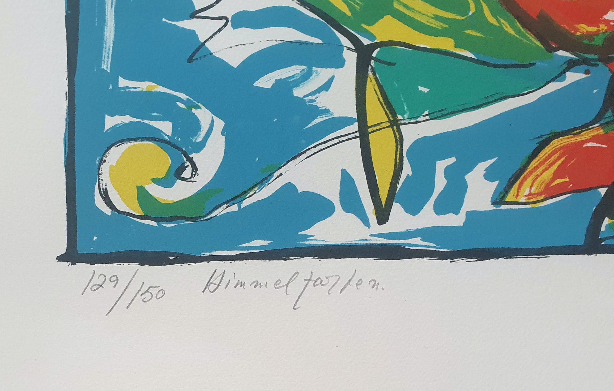 Litho van Carl-Henning Pedersen met de titel: 'Himmellasten' uit 1988. Het werk is rechtsonder met de hand gesigneerd door de kunstenaar.