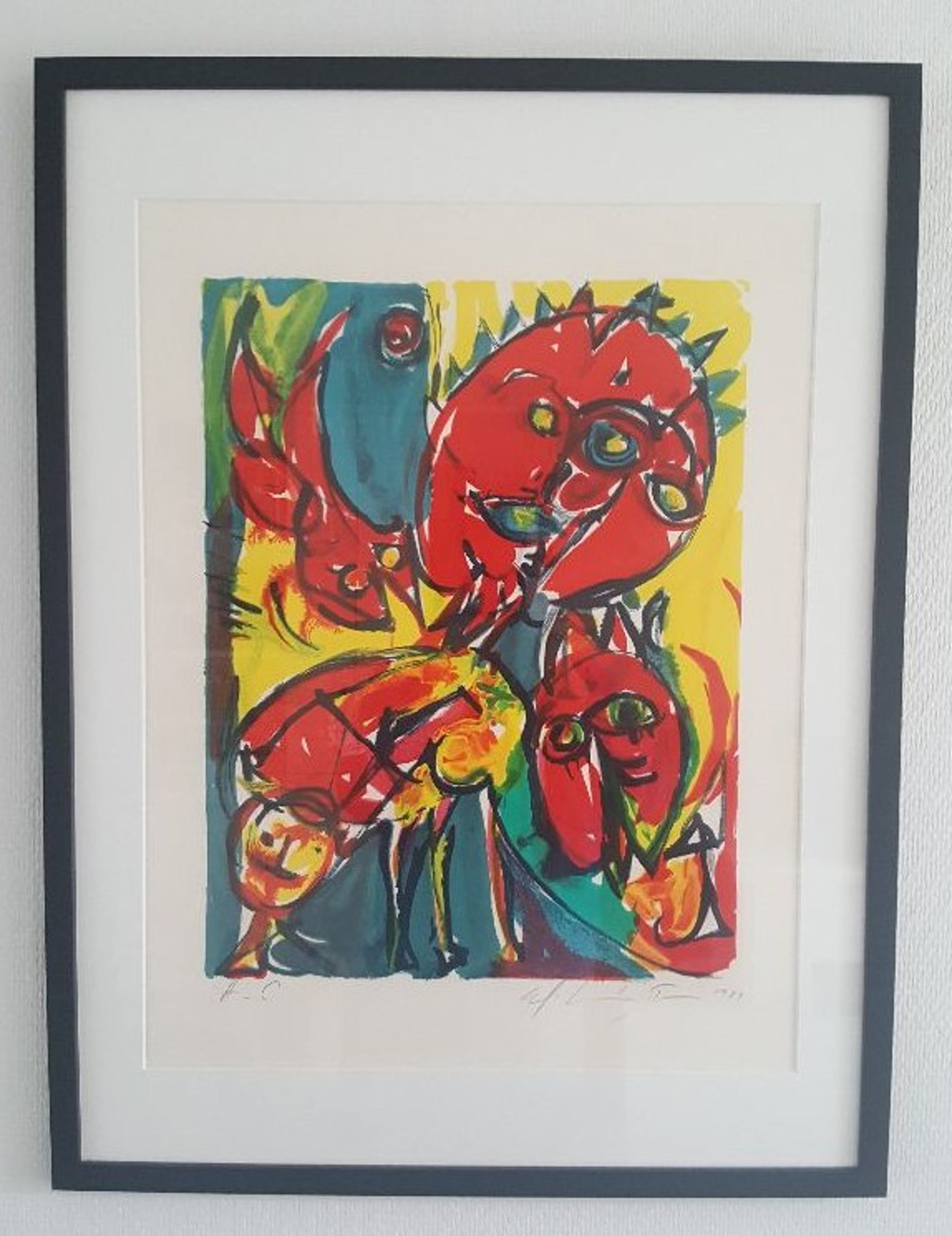 De litho heeft de felle originele kleuren, geen vlekken en is niet vergeeld. Het werk is nieuw en zuurvrij ingelijst. | |