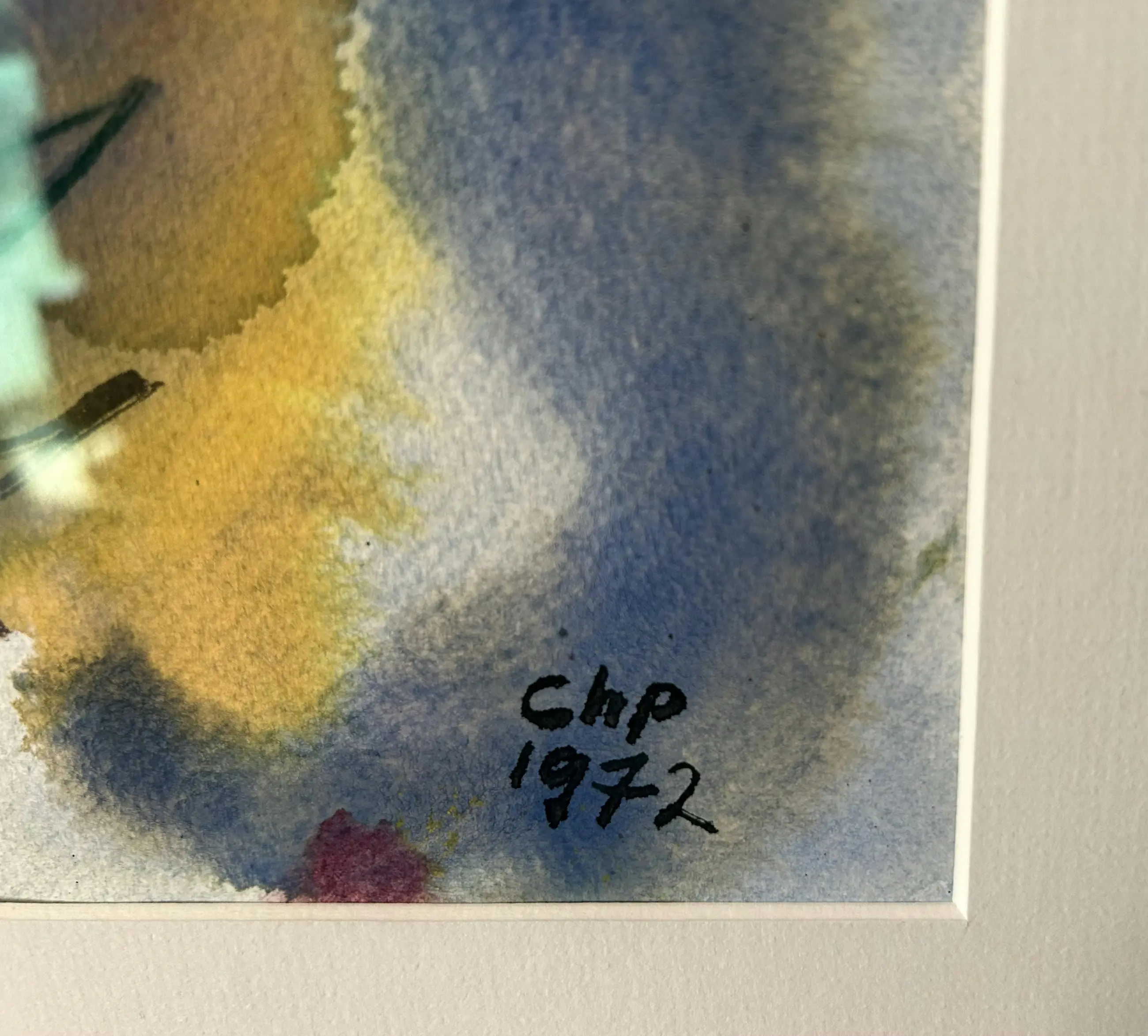 Zéér fraai ingelijst in houten lijst met passe partout achter Art Glass.
