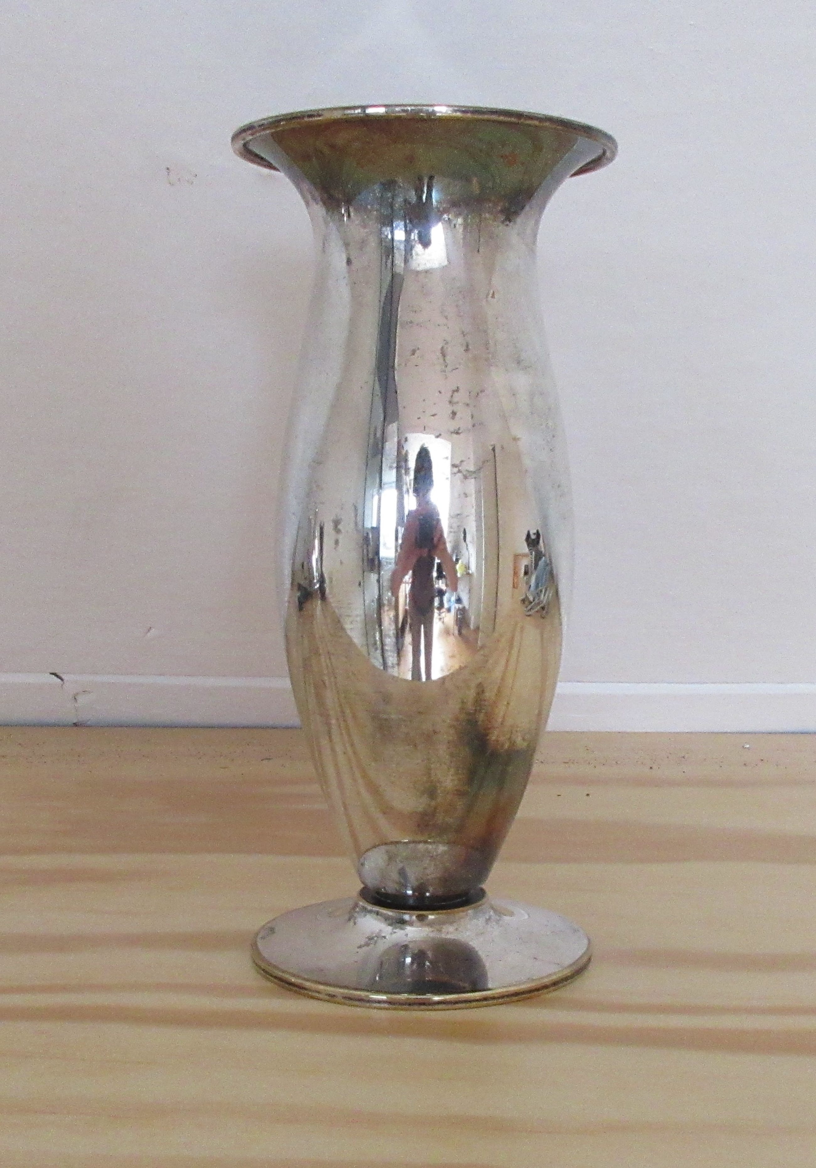 Bauhaus verzilverde vaas uit de ATLA serie uitvoering Carl M. Cohr. in prima conditie op de randen is er wat slijtage en komt het koper er doorheen. Voorzien van ingedrukte merken; ATLA, Arno Silver en made in Denmark