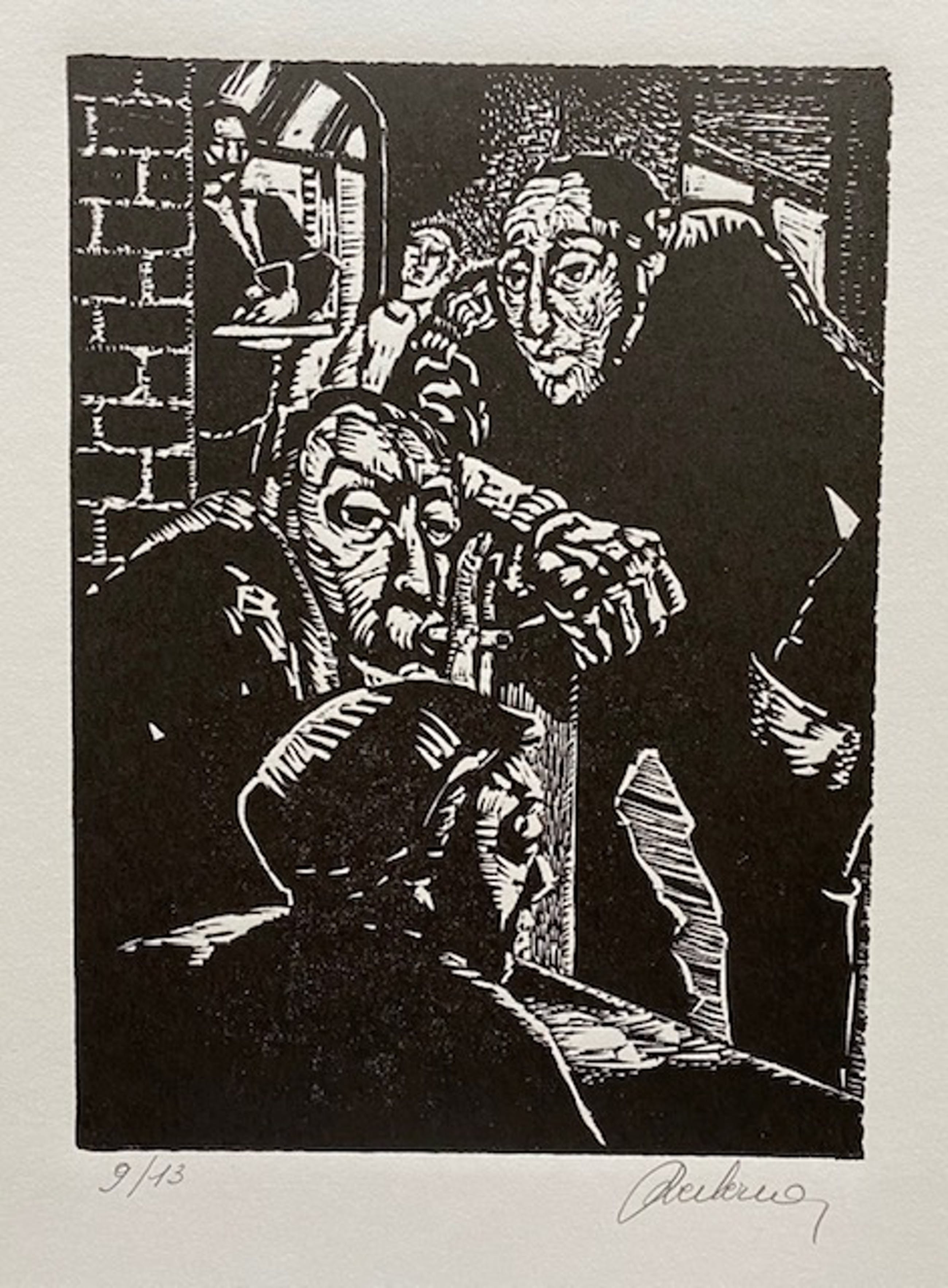Linosnede, caféscène van Carla Declercq Getekend rechts onderaan en genummerd 9/13