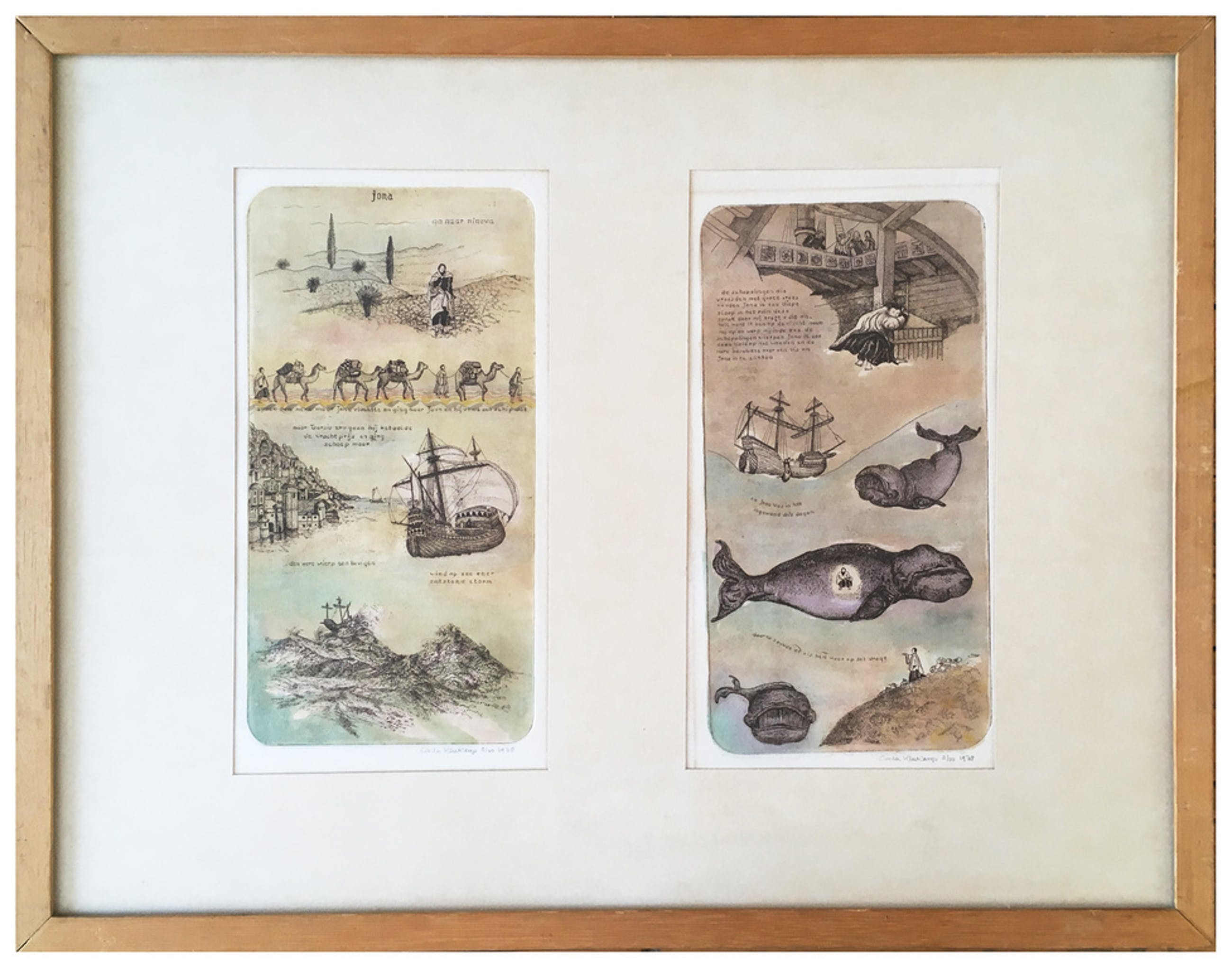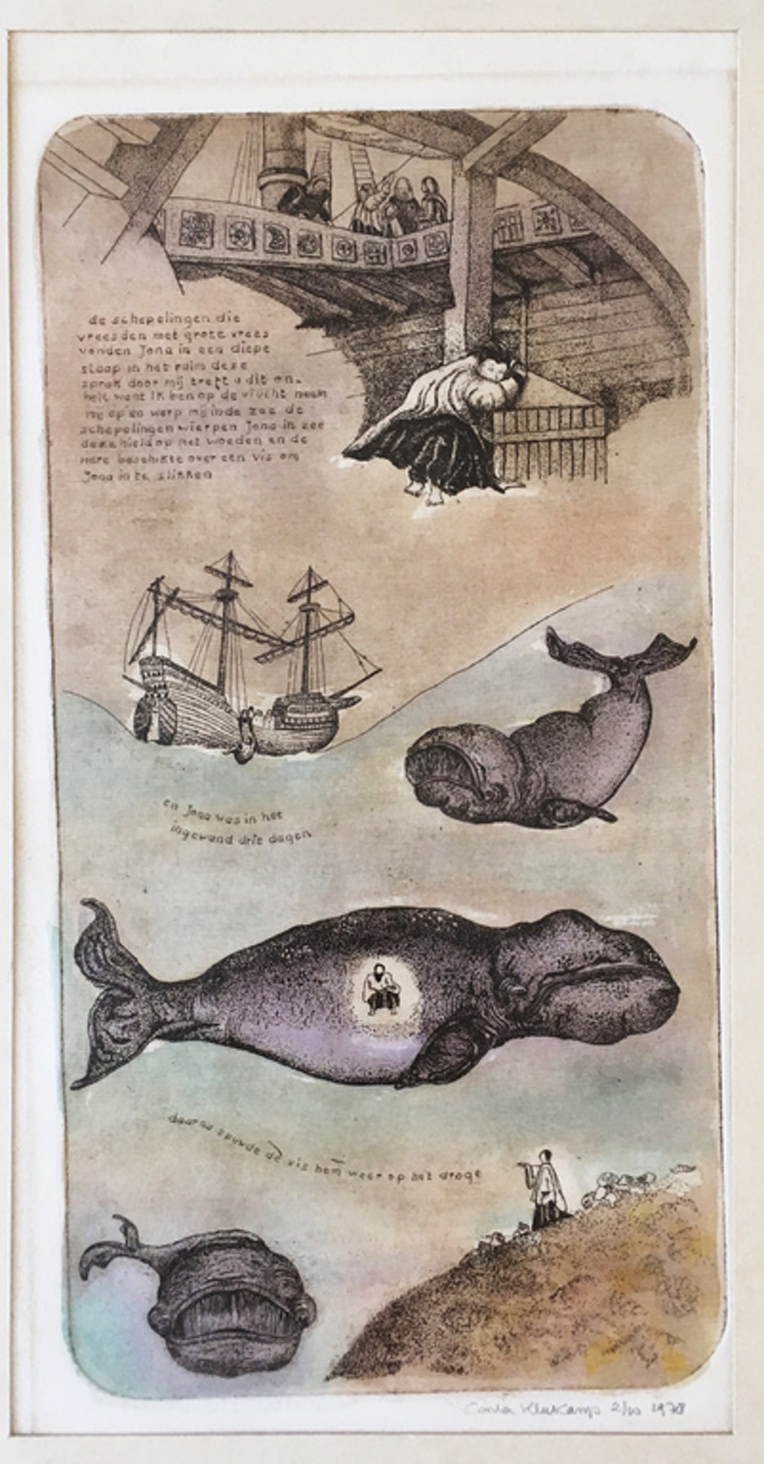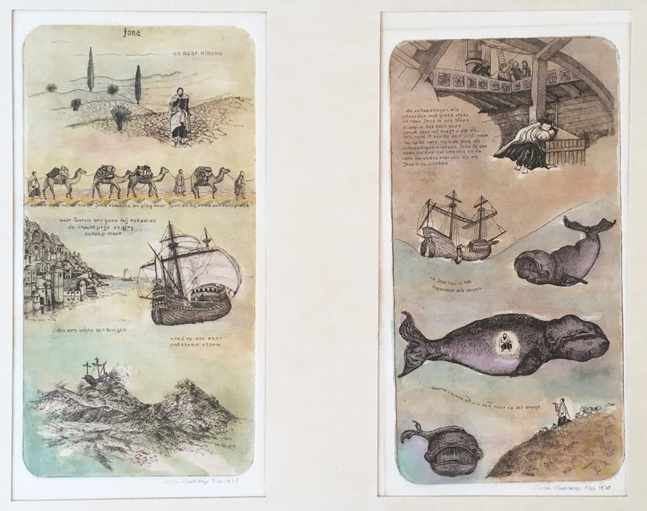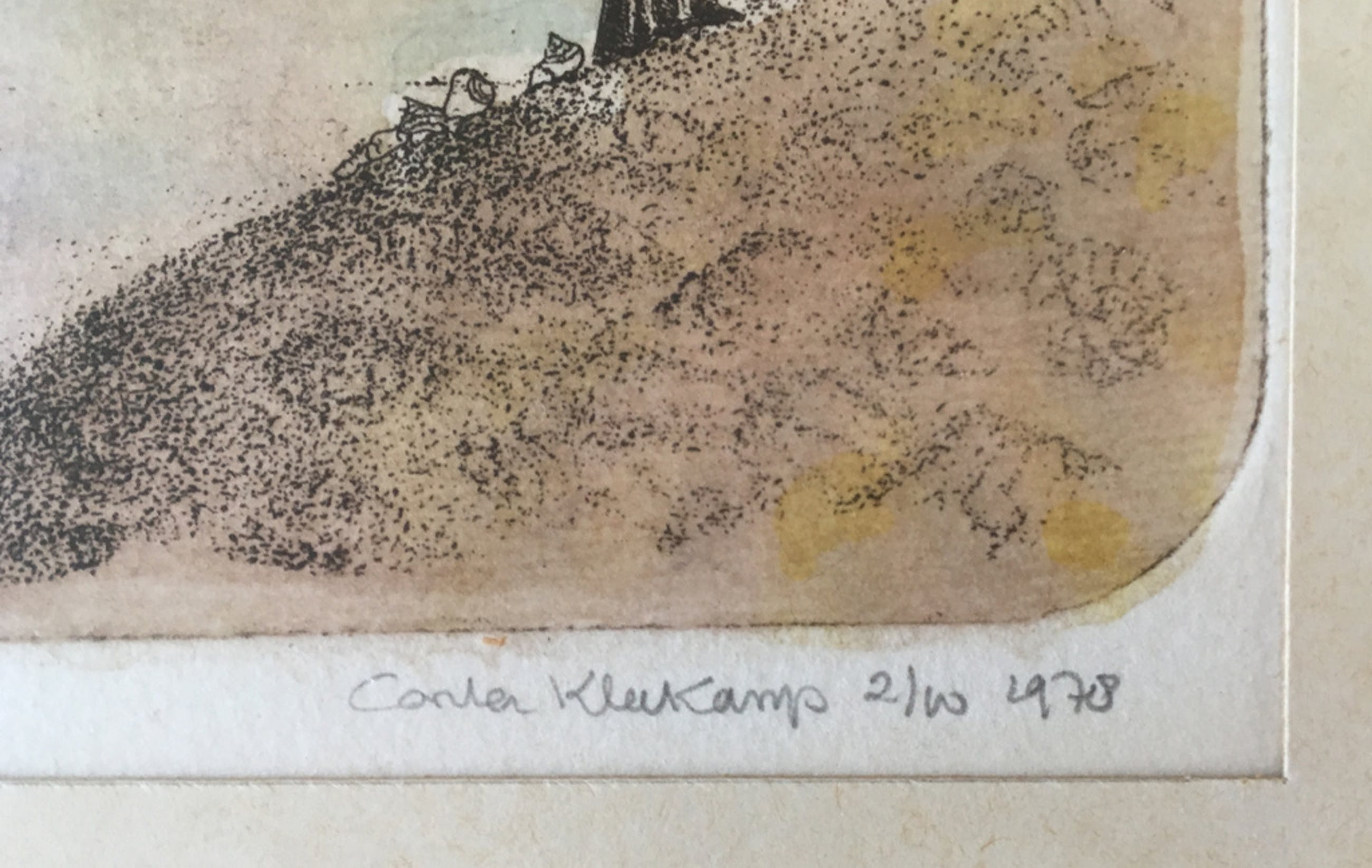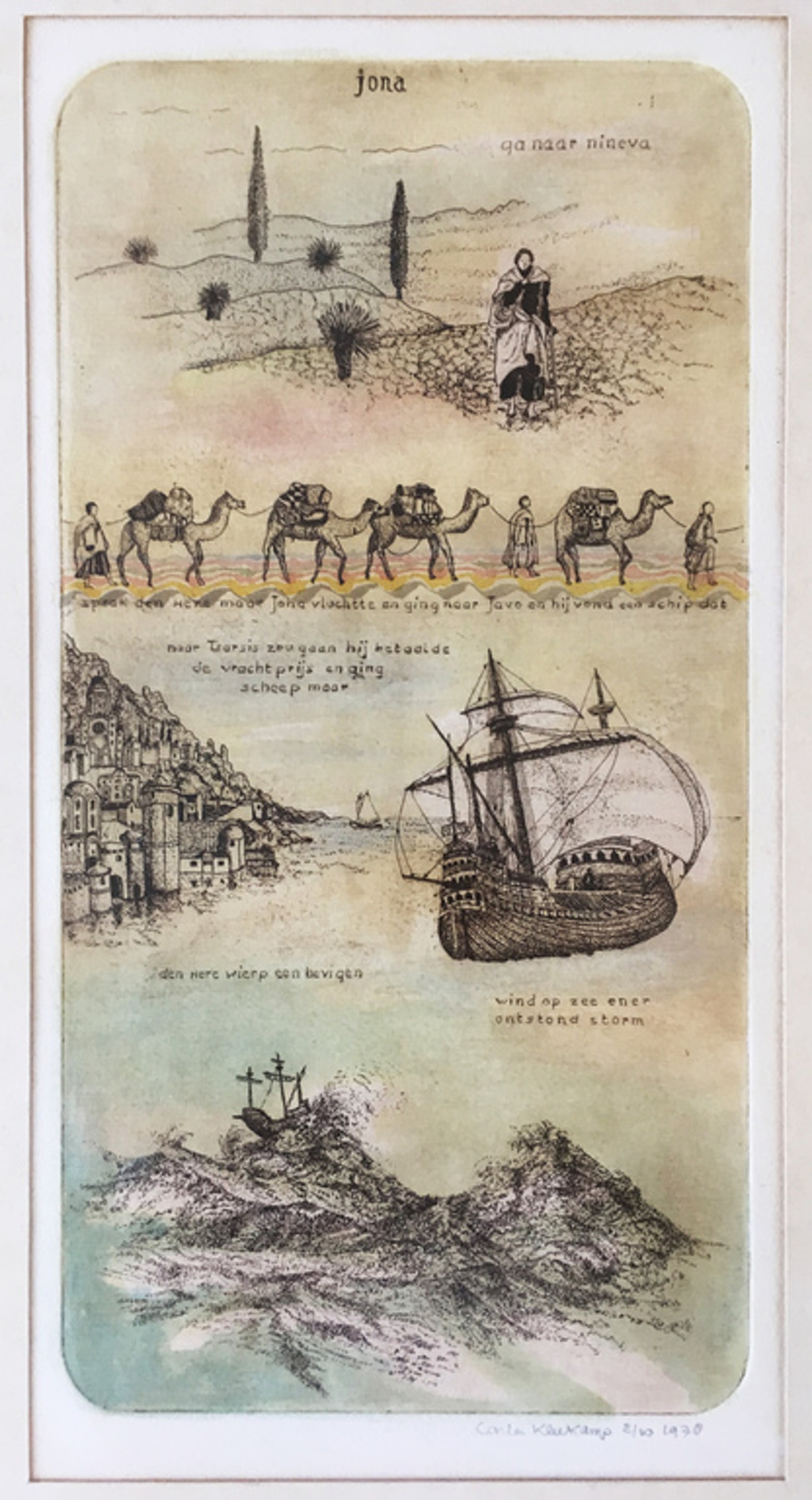 Mooi tweeluik, ingekleurde ets van Carla Kleekamp (Den Haag 1937).