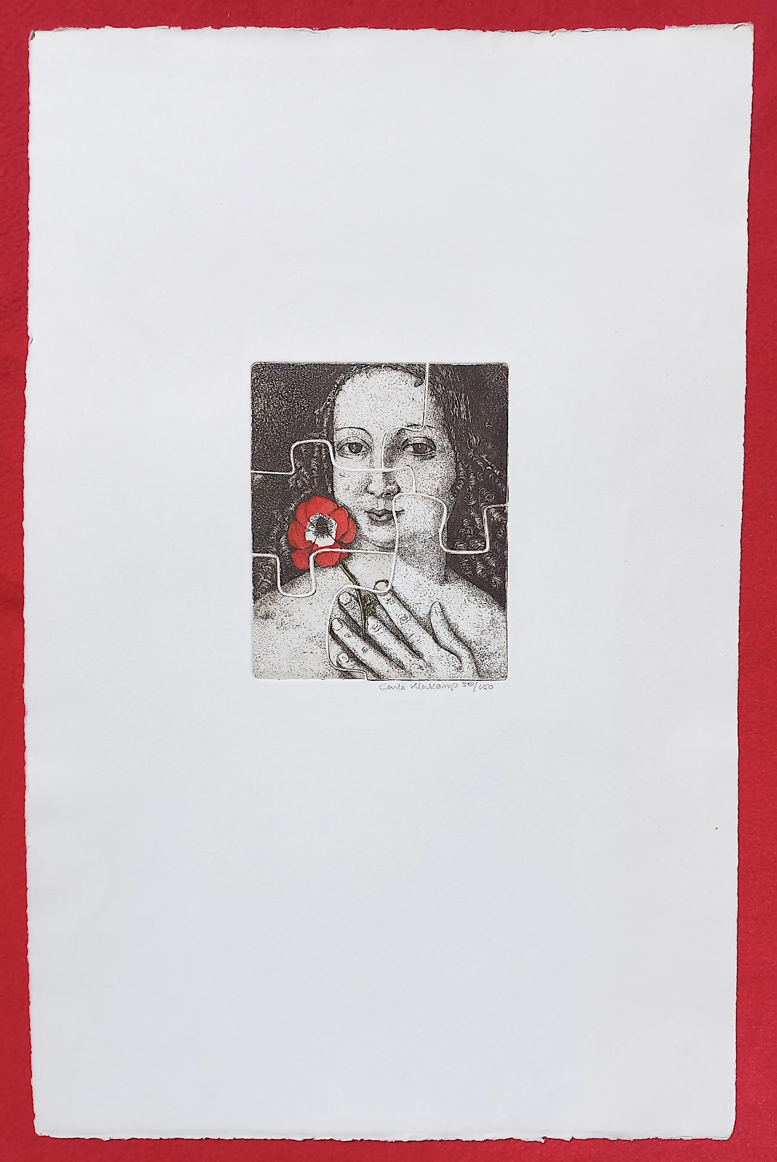 Leuke ets van Carla Kleekamp. Aquatint ets op papier, gedrukt van vijf platen, met potlood gesigneerd en genummerd (58/150). In zeer goede conditie.