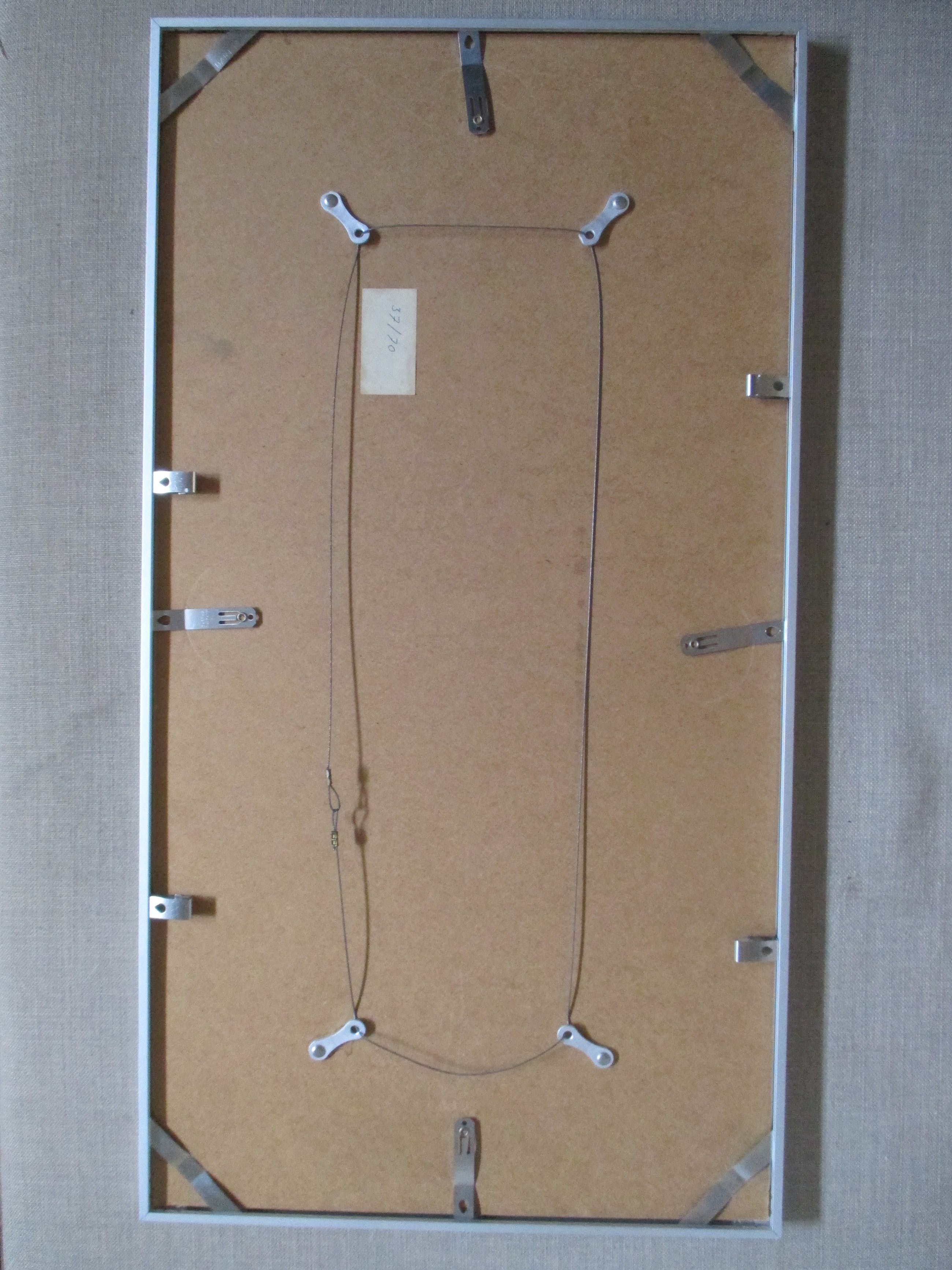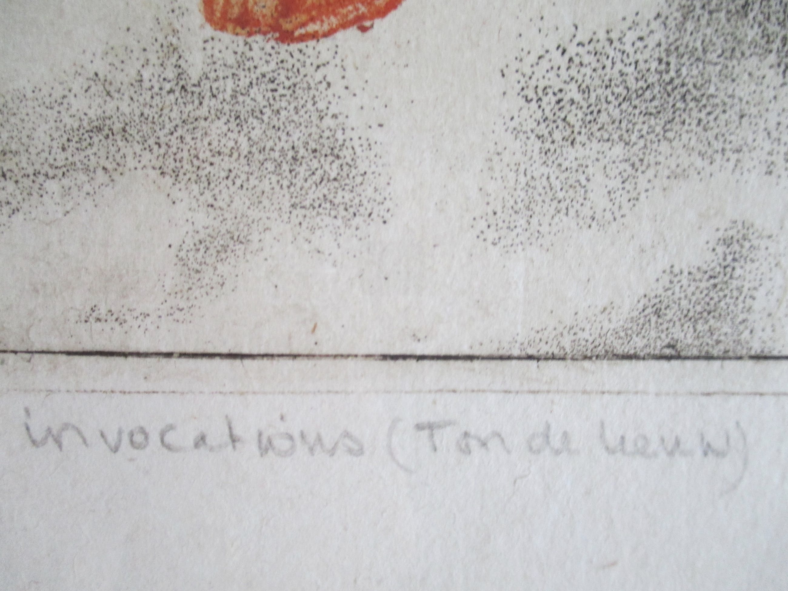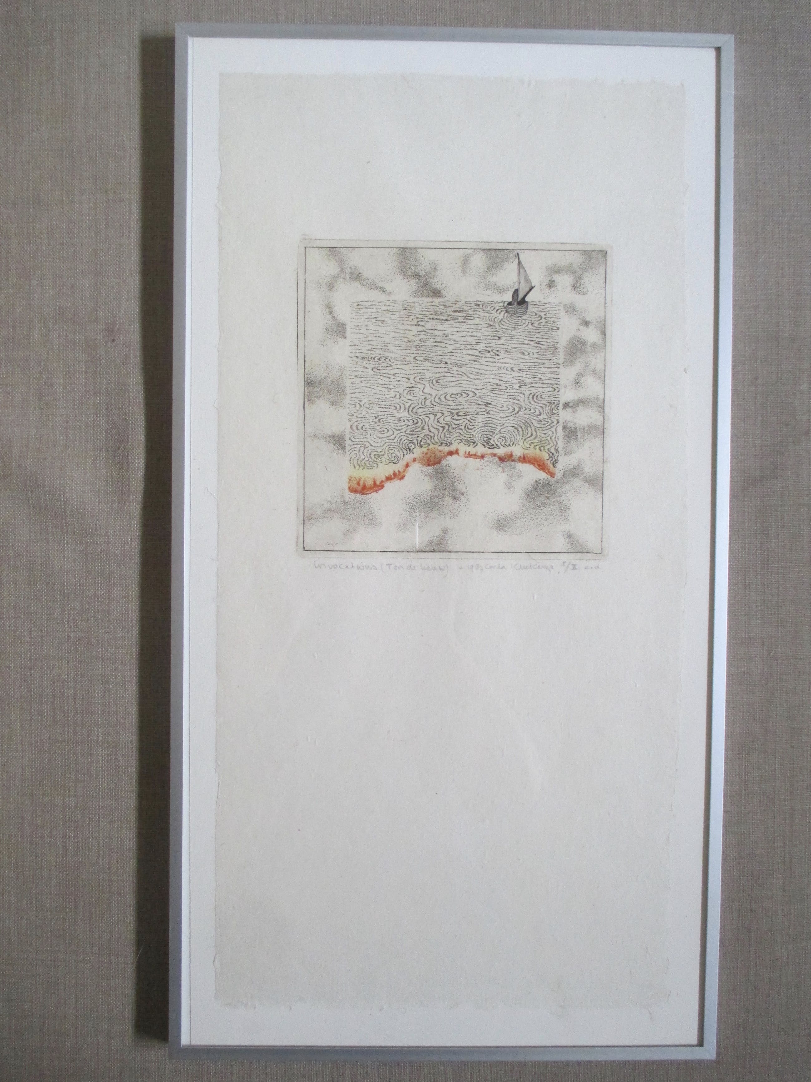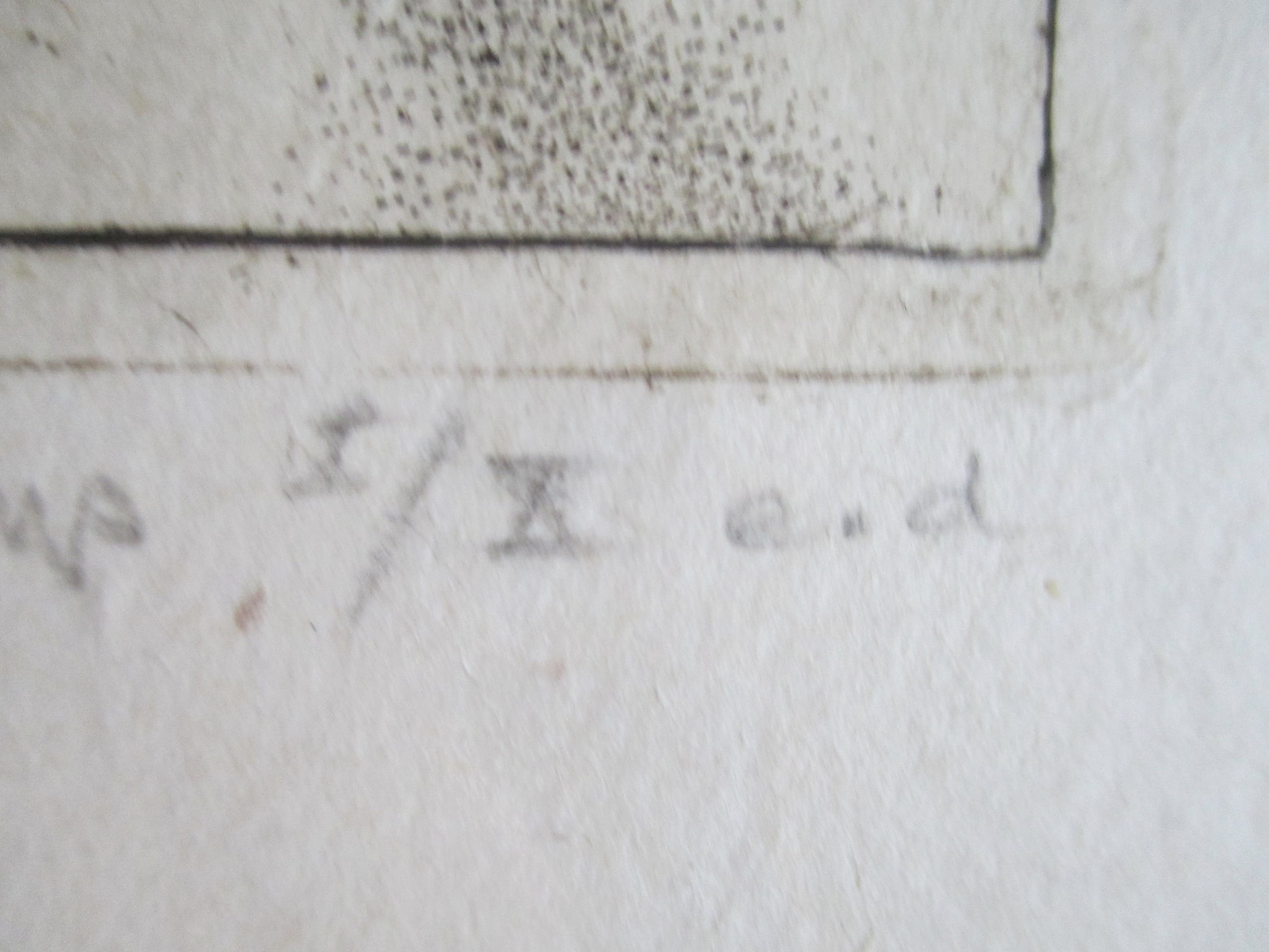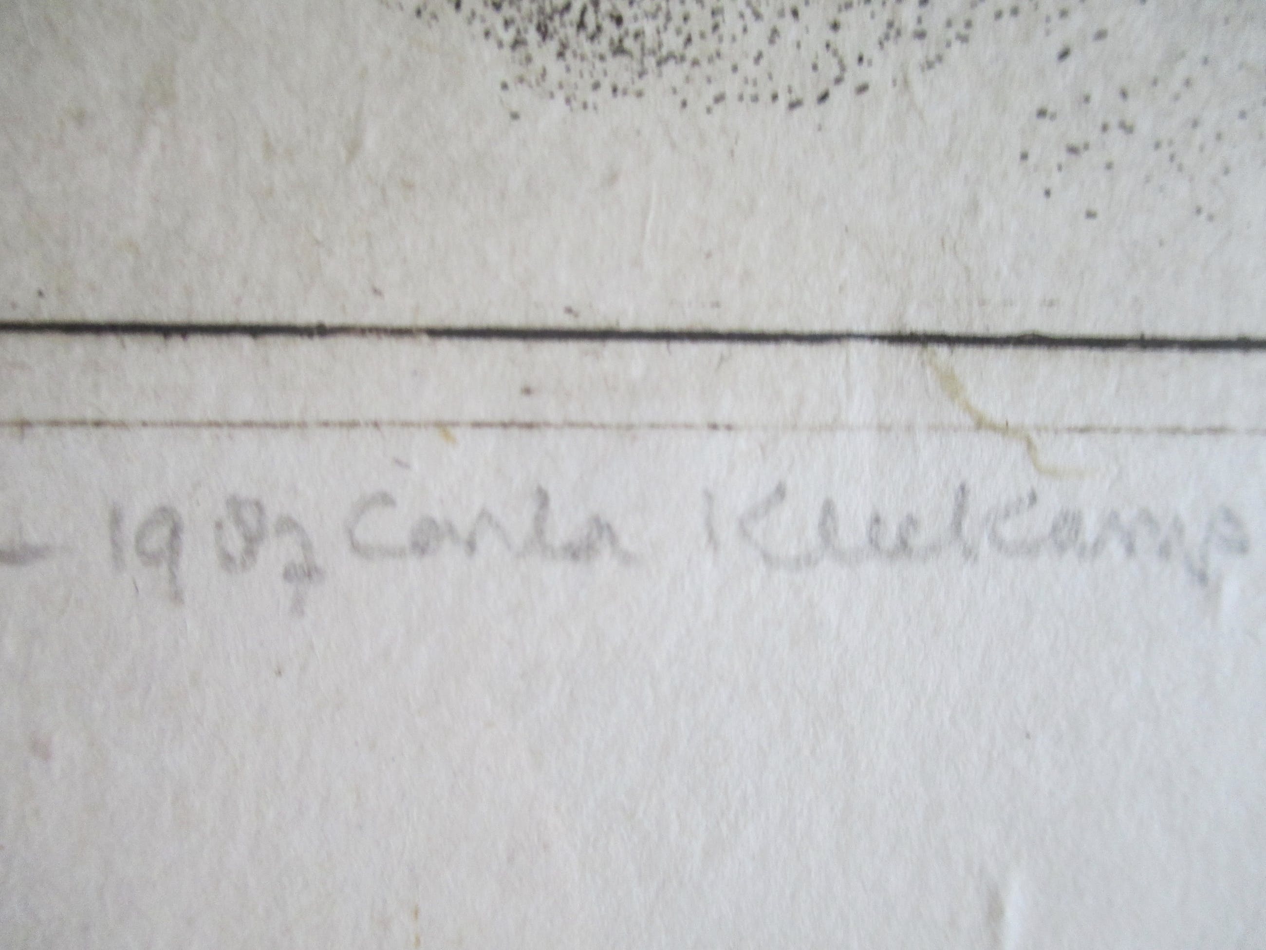 Ets van Carla Kleekamp, ingelijst achter glas in aluminium lijst. De ets is gedrukt op dun geschept papier, bevestigd op een dikker blad.