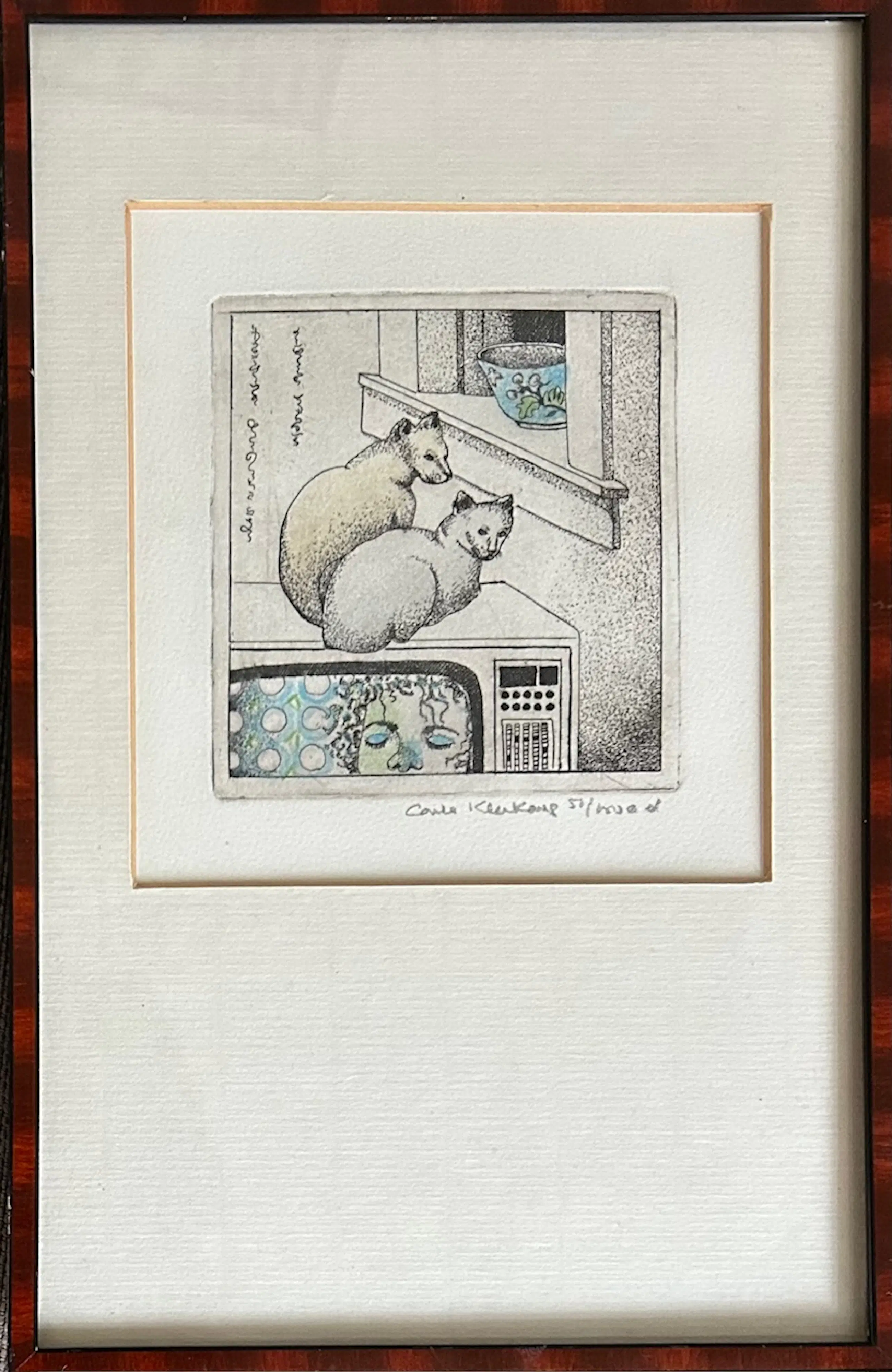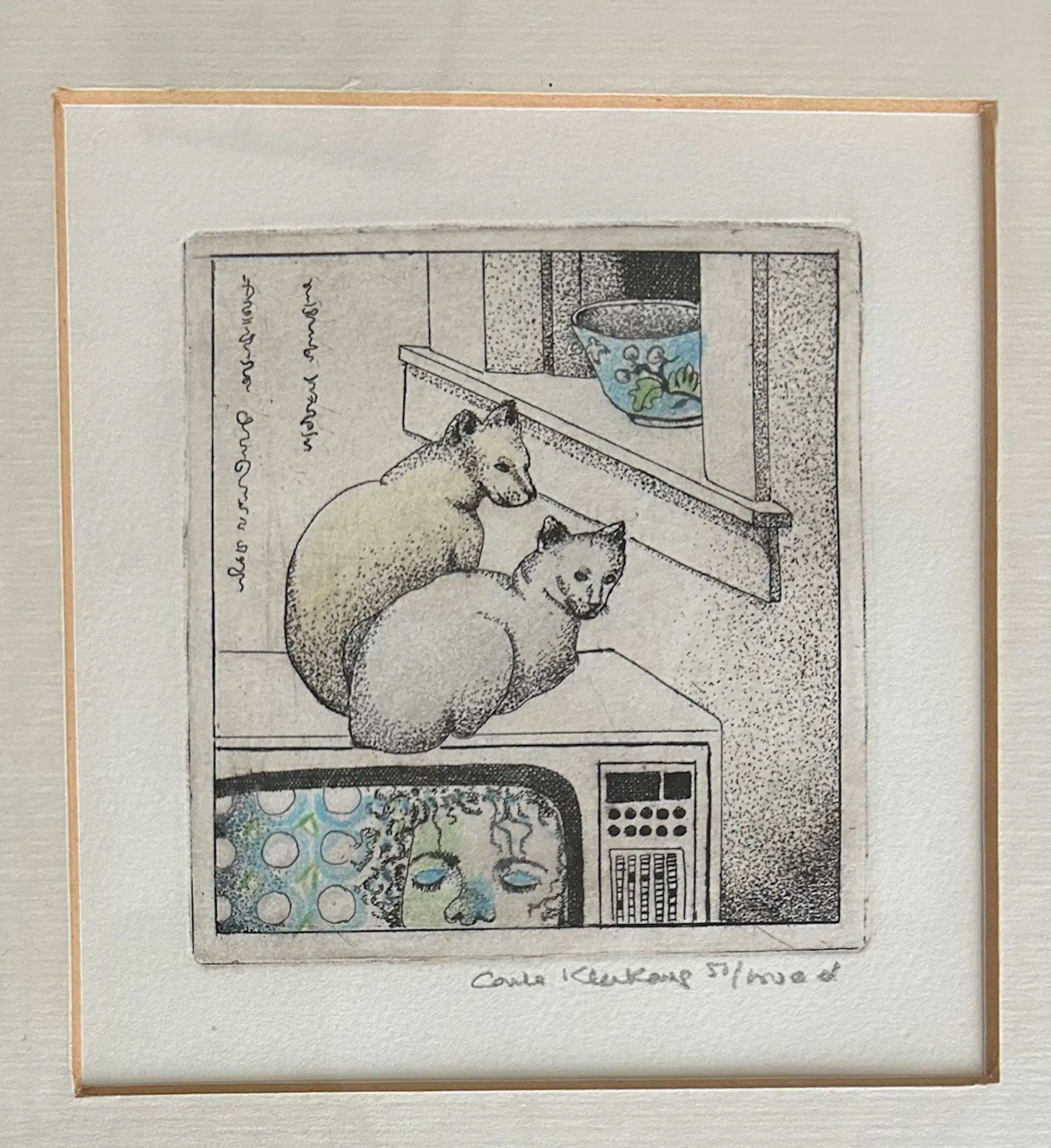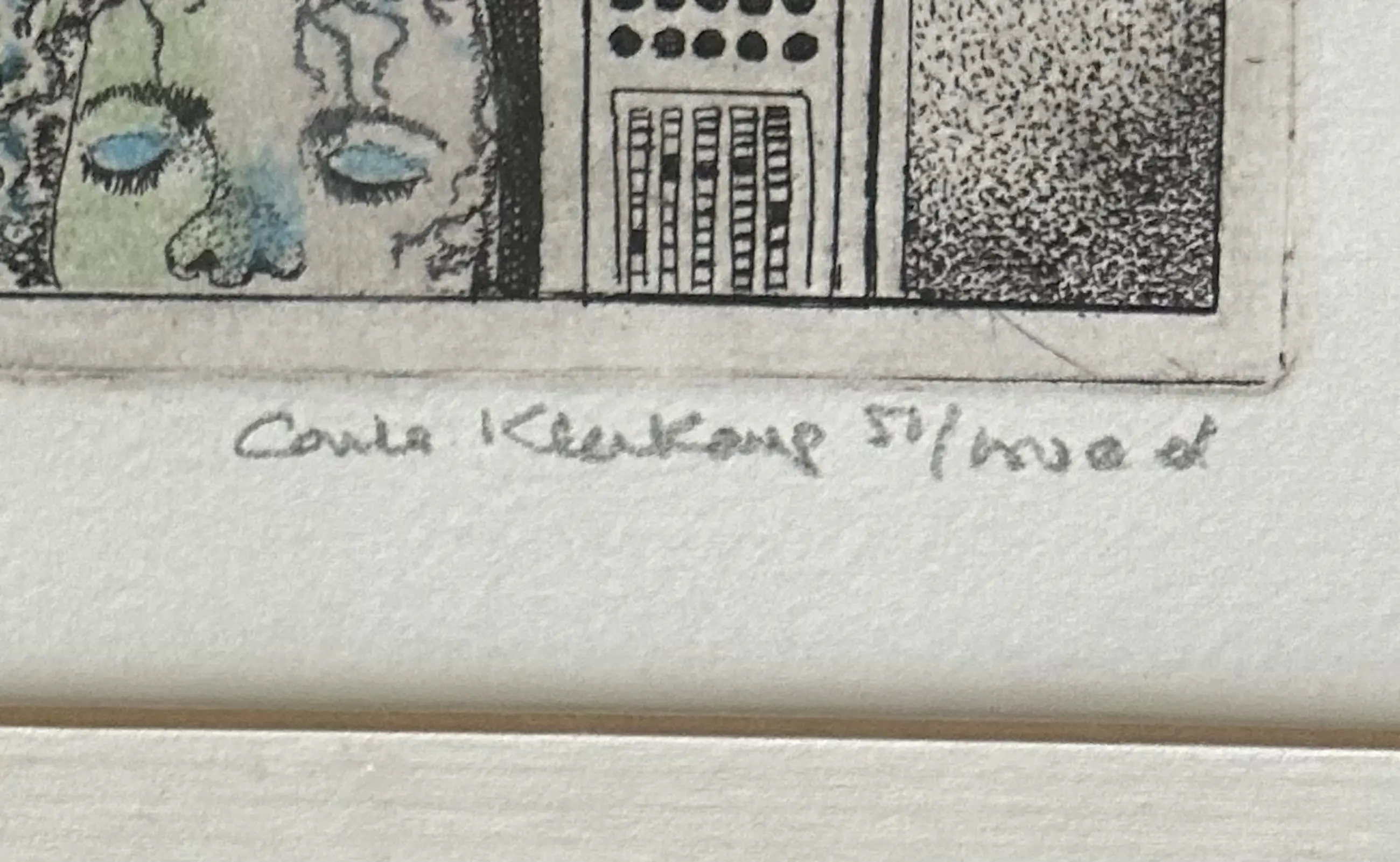 Ets, ingekleurd, van Carla Kleekamp. Omstreeks 1980. Gesigneerd en genummerd. Eigen druk. Zie foto's.