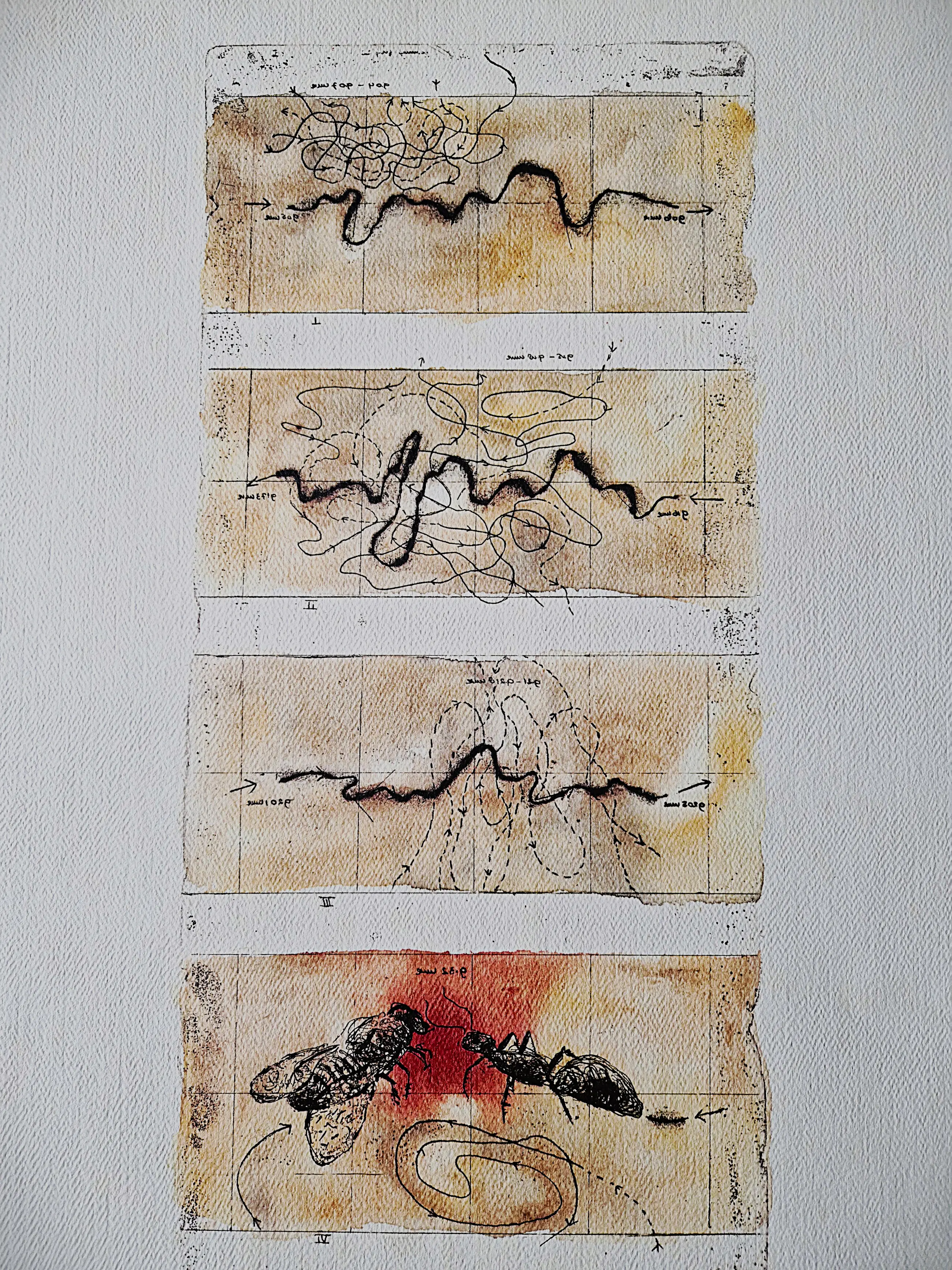 Mijn werk bestaat vooral uit etsen, collages, aquarellen en tekeningen.