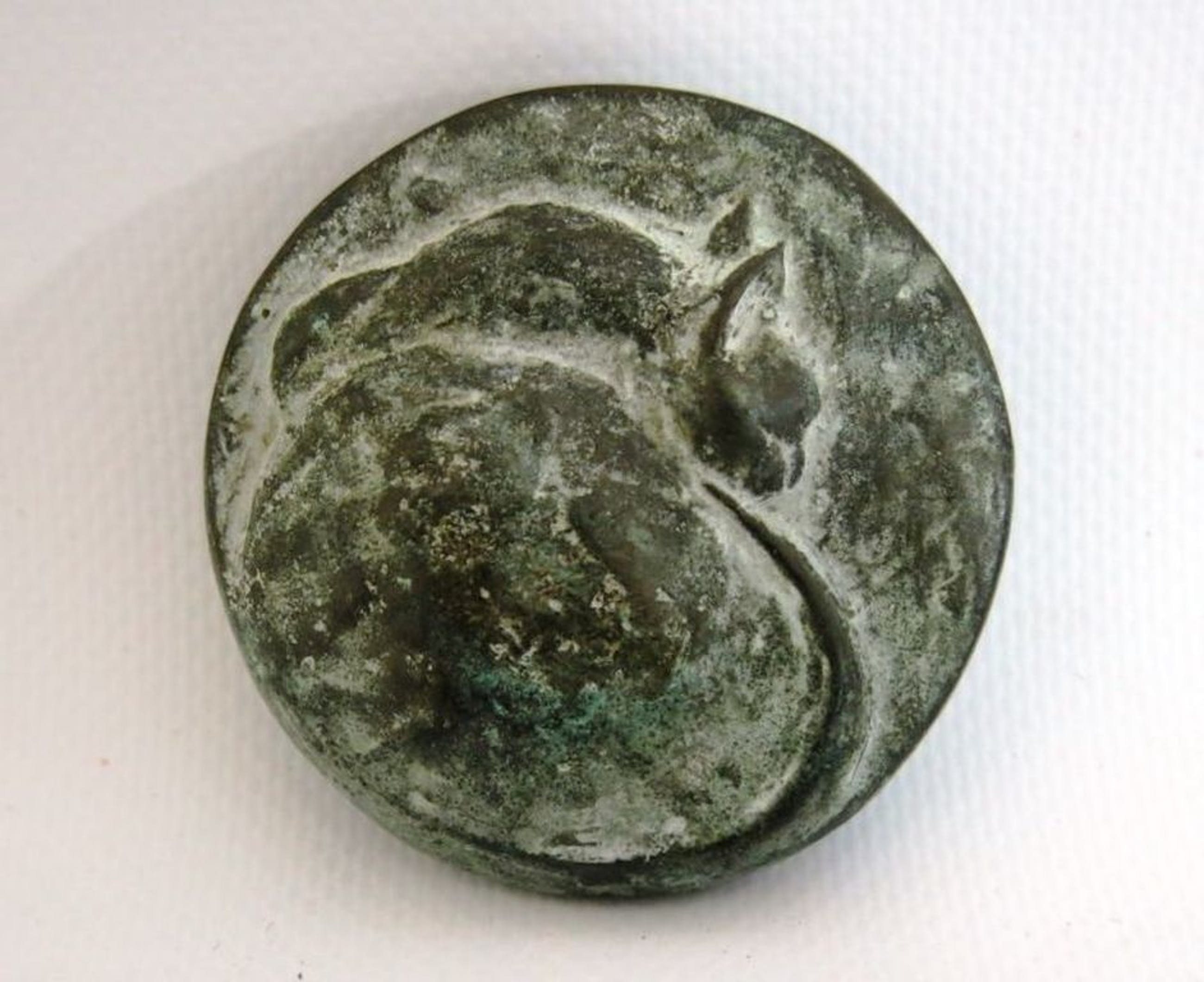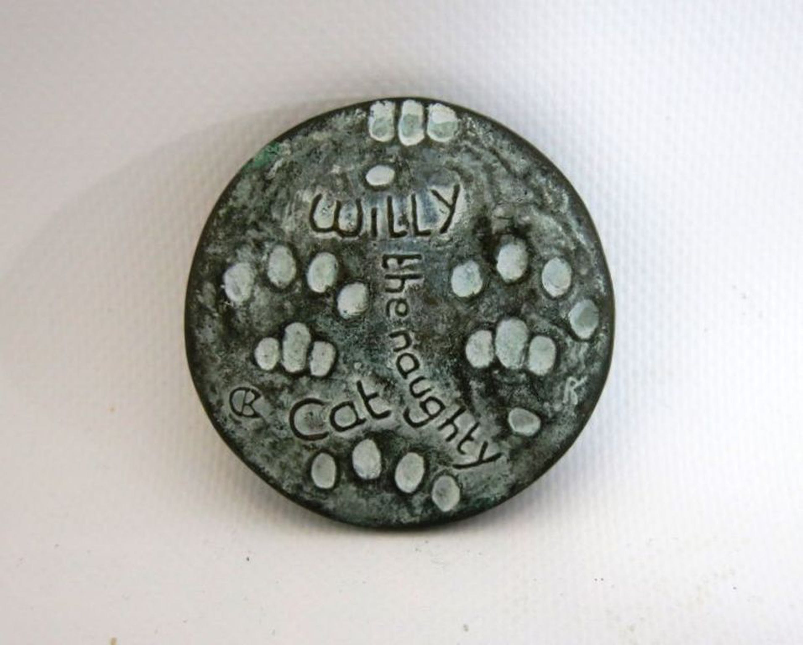 Mooie penning van medailleur Carla Klein, met op de voozijde een slapende kat en op de achterzijde de tekst 'Willy the naughty cat' en poot afdrukken. Met ook op de achterzijde het vignet van de vereniging en de initialen van de ontwerpster. Uitvoering door Bronsgieterij Steylaert te Rumpt.