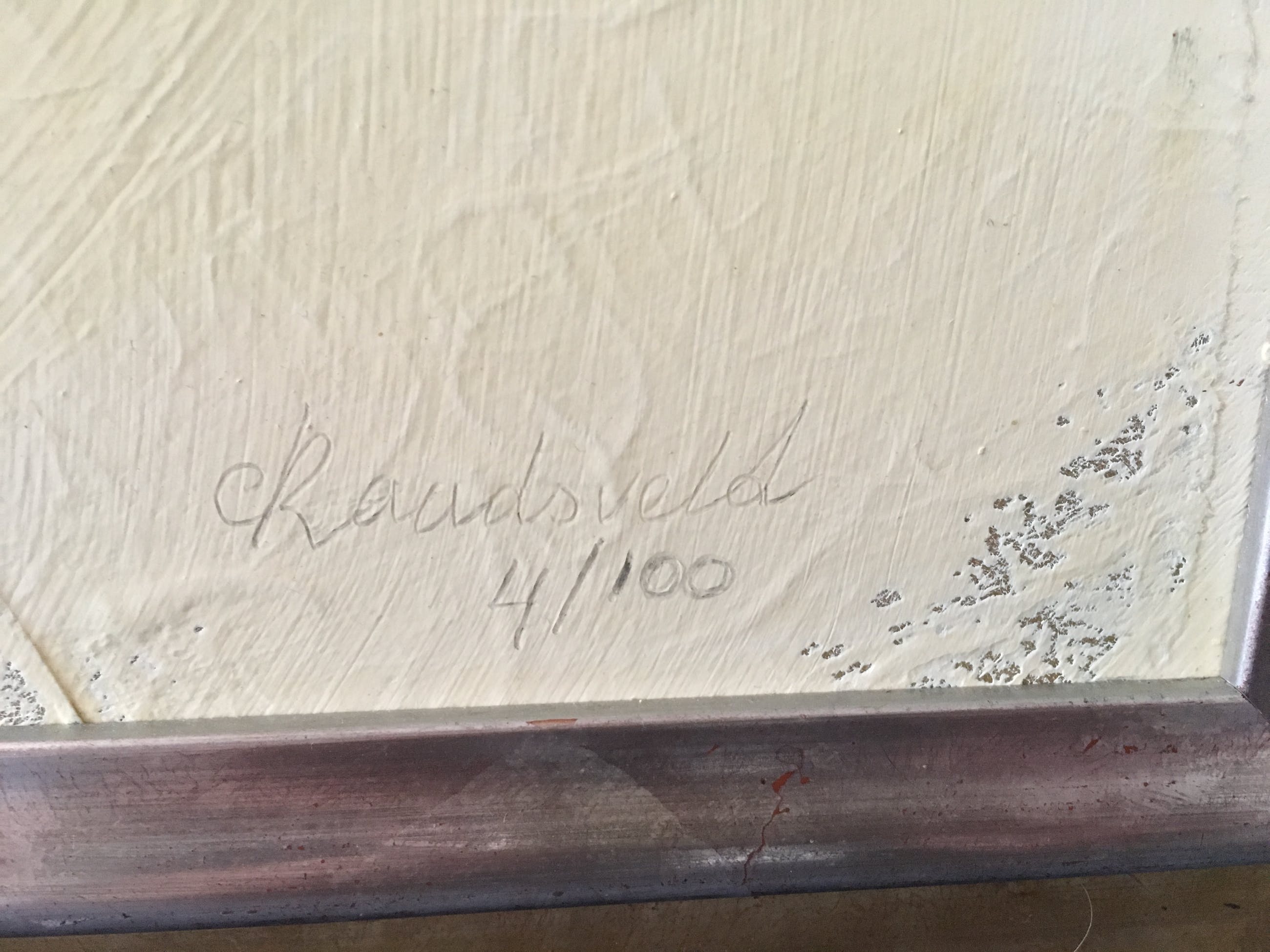 Moderne kunst van Carla Raadsveld, Bar 1, in een mooie lijst en gesigneerd, in uitstekende staat. Afmertingen 120 x 65 cm