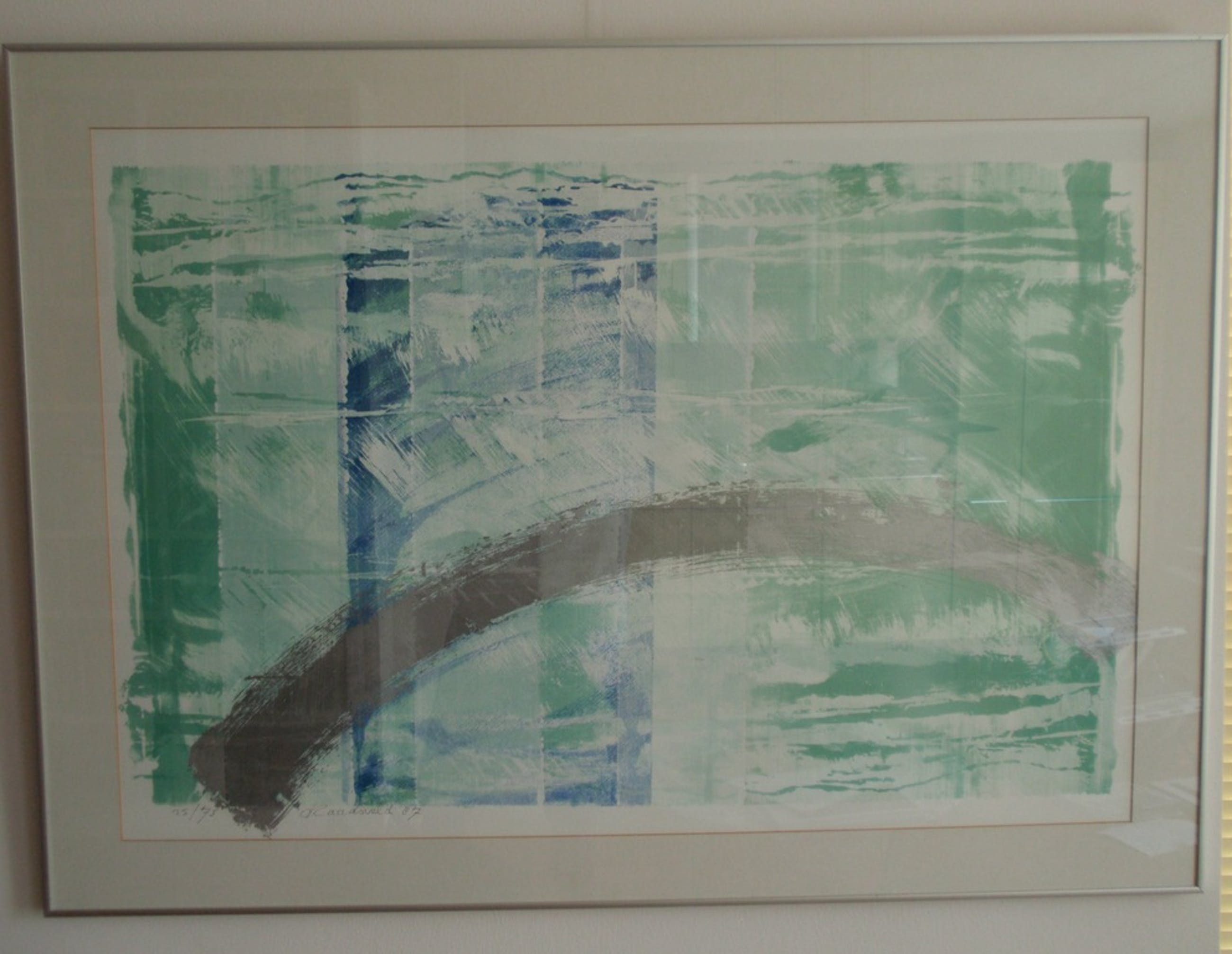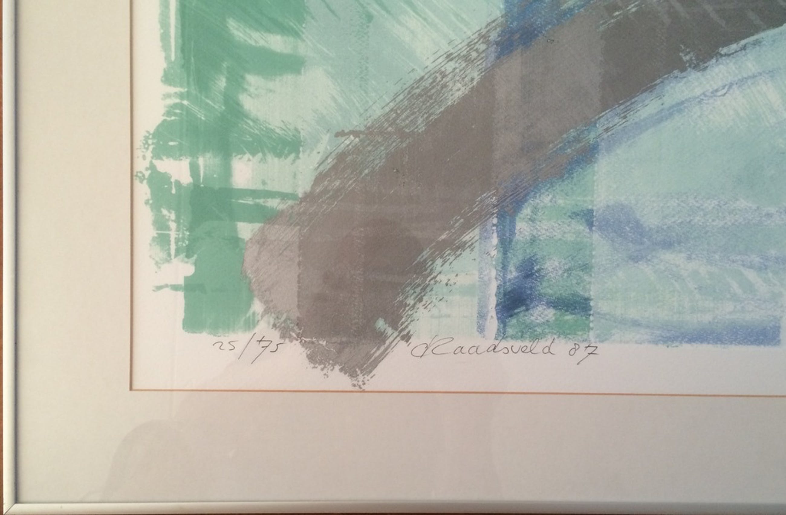Rustgevende zeefdruk van Carla Raadsveld gemaakt in 1987, die met potlood gesigneerd, gedateerd en genummerd is.