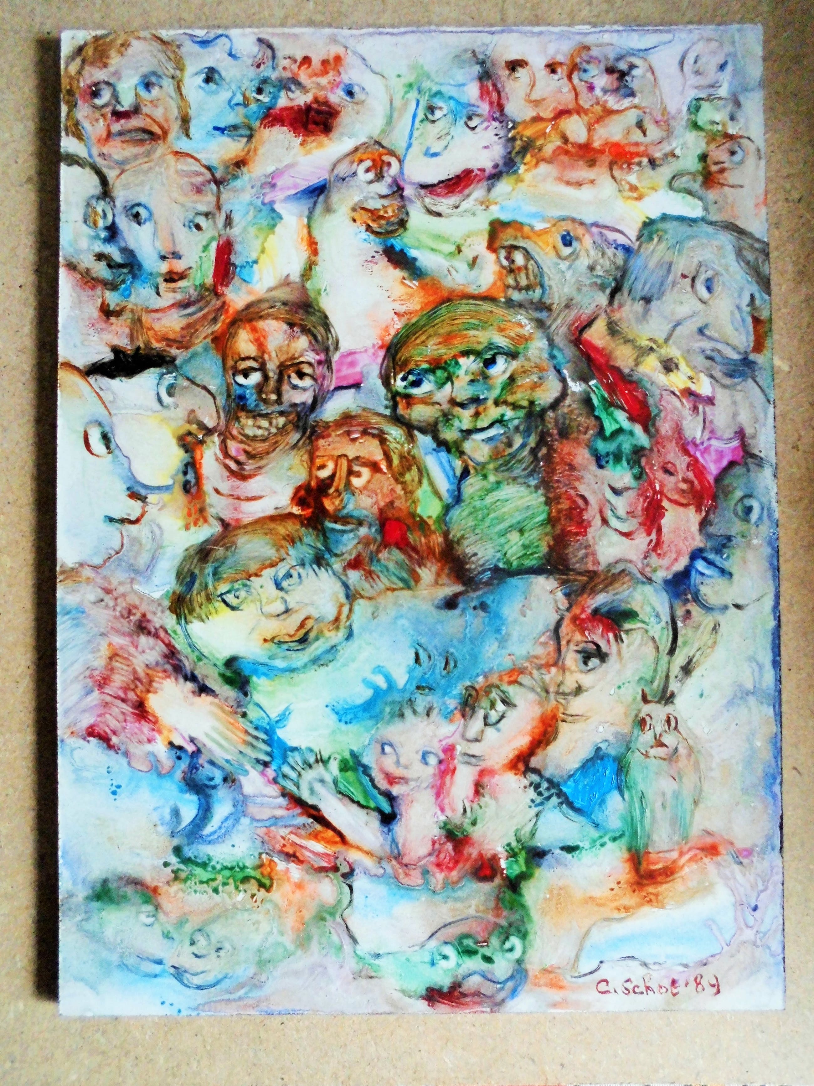 zaligheid en verschrikking, met bizarre fantasieen, een wereld van gezichten met soms