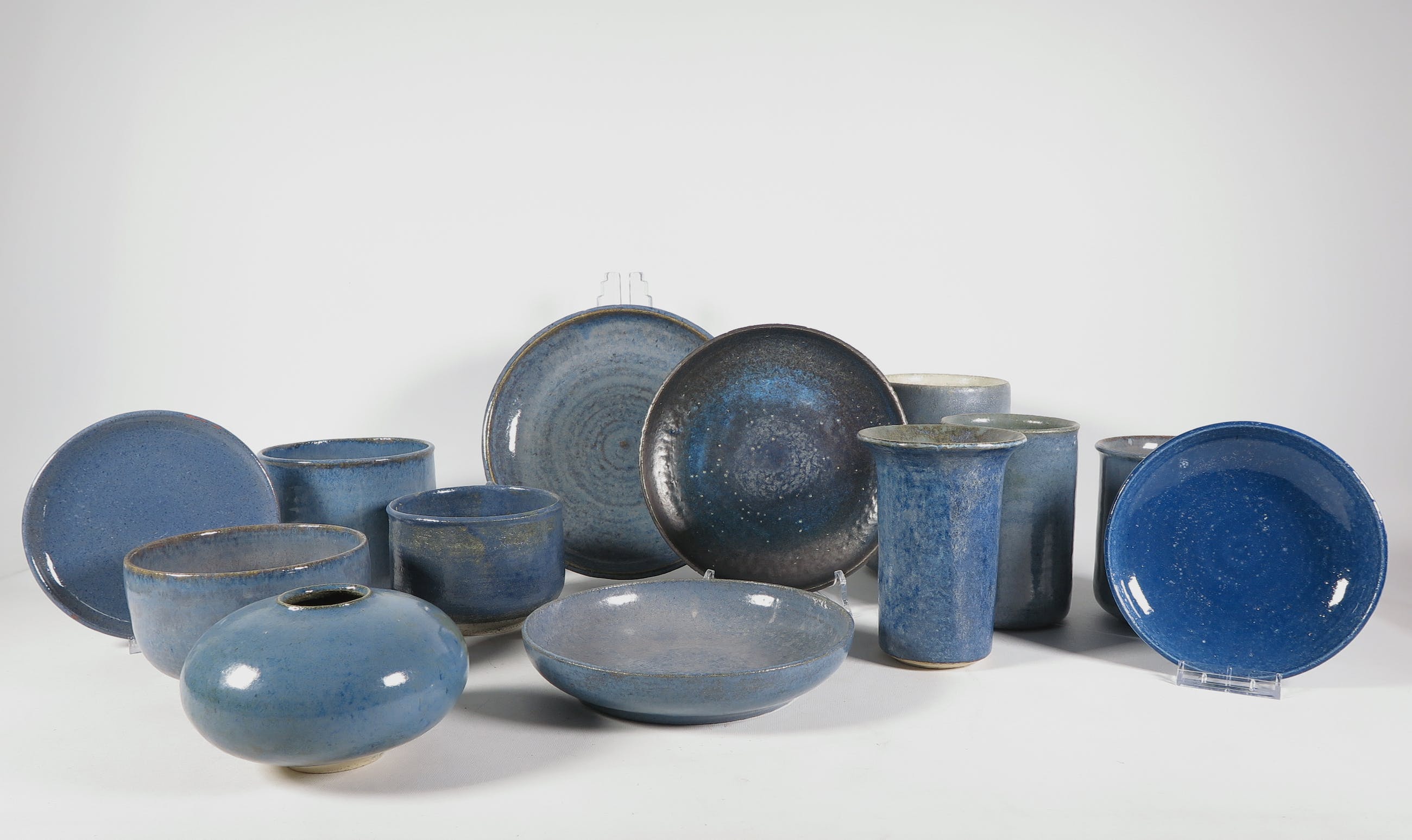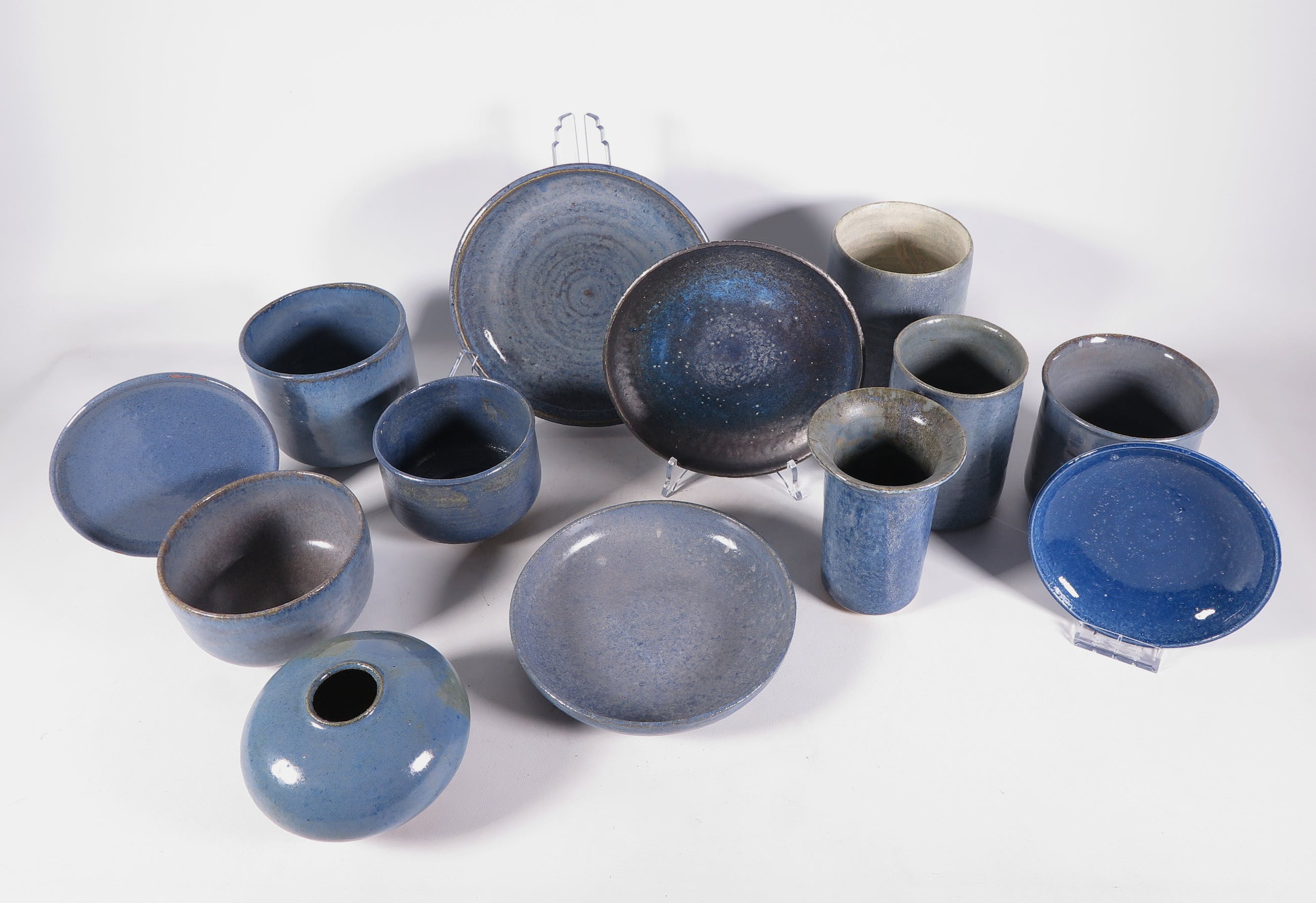 Lot van 13 blauw geglazuurde schalen, vazen en borden. Sommige objecten zijn met de hand gesigneerd en gedateerd. Dus niet allemaal.
