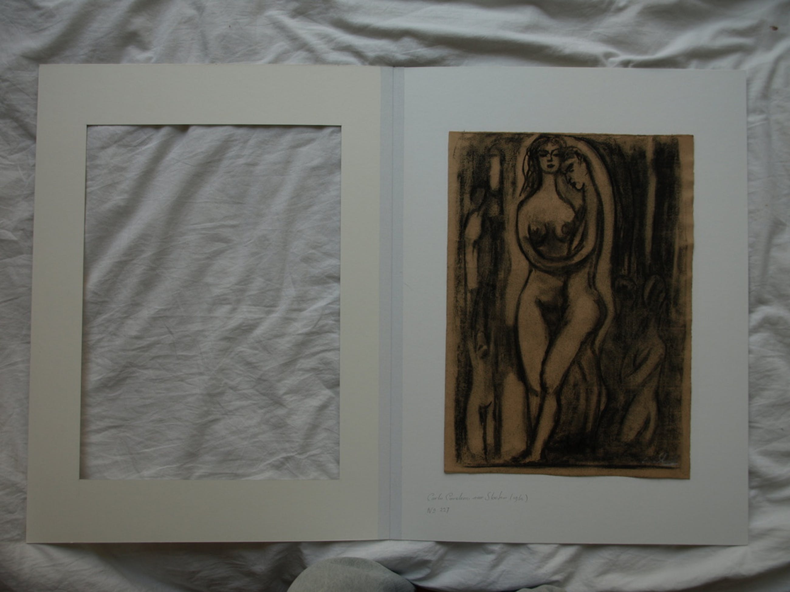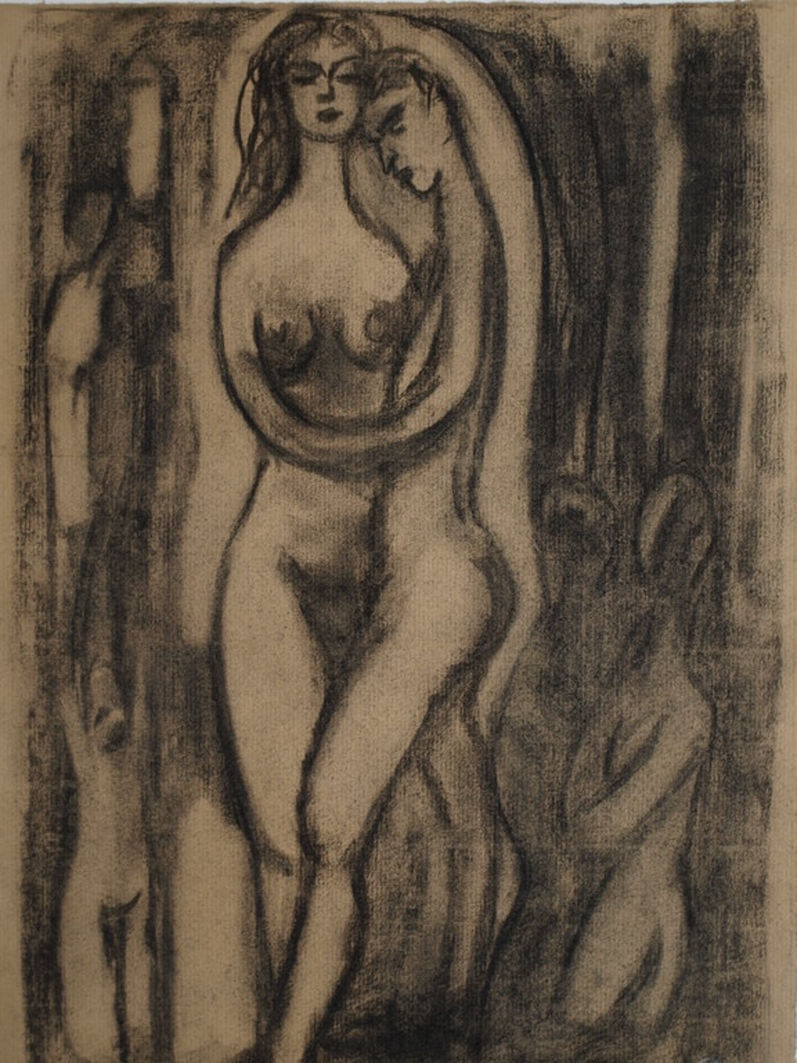 Een mooie houtskooltekening van de kunstenares Carla van Slooten met een voorstelling van naakte figuren.