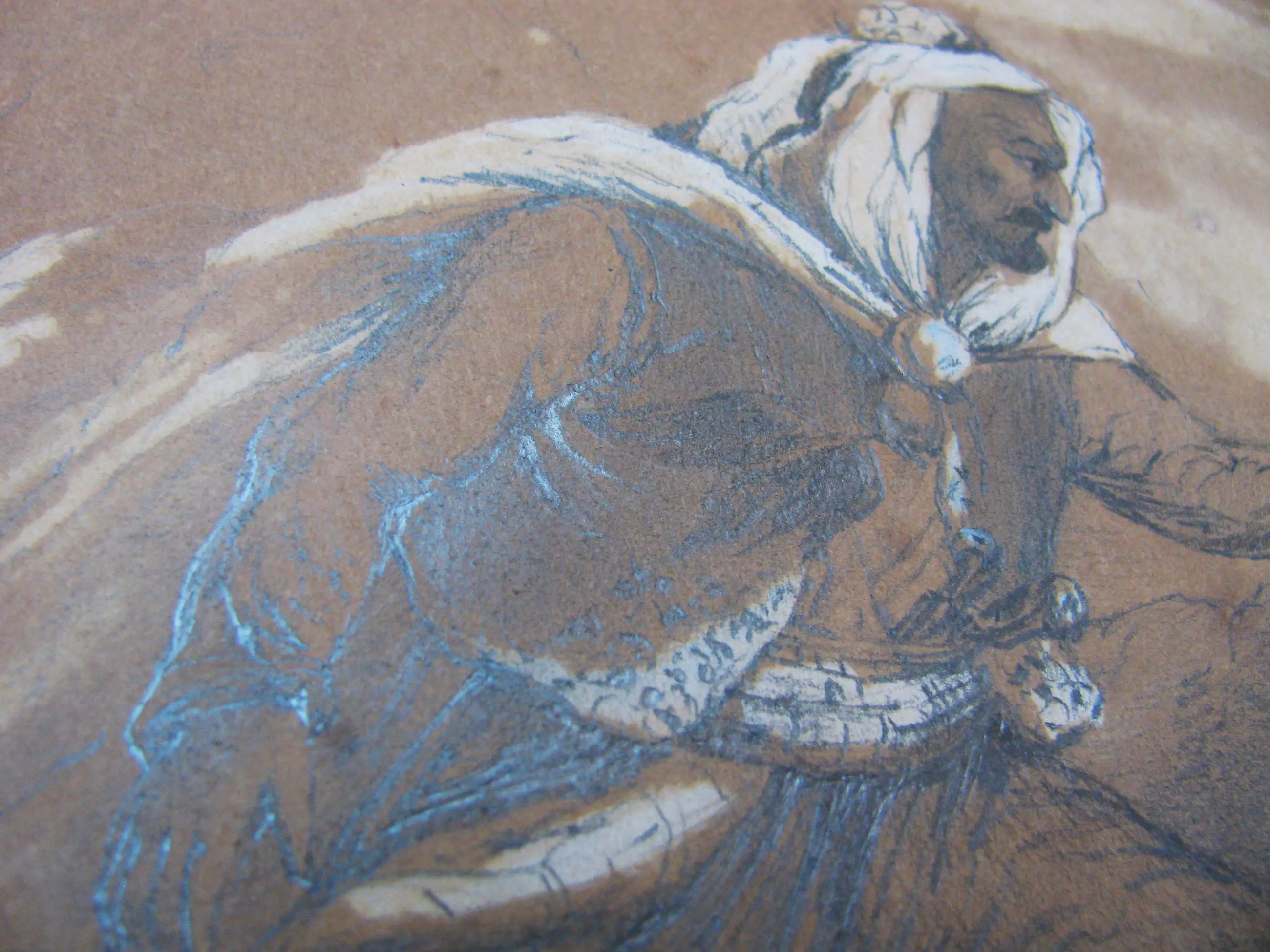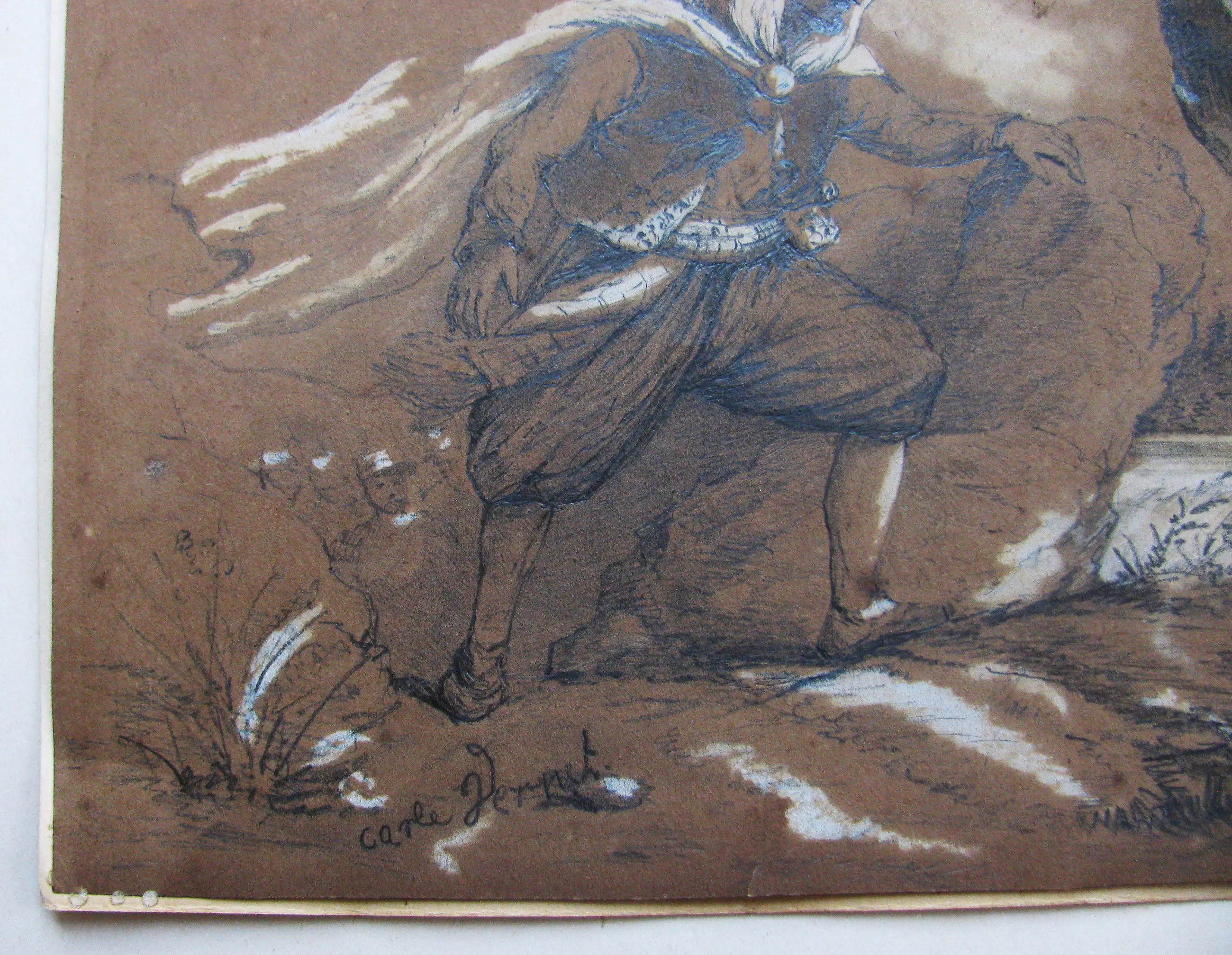 CARLE VERNET, 1758-1836 Potlood, met witte accenten. 23 x 28 cm op oud aquarelpapier of okerkleurig, oud gelegd papier Aan de hoeken bevestigd op karton. Met potlood ondertekend. In zeer goede staat.