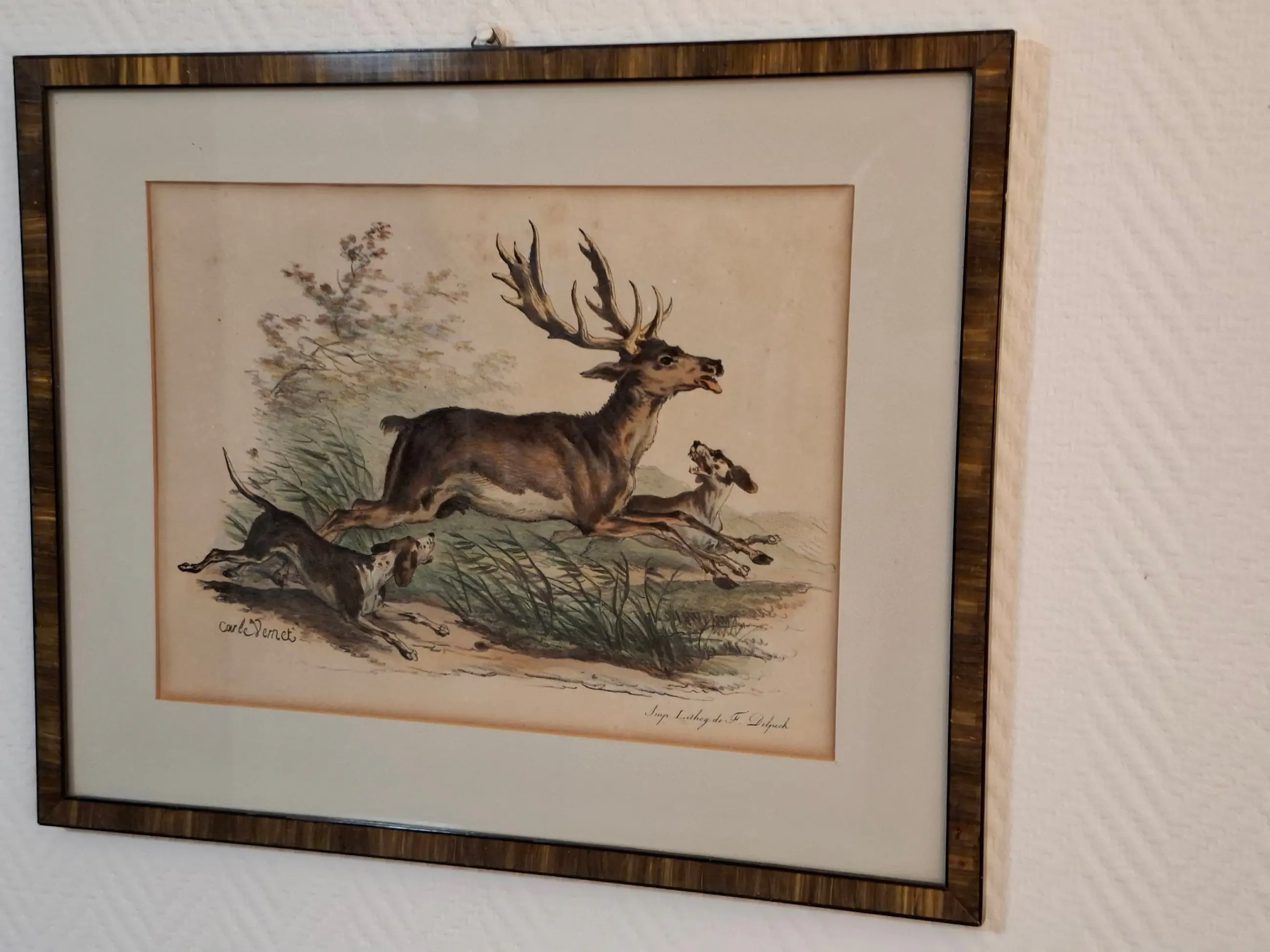 Deze litho is met de hand ingekleurd en gesigneerd in de steen. Charles Horace (Carle) Vernet is vooral bekend geworden als schilder van paarden, veldslagen jachttaferelen en karikaturen. Vernet was het jongste kind van Claude Joseph Vernet, en de vader van Horace Vernet. Hij werd toegelaten tot de Académie in 1788. Na de revolutie werd Vernet tijdens het bewind van Napoleon een geliefd schilder van veldslagen, mede door zijn grote kennis van de anatomie van paarden. Napoleon kende hem het Legioen van Eer toe en van Louis XVIII kreeg hij de Orde van Sint-Michel. Veel van zijn werk hangt in het British museum