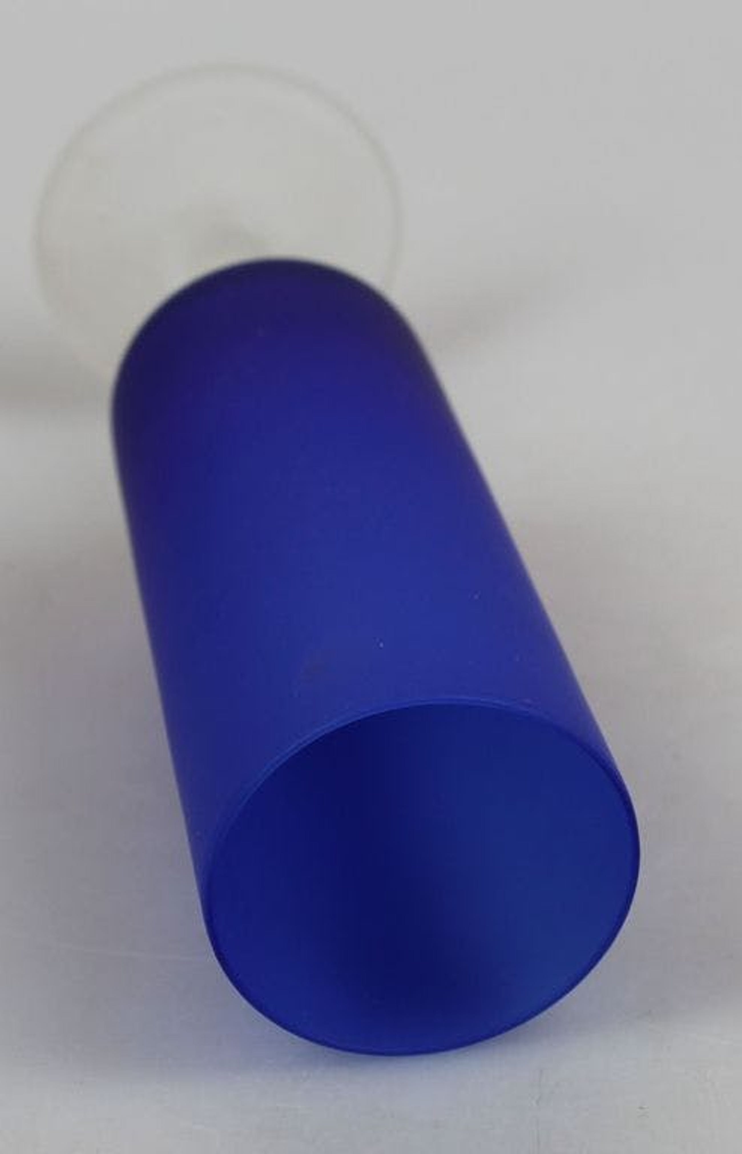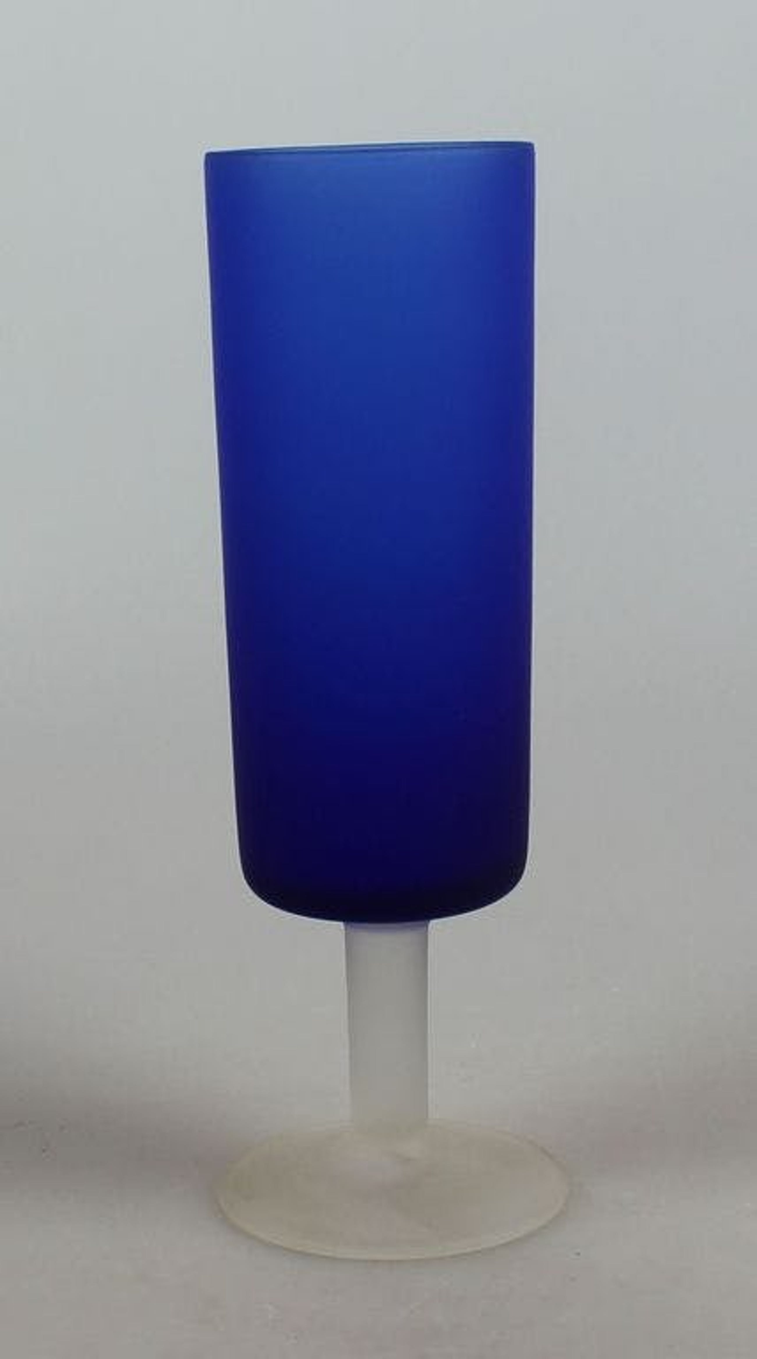 Donkerblauw slank vaasje op matte witte voet, satijnglas door Carlo Moretti Italië. In uitstekende conditie. Hoogte 16 cm.