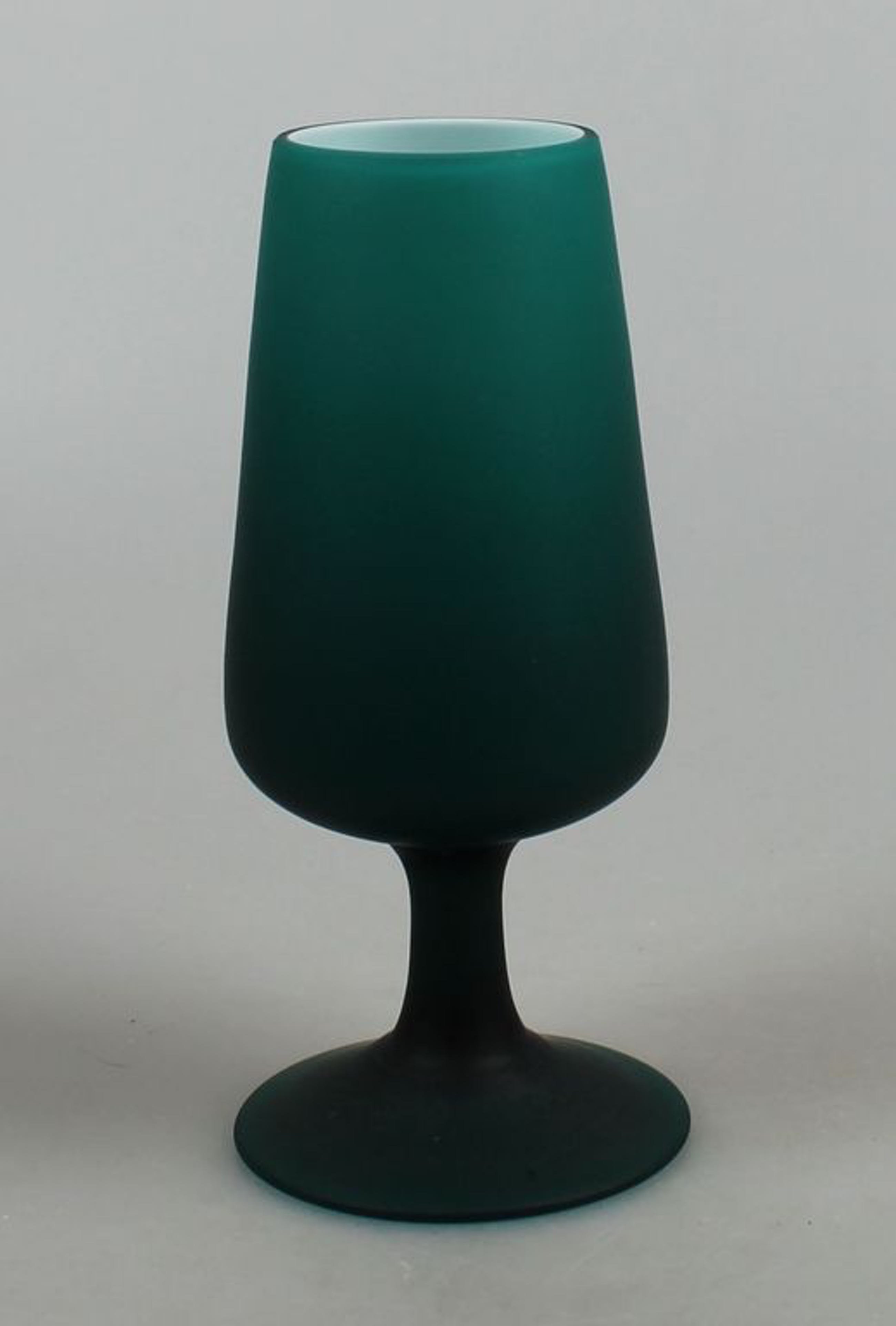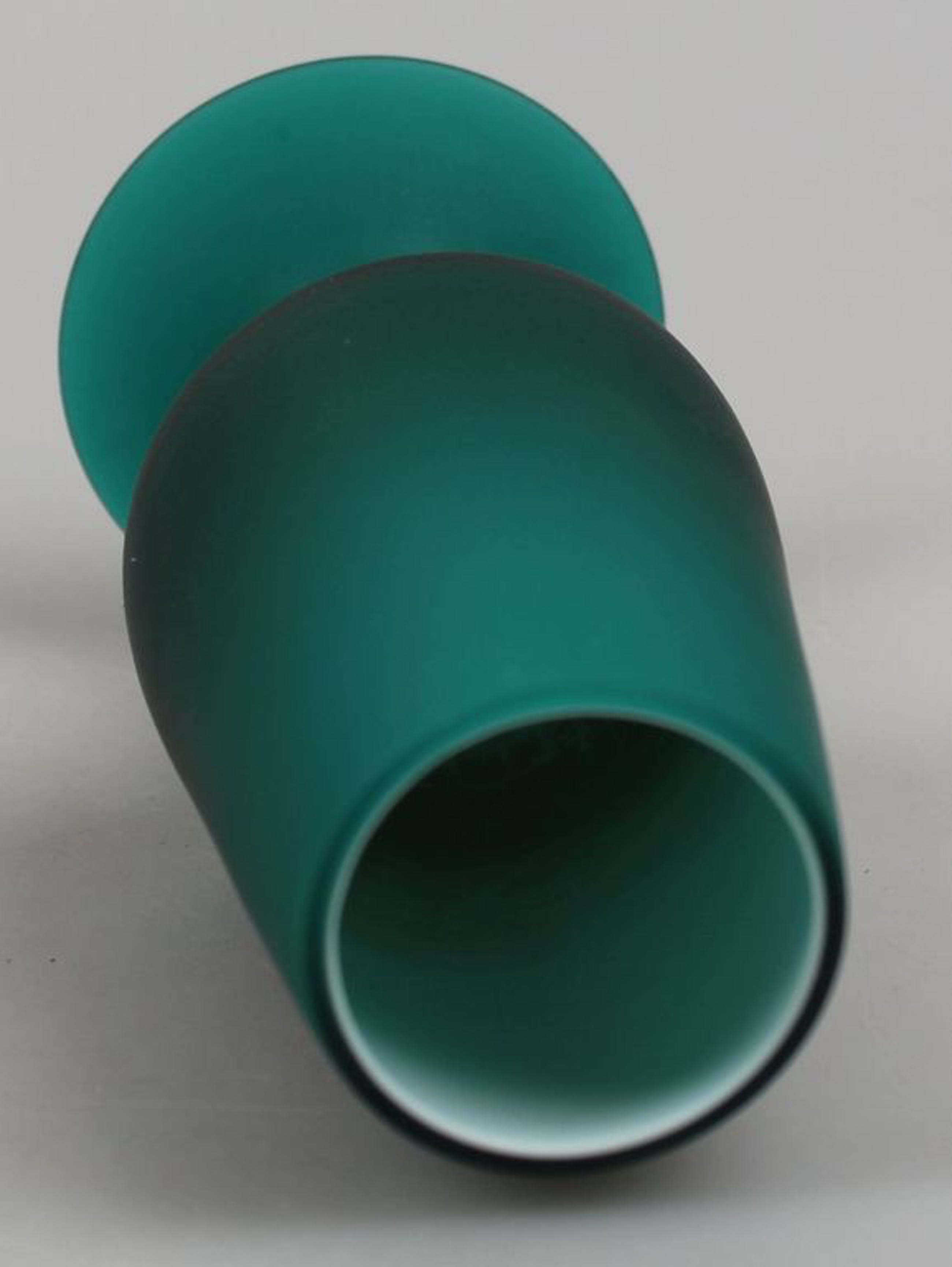 Groen bokaaltje op voet, satijnglas door Carlo Moretti. Witte melkglazen binnenkant. Hoogte 13 cm. In uitstekende conditie. Italiaans design.