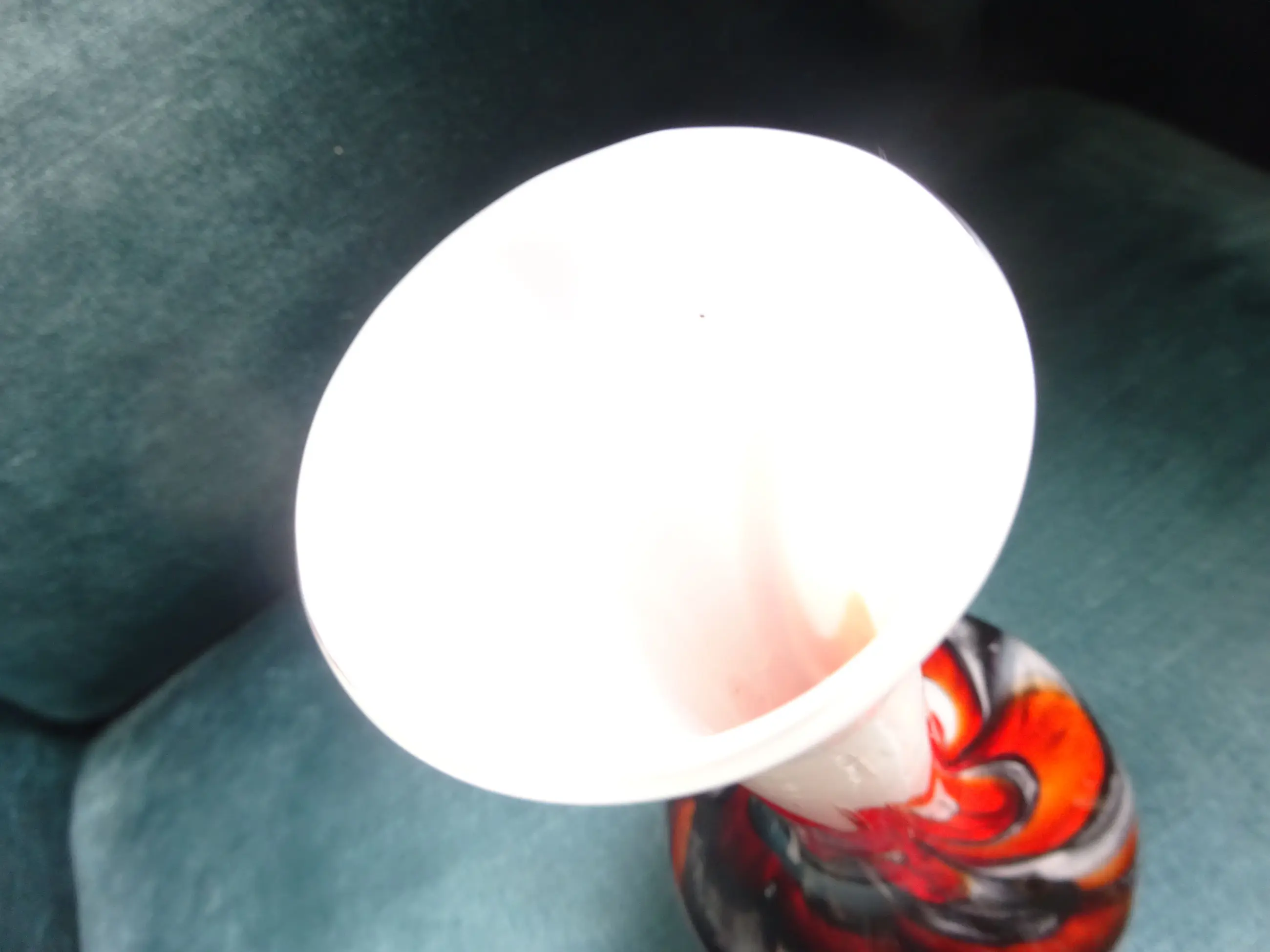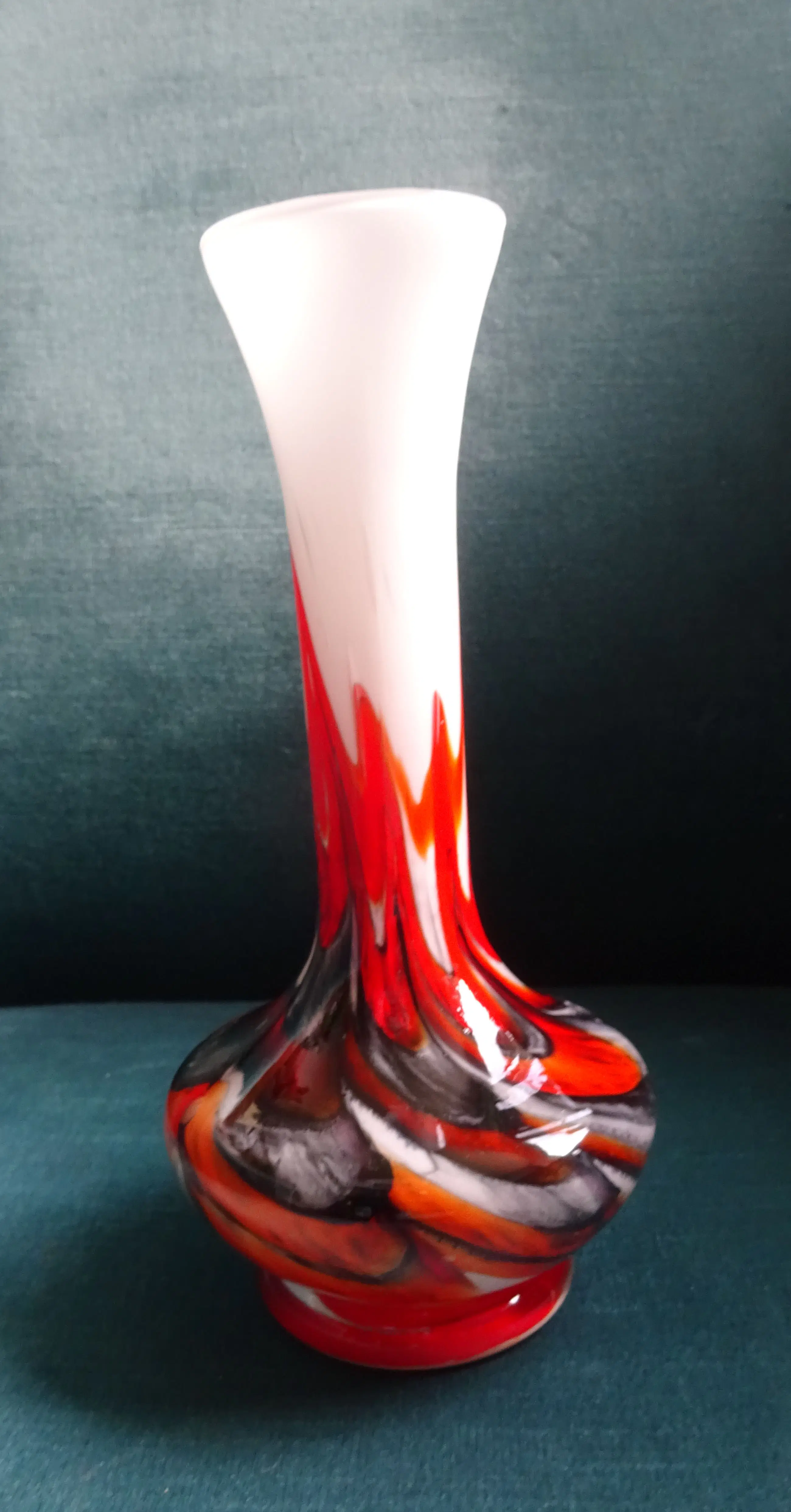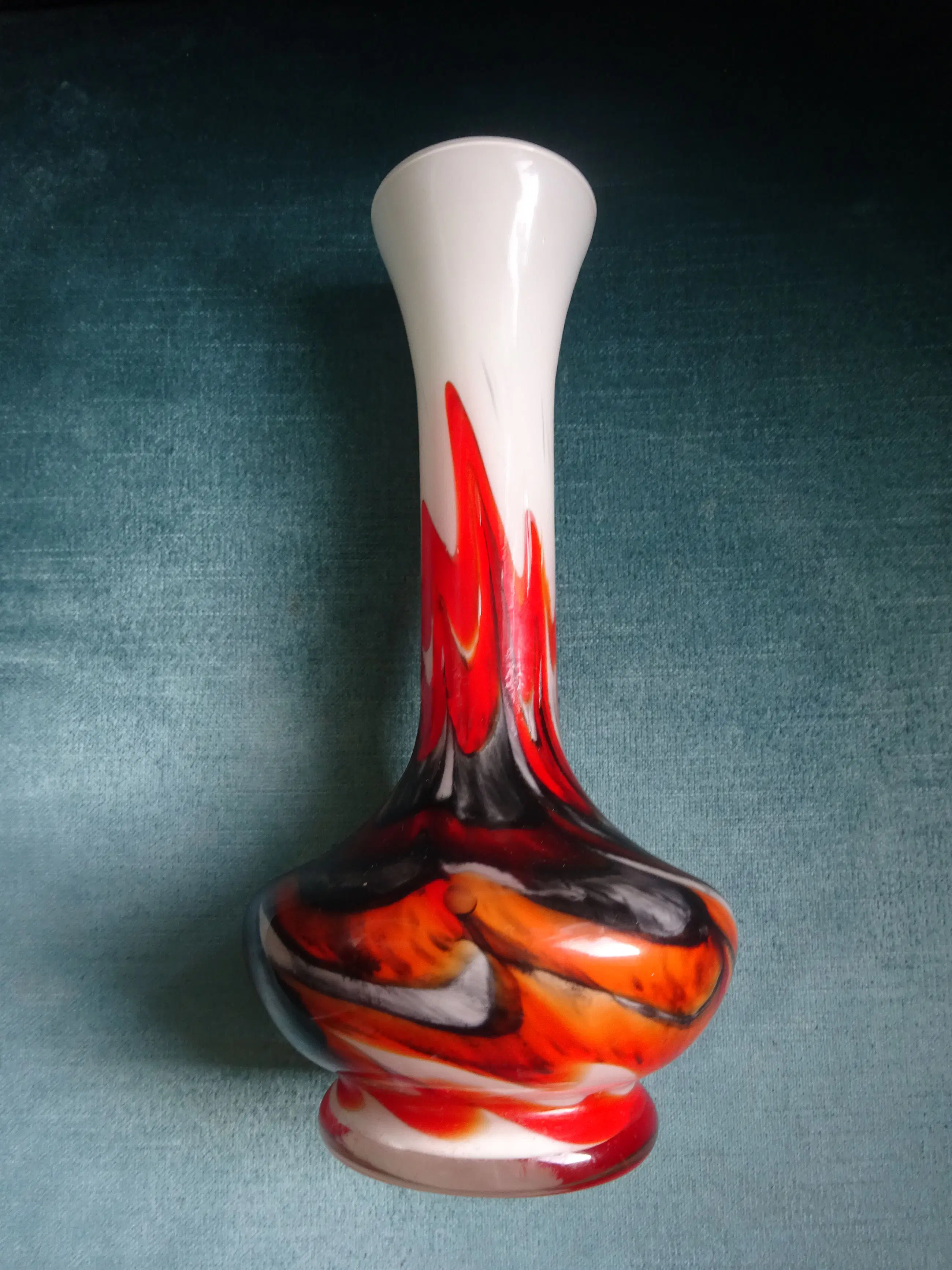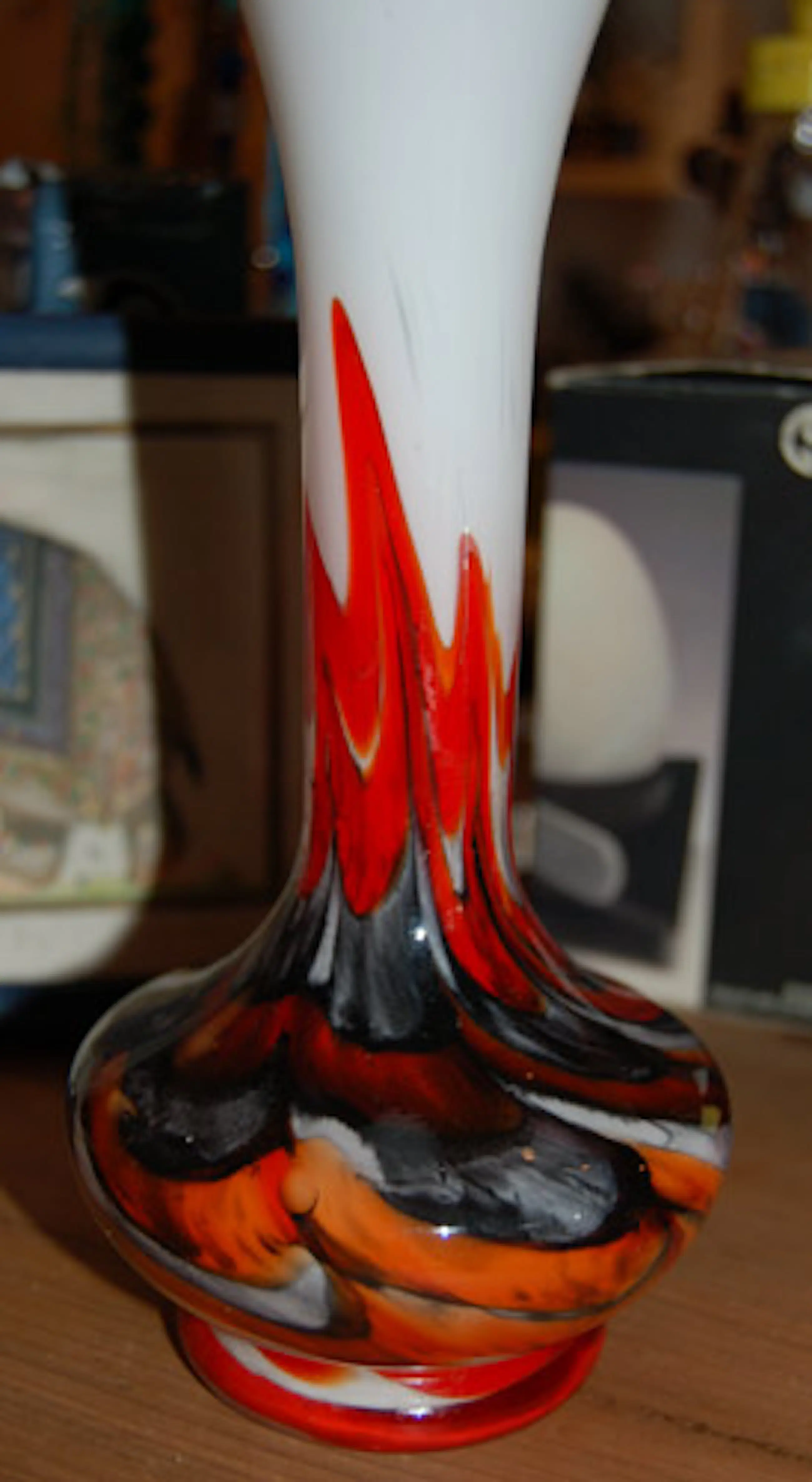 Opaline witte vaas met felgekleurde vlammen in rood/zwart en oranje. Ontwerp: Carlo Moretti Uitvoering: Empoli Serie: Opaline Florence Land: Murano Italy 'vetreria di borgonovo' Jaar: jaren eind zestig- begin zeventig vorige eeuw Hoogte: 20 cm Conditie: gaaf