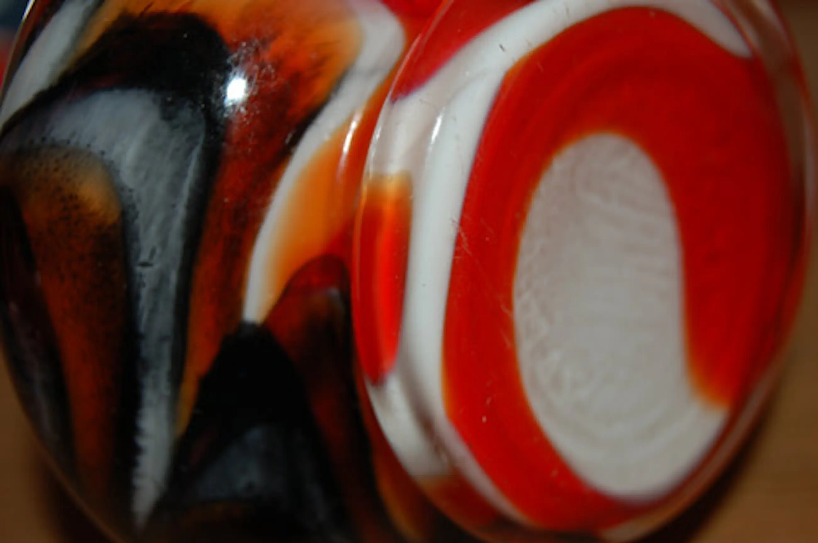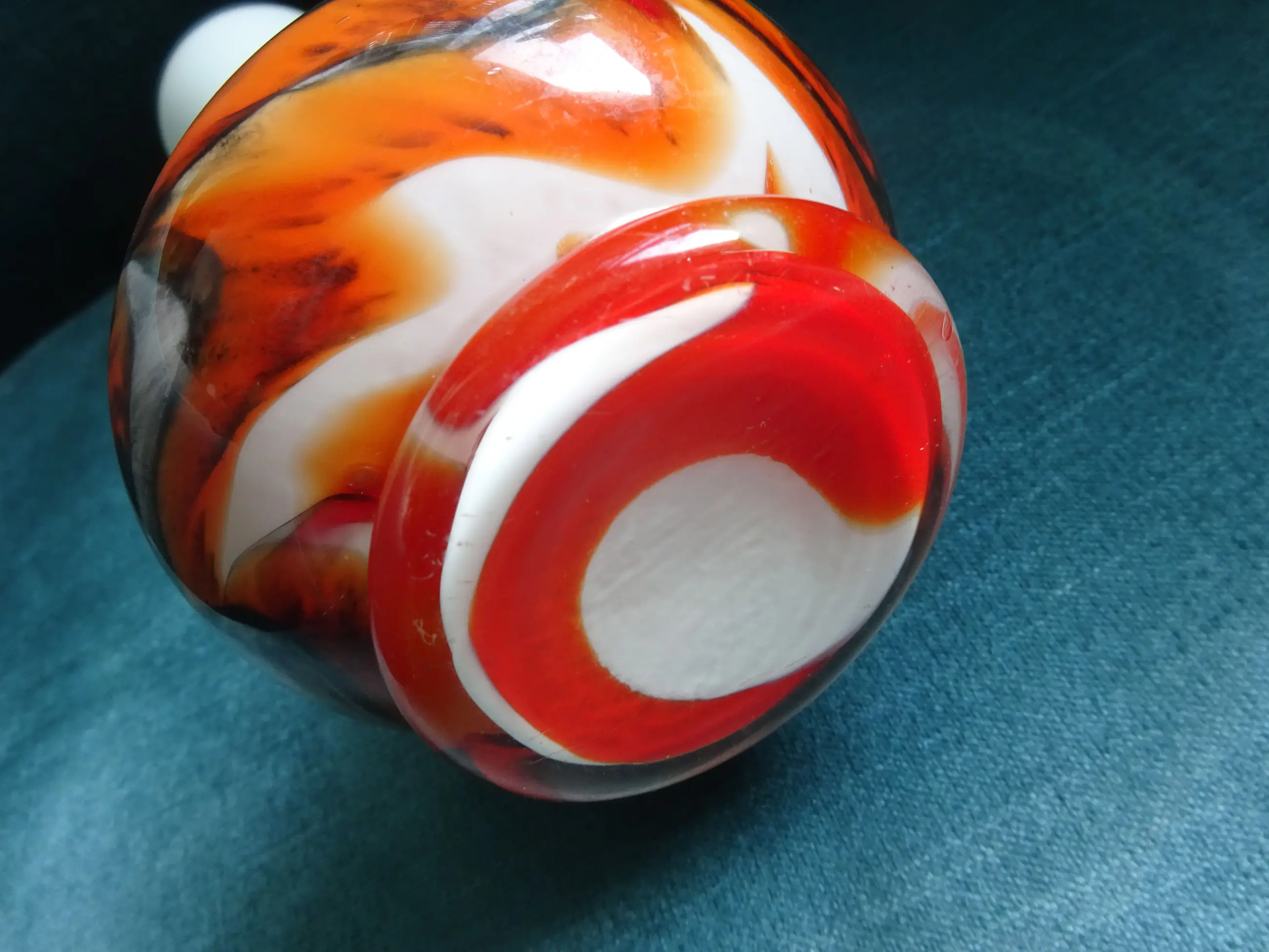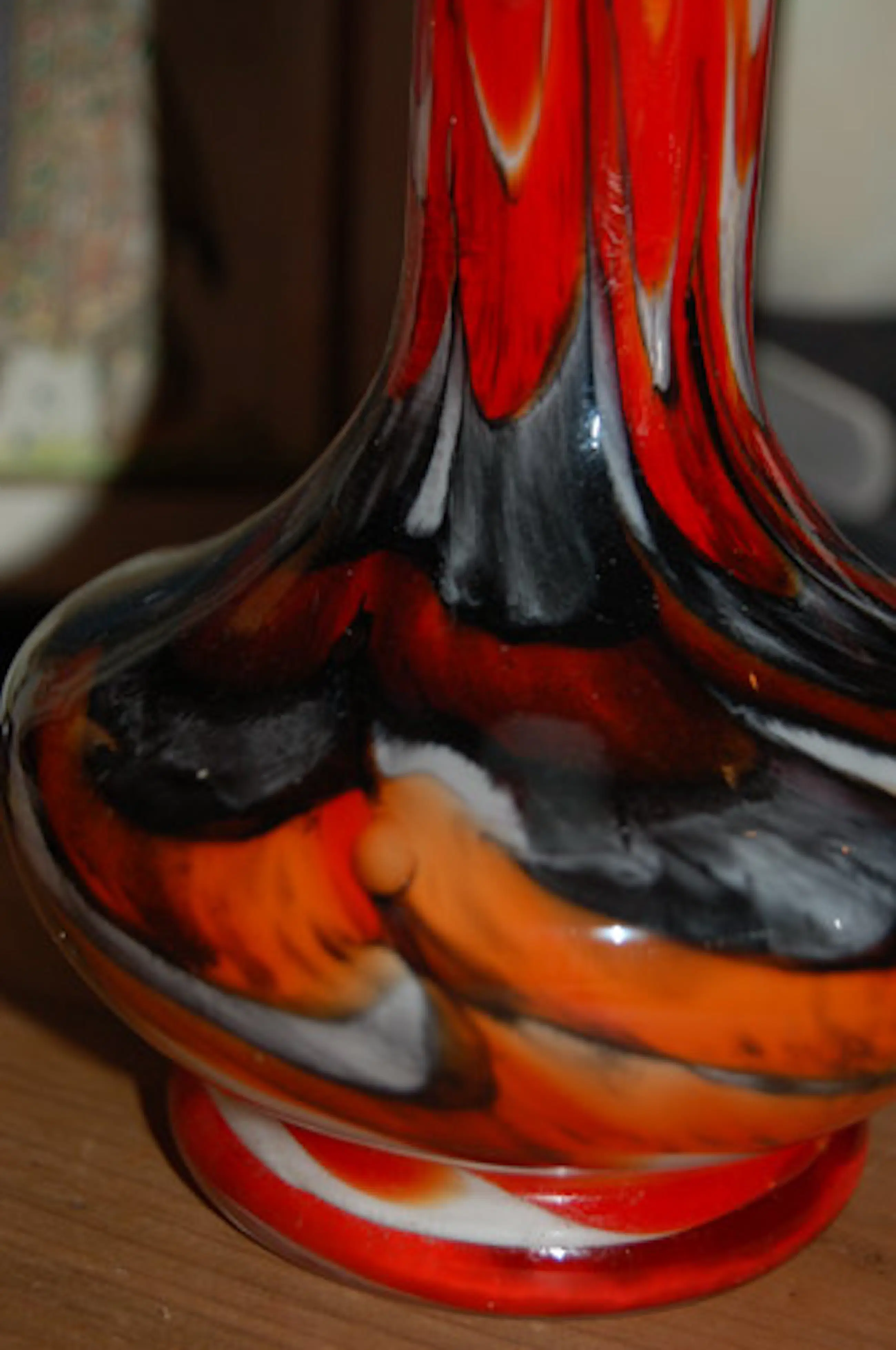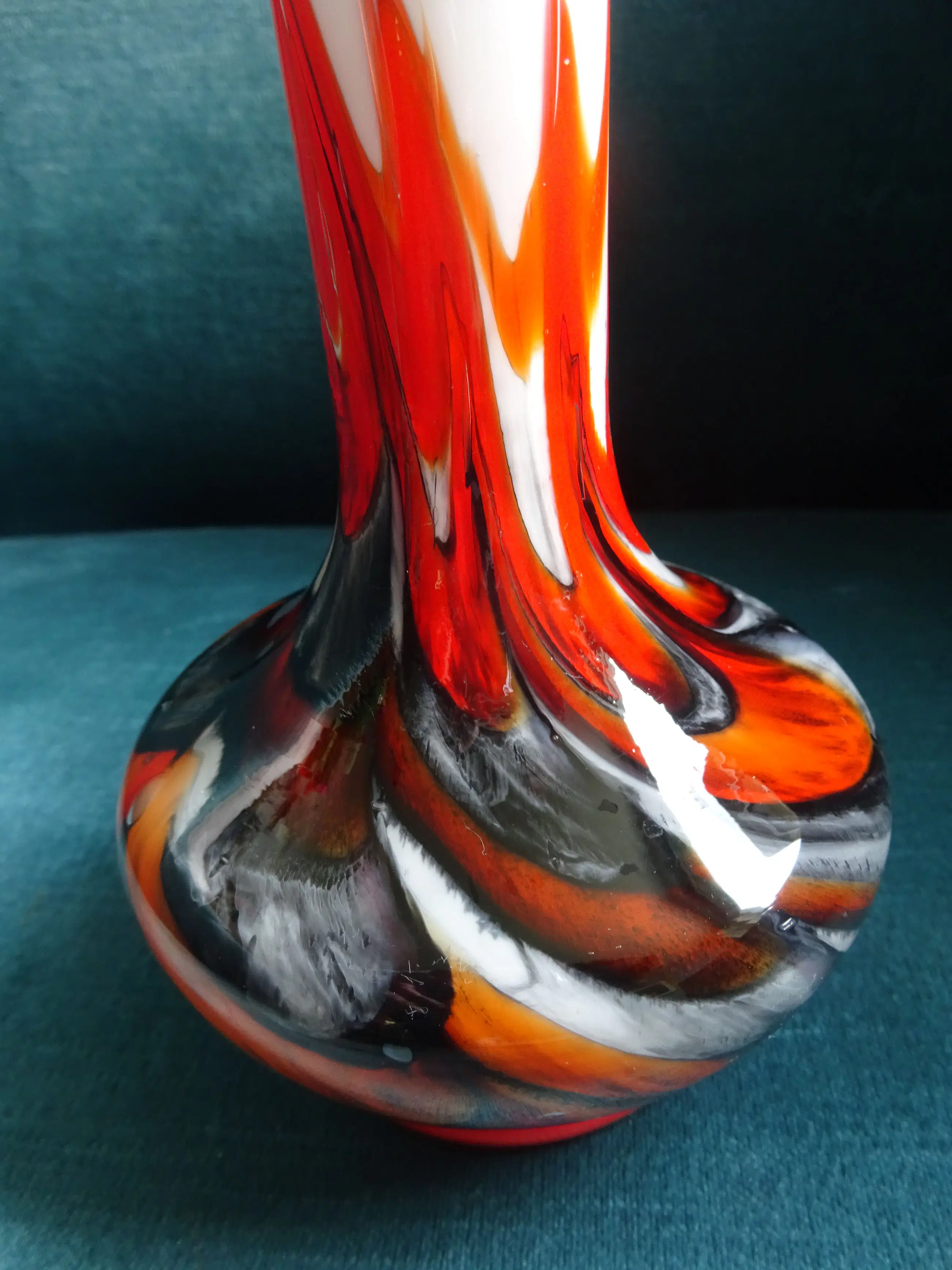 Opaline witte vaas met felgekleurde vlammen in rood/zwart en oranje. Ontwerp: Carlo Moretti Uitvoering: Empoli Serie: Opaline Florence Land: Murano Italy 'vetreria di borgonovo' Jaar: jaren eind zestig- begin zeventig vorige eeuw Hoogte: 20 cm Conditie: gaaf