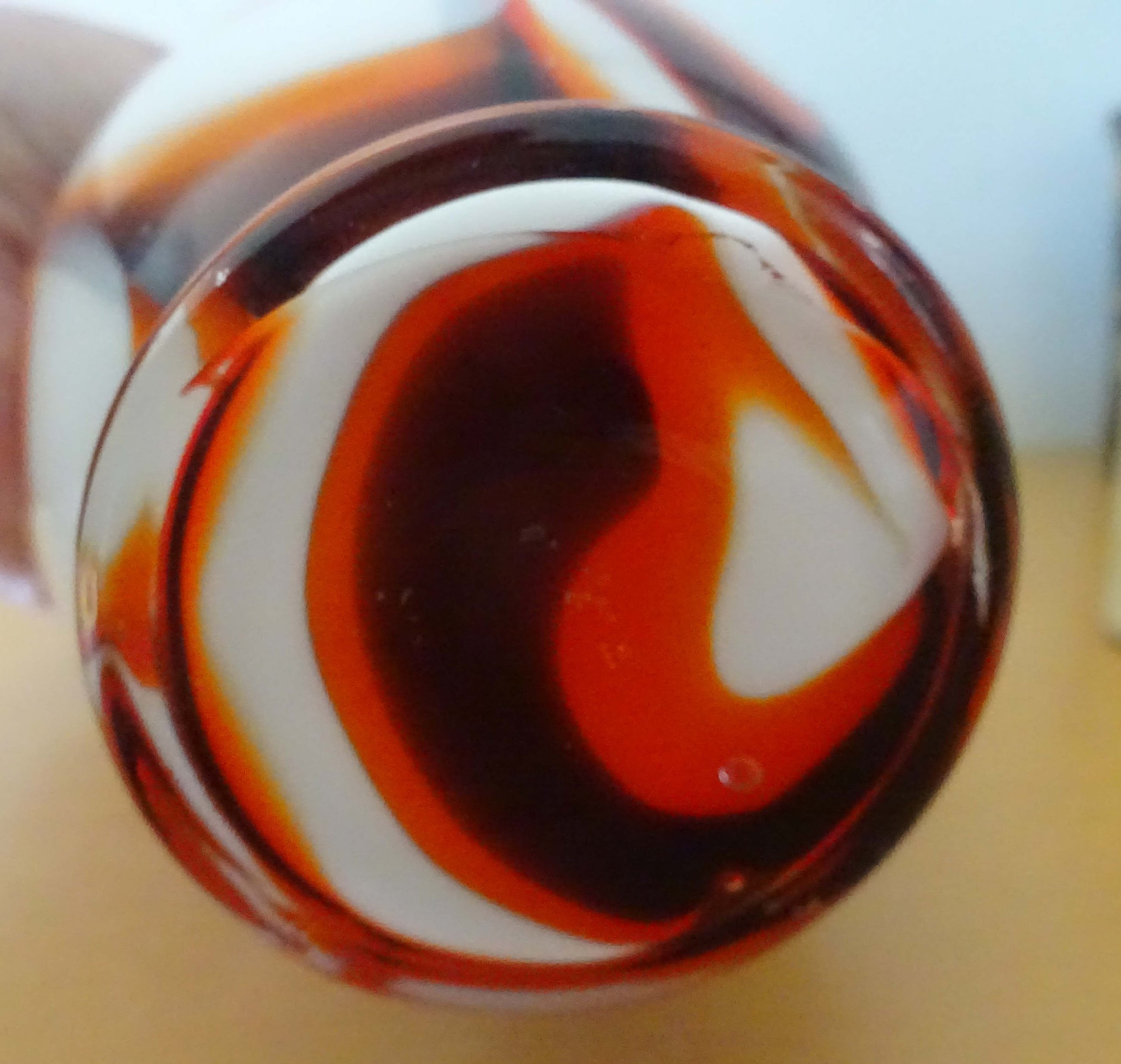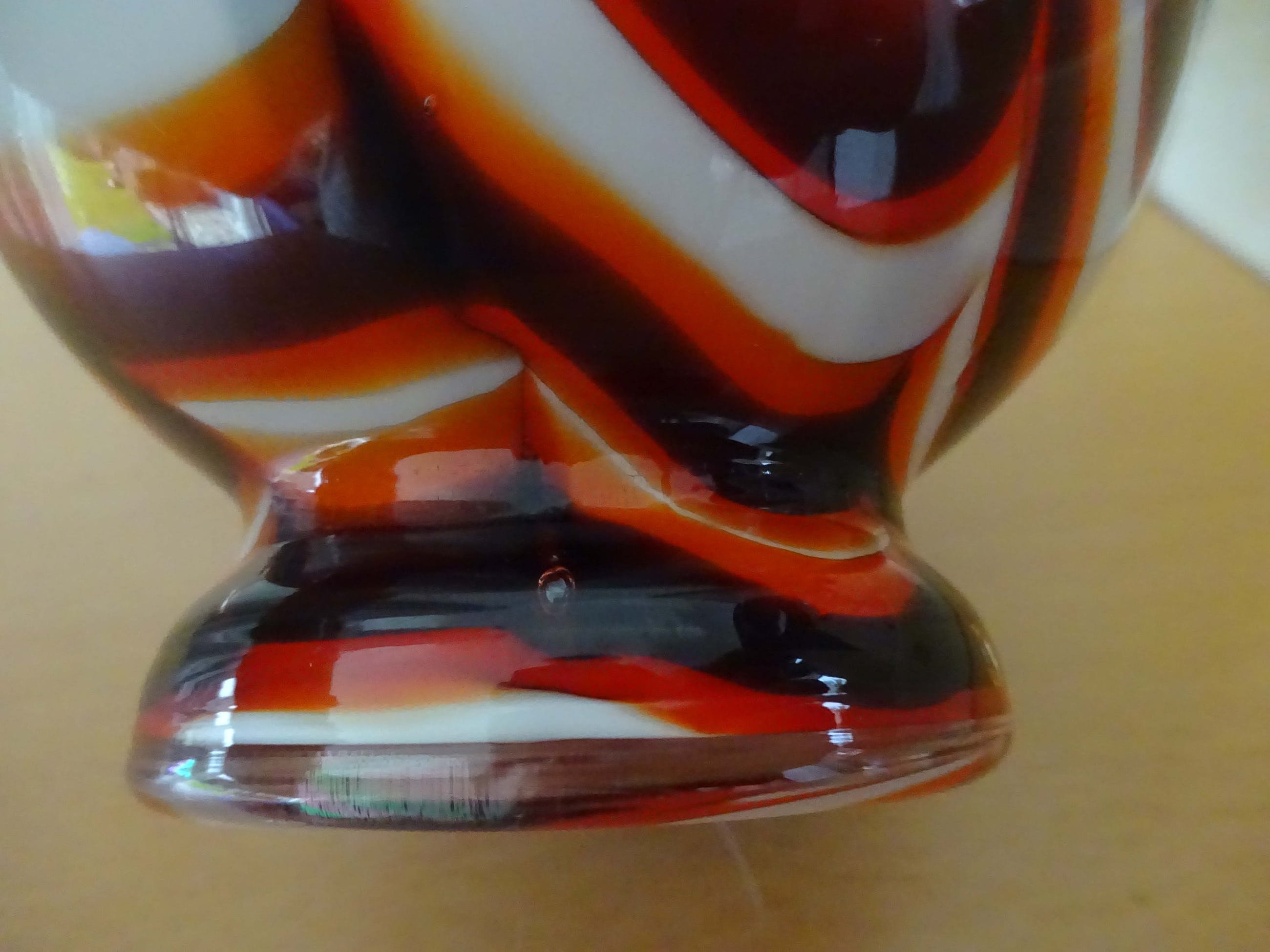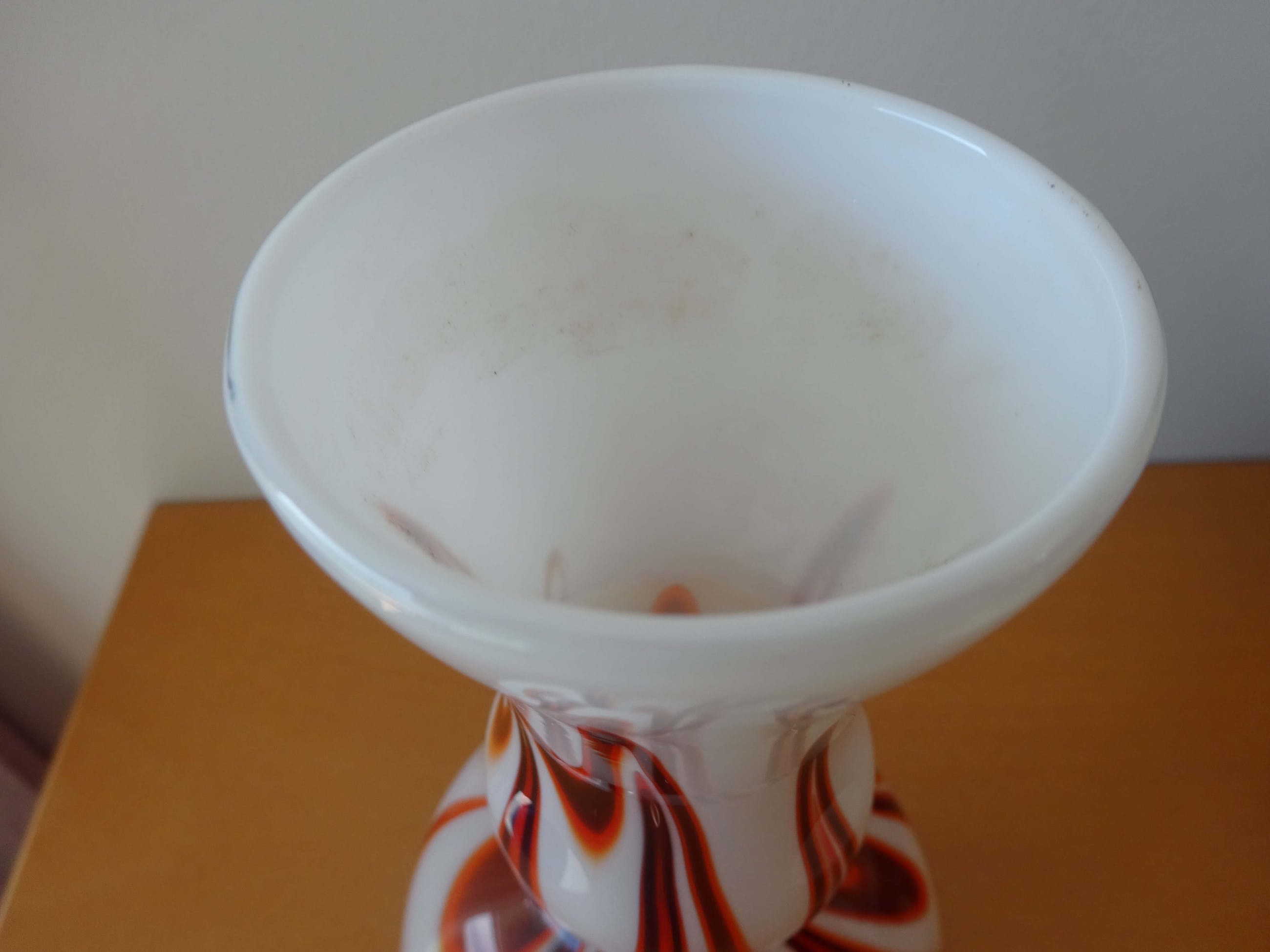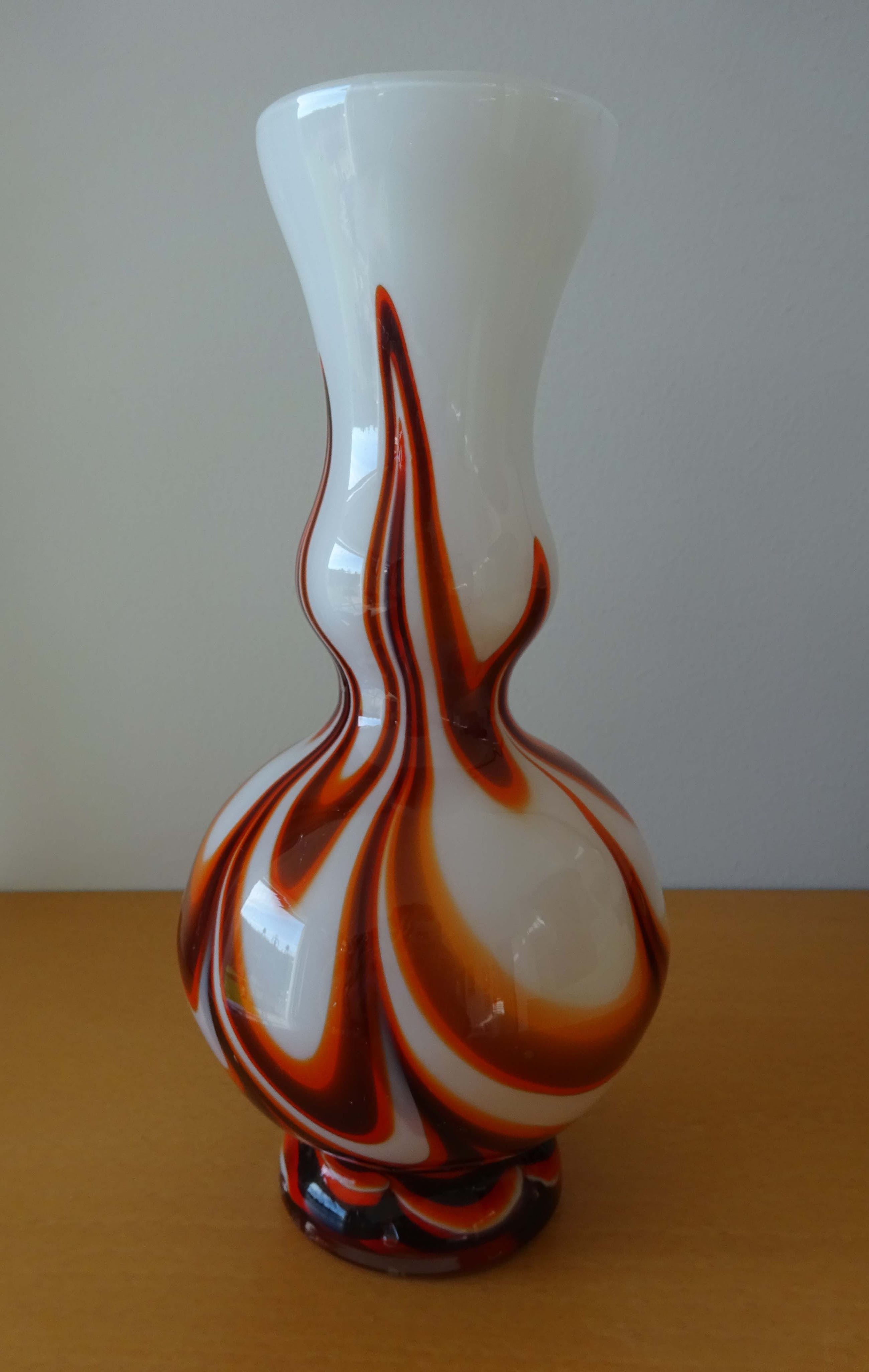 Opaline witte vaas met felgekleurde vlammen in rood/zwart en oranje. Ontwerp: Carlo Moretti 1958 Naam: Opaline Florence Land: Murano Italy Jaar: 70e