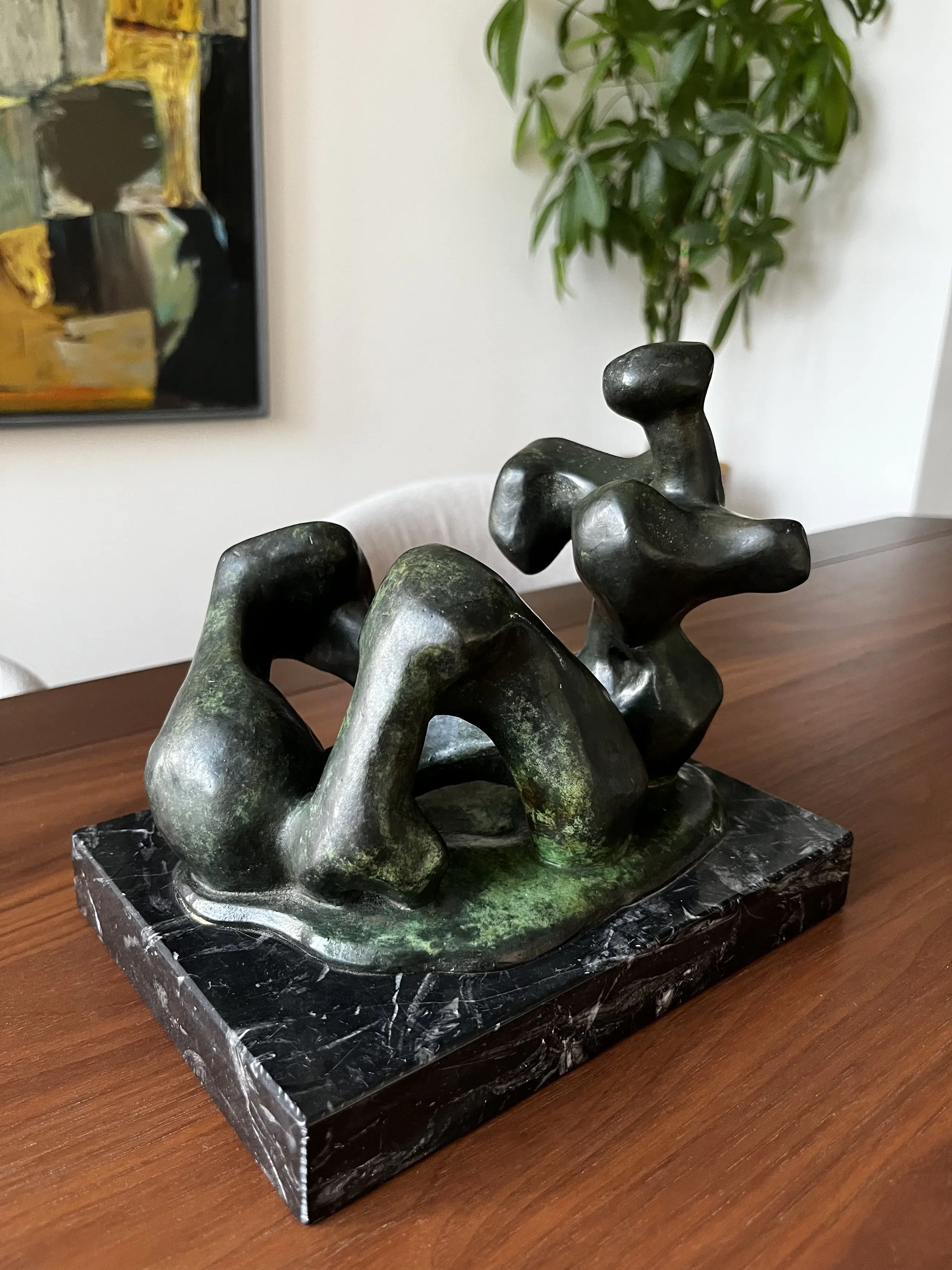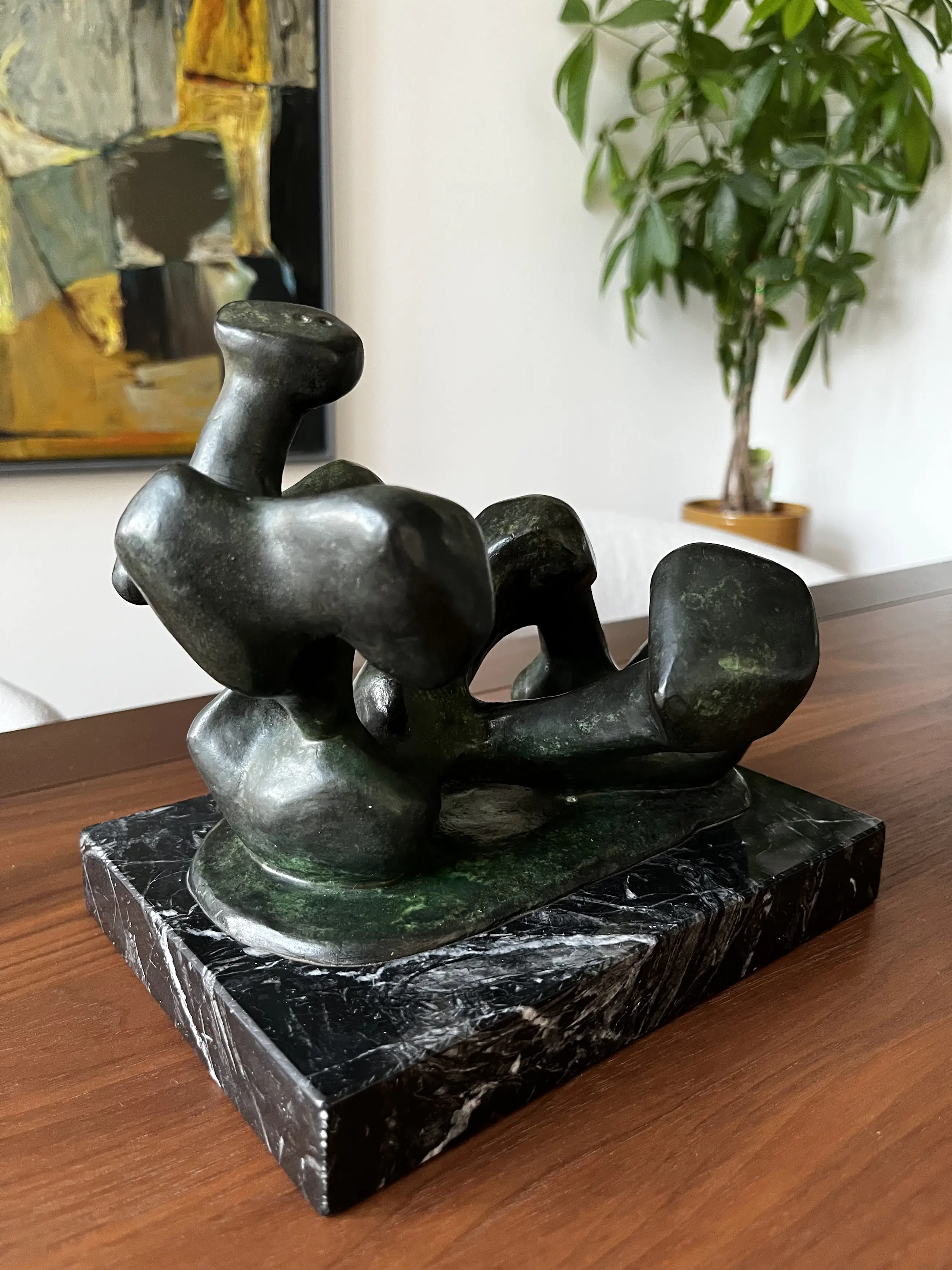 Bronzen sculptuur van de hand van Carlos Castanedo, van een abstract liggend figuur, geplaatst (bevestigd) op een marmeren plateau. Oplage onbekend. Het werk is handgesigneerd en komt uit 1994.