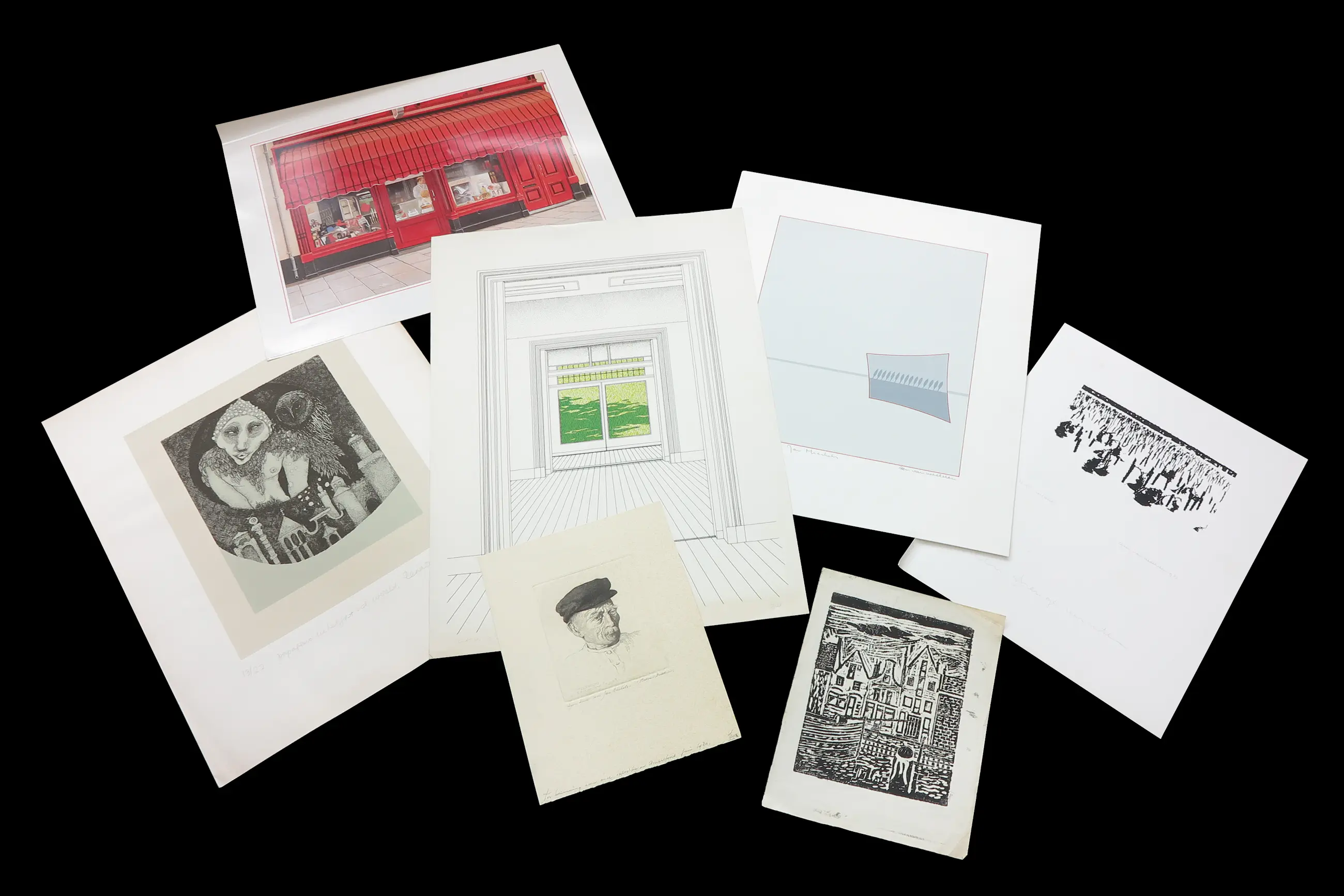 Lot met grafisch werk van diverse kunstenaars zoals Piet van Dokkum, Renate Carelse en Leen van Weelden.