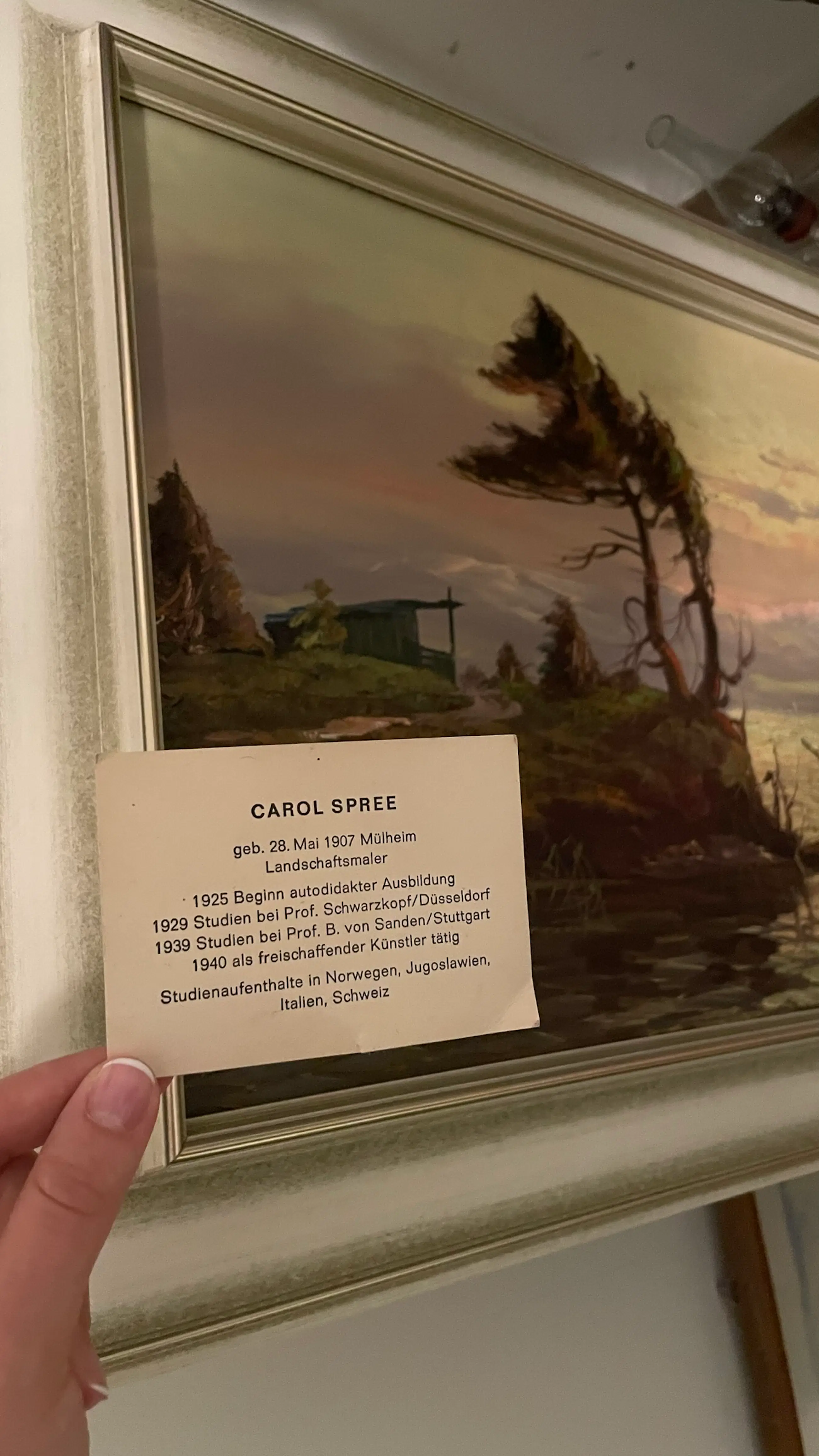 Kunstenaarsinformatie: Karl Becker gebruikte als pseudoniem "Carol Spree" of "Spreé", naar de meisjesnaam van zijn moeder, "Spree". Hij was een Duitse landschaps- en marineschilder (geboren in 1907 in Mühlheim), vanaf 1925 autodidact, vanaf 1929 leerling van Richard Schwarzkopf in Düsseldorf, vanaf 1939 verder opgeleid bij Bruno von Sanden in Stuttgart, en maakte studiereizen naar Joegoslavië, Noorwegen, Italië en Zwitserland. Vanaf 1940 was hij freelance kunstenaar en actief in de tuinstad Luginsland nabij Stuttgart. Bron: Internet.