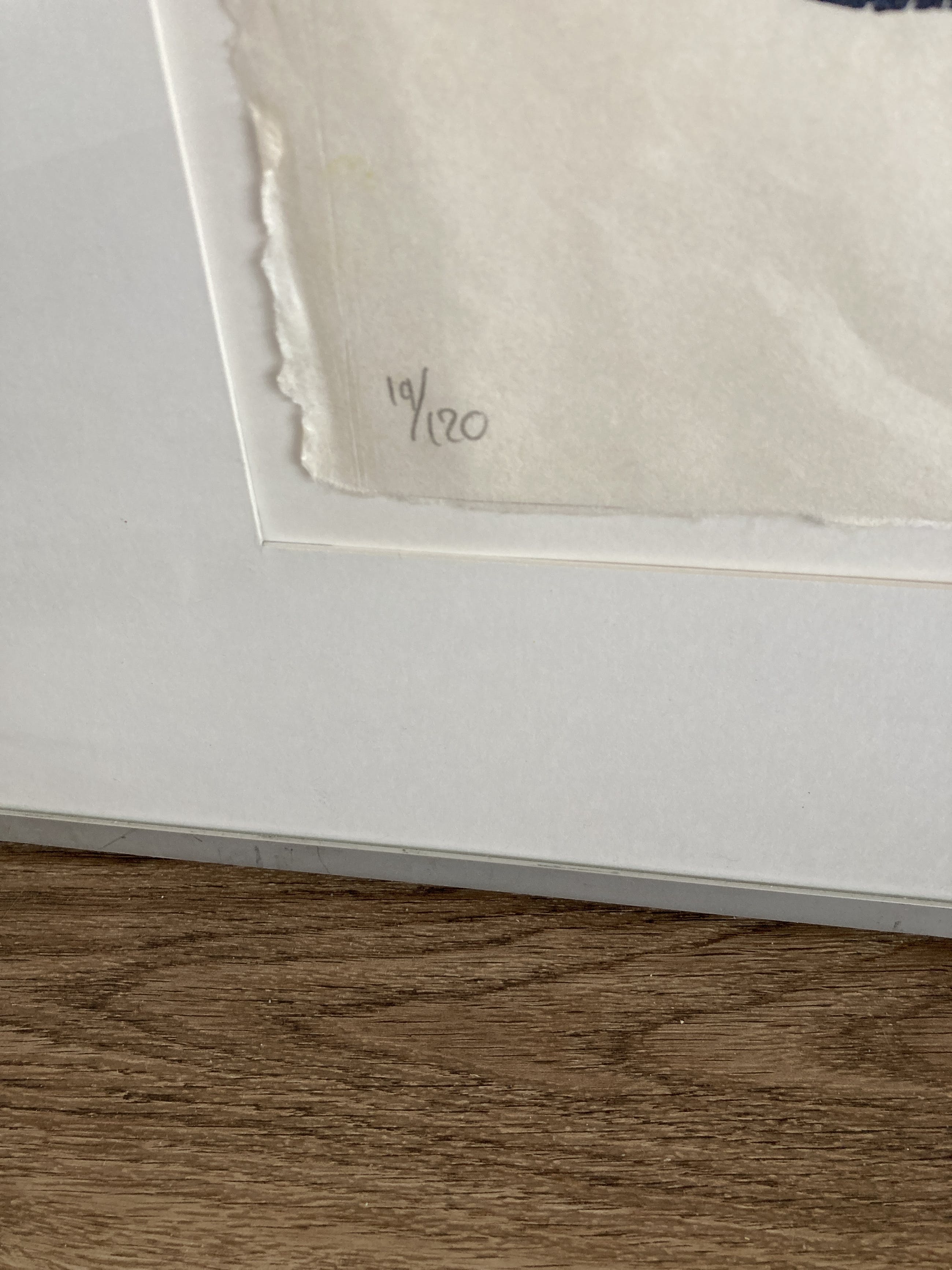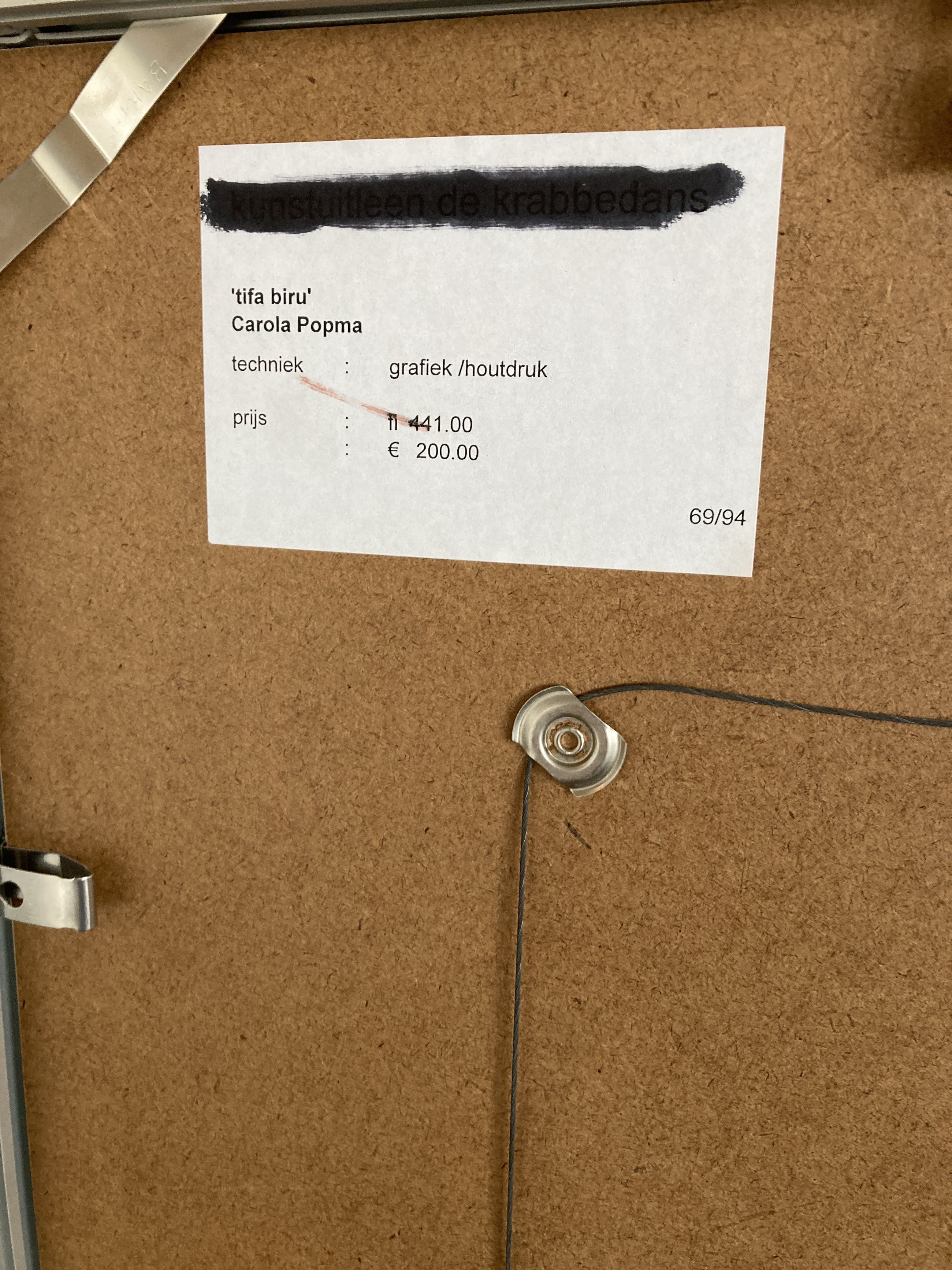 Deze houtsnede komt uit de portfolio ‘De rode wolk’ met werken van 17 Nederlandse kunstenaars ter gelegenheid van het Mondriaanjaar 1994 door Peninsula. Deze houtsnede zit in een Barth lijst. Met l.o.19/120 met potlood , in het midden Tifa Biru met potlood en r.o.Carola Popma ‘94.
