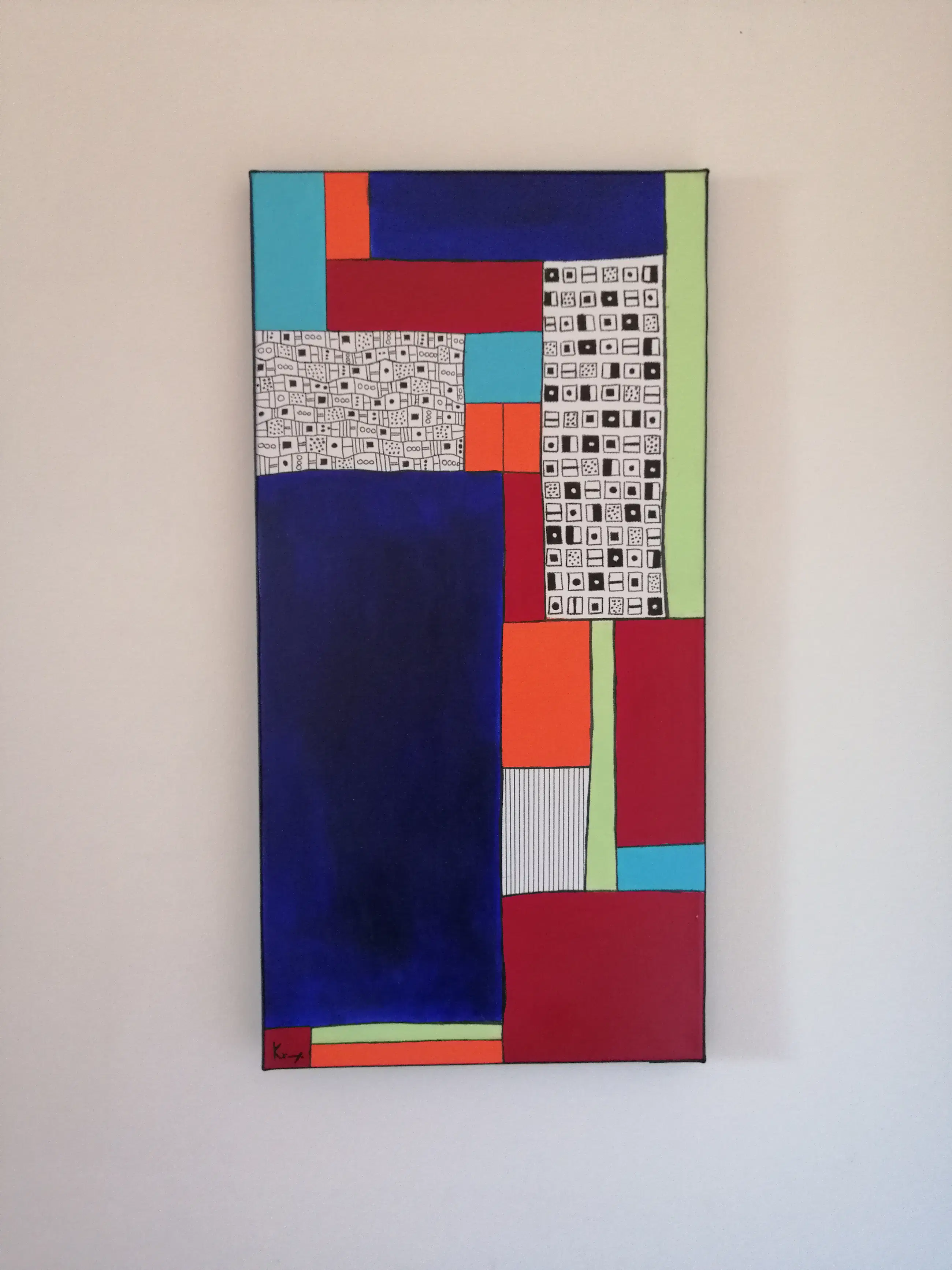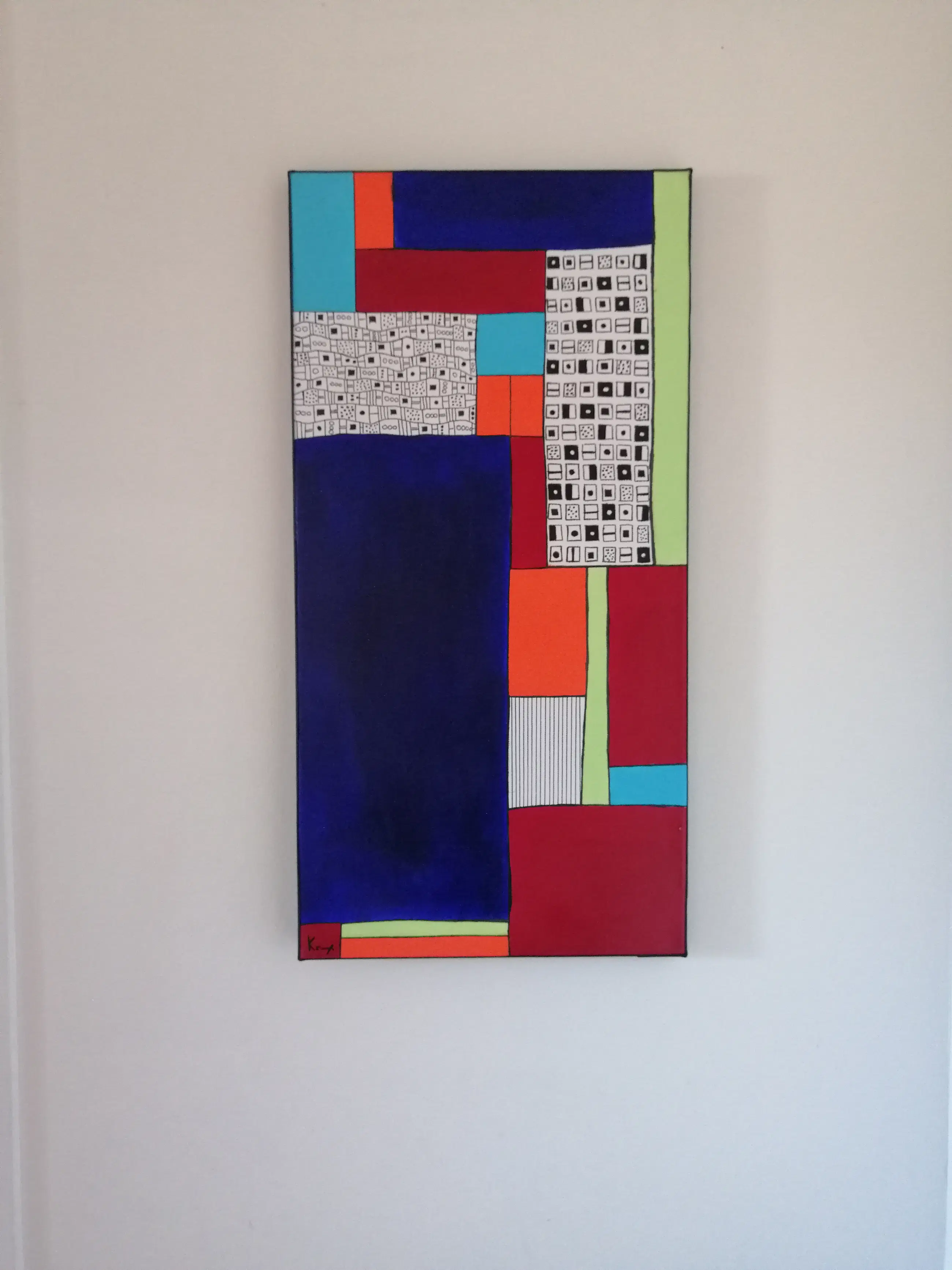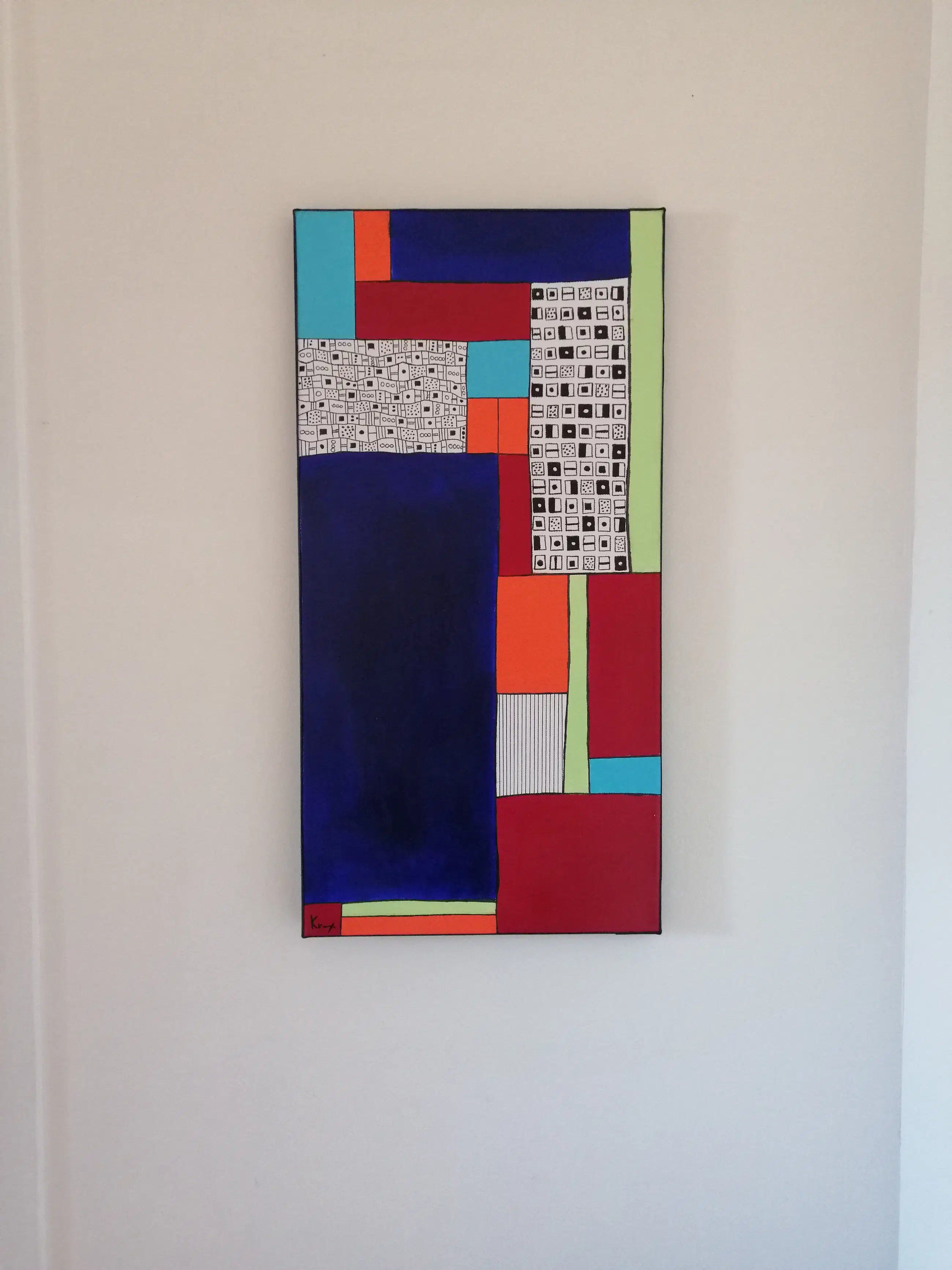 Technieken: acrylverf en inkt, afgewerkt met satijnvernis.