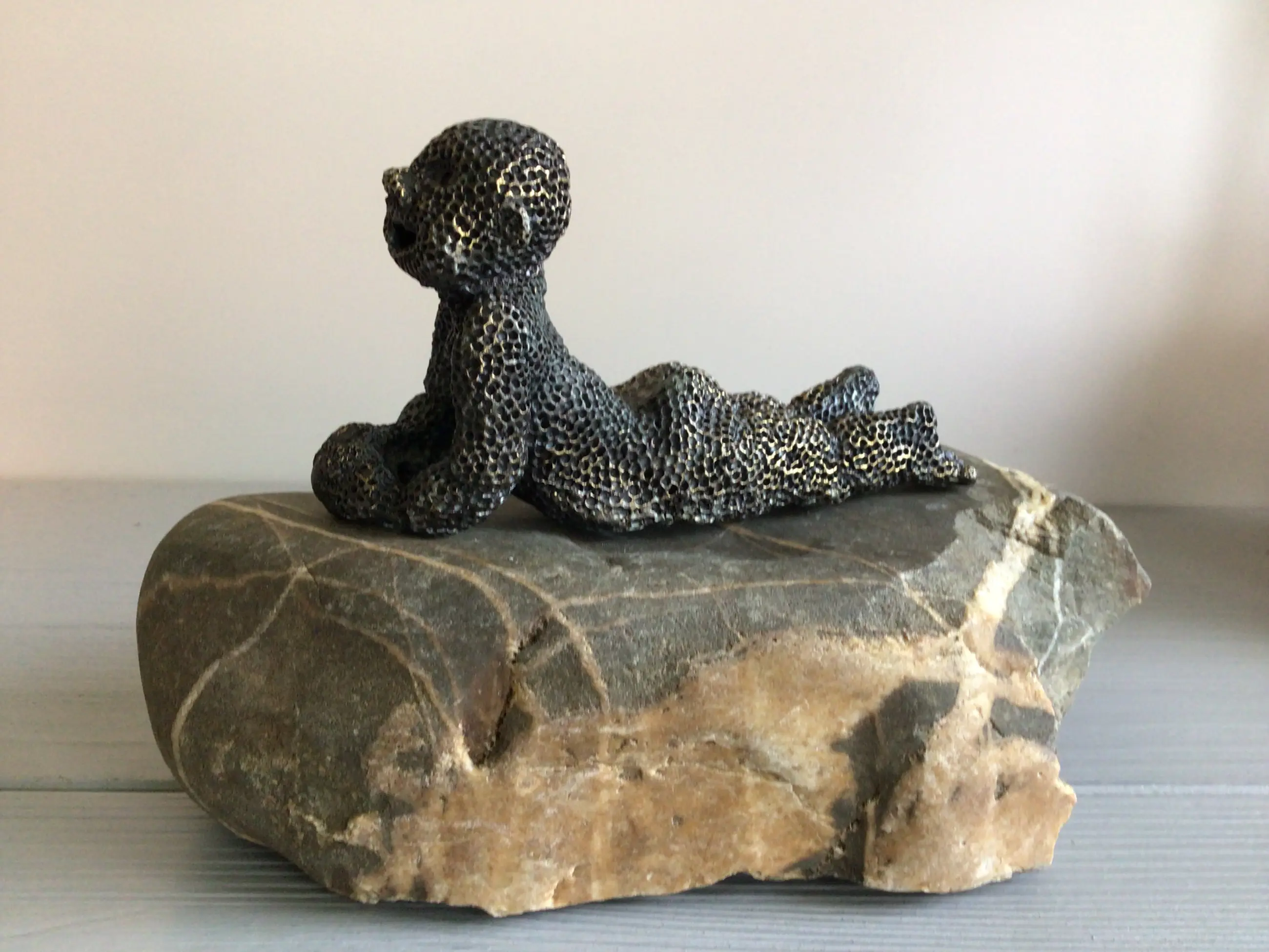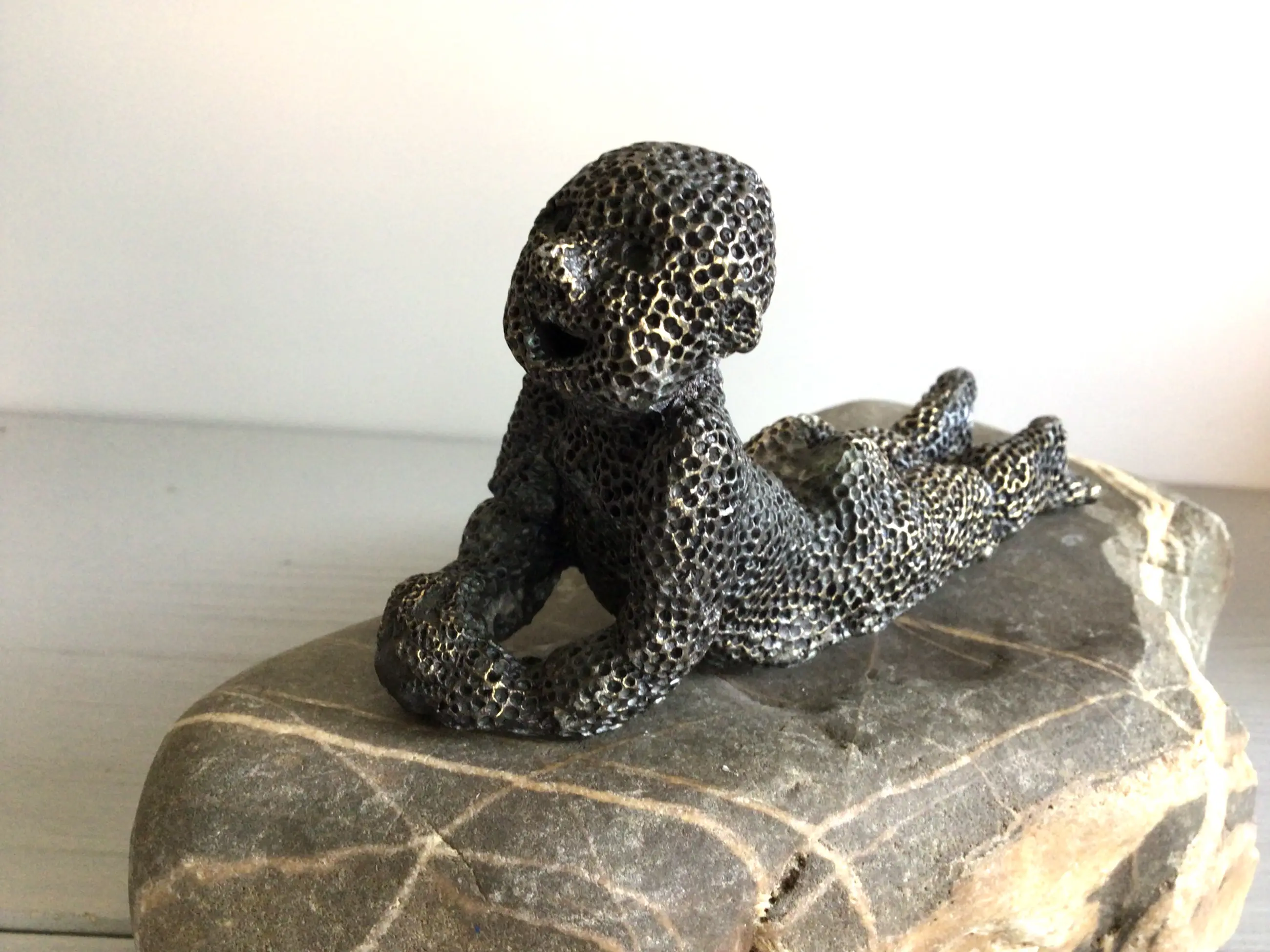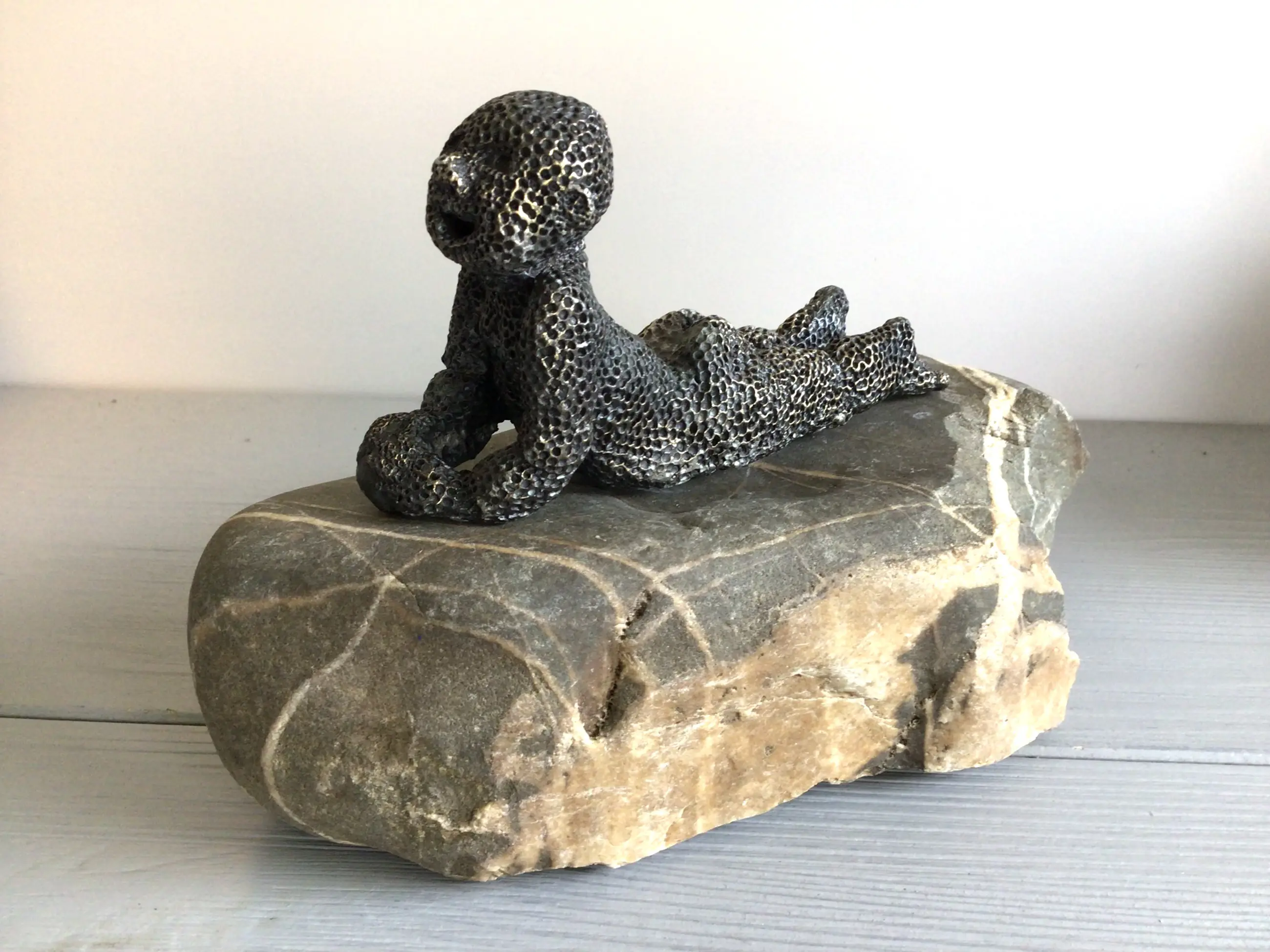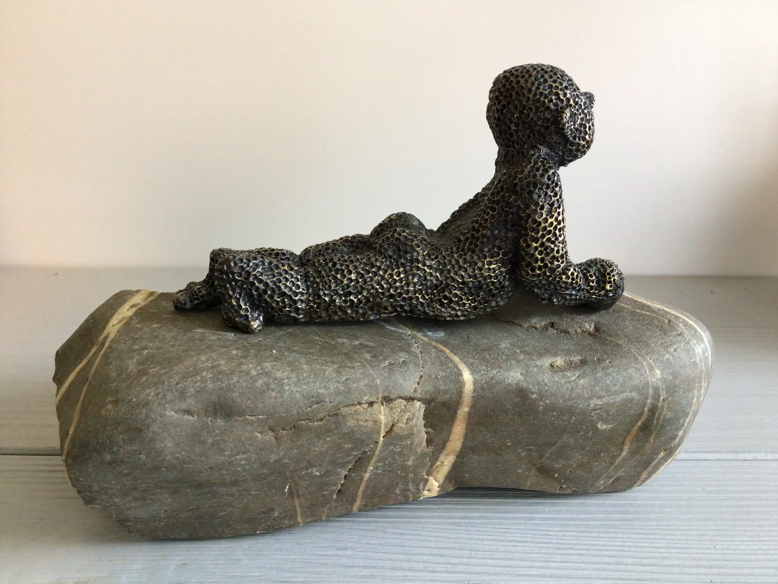 Zeer fraai gedetailleerd uitgevoerd sculptuur van een lachende baby met in zijn / haar handen een bal. Kunstenares: Carolein Smit. Het bronzen sculptuur ligt los op een steen, u kunt zelf bepalen of u deze wel of niet wilt gaan gebruiken. Sculptuur zonder steen : 7 cm x 13 cm x 4 cm Afmetingen met steen : 13 cm x 18 cm x 7 cm Het beeld verkeert in goede staat en wordt zorgvuldig verpakt verzonden.