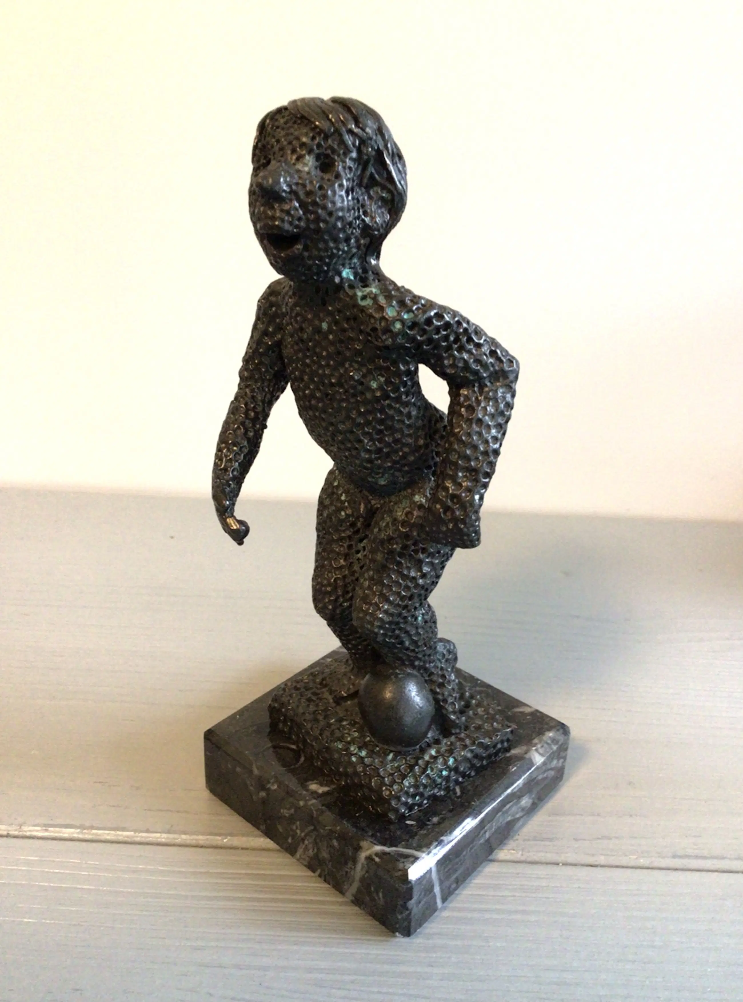 Zeer fraai en gedetailleerd uitgevoerd sculptuur van een voetballende jongeman Kunstenares: Carolein Smit Materiaal: brons Het beeld staat los op de marmeren sokkel zodat u zelf kunt bepalen of u deze wilt gaan gebruiken. Het beeld verkeert in goede staat en wordt zorgvuldig verpakt verzonden.