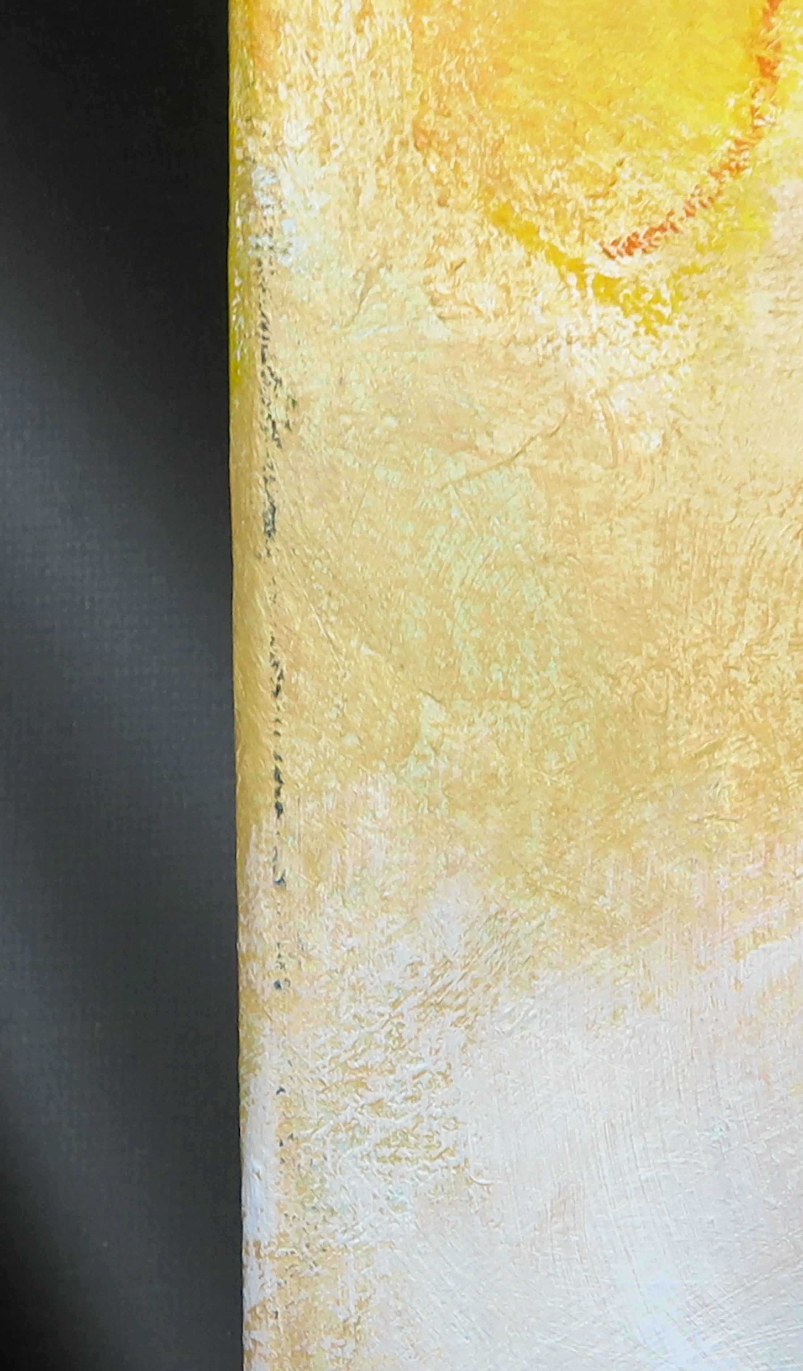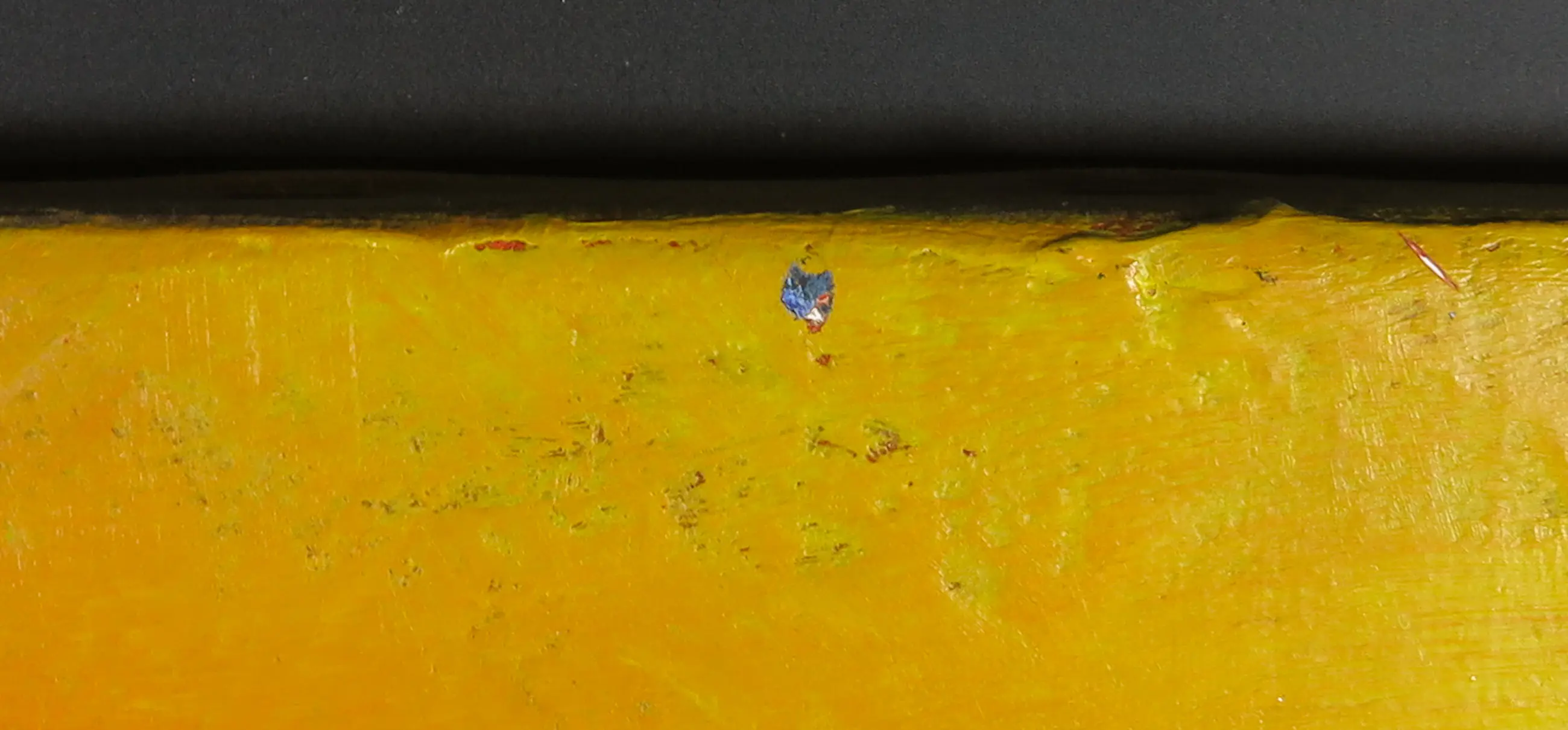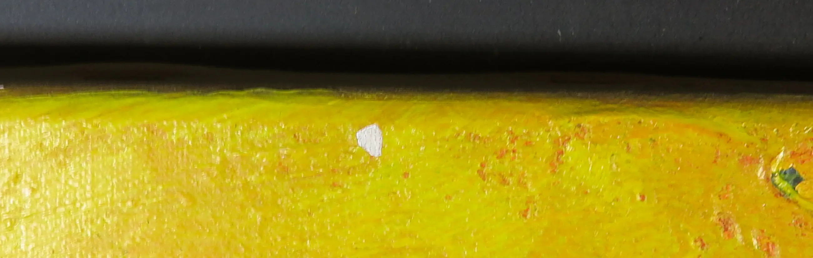 | Aan de randen van het doek zijn wat slijtagesporen zichtbaar, in enkele gevallen met ververlies. Zie hiervoor de detailfoto's. | |