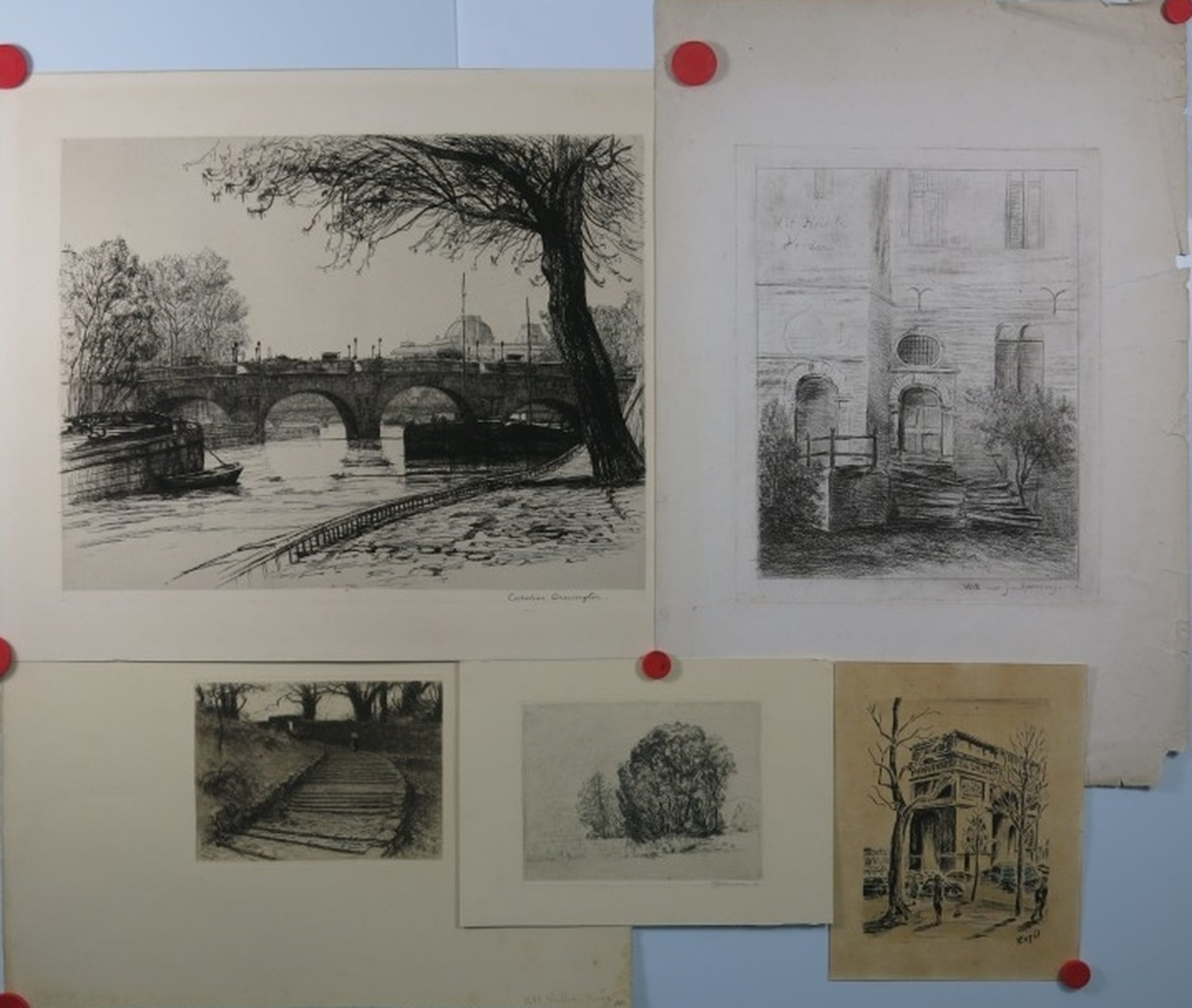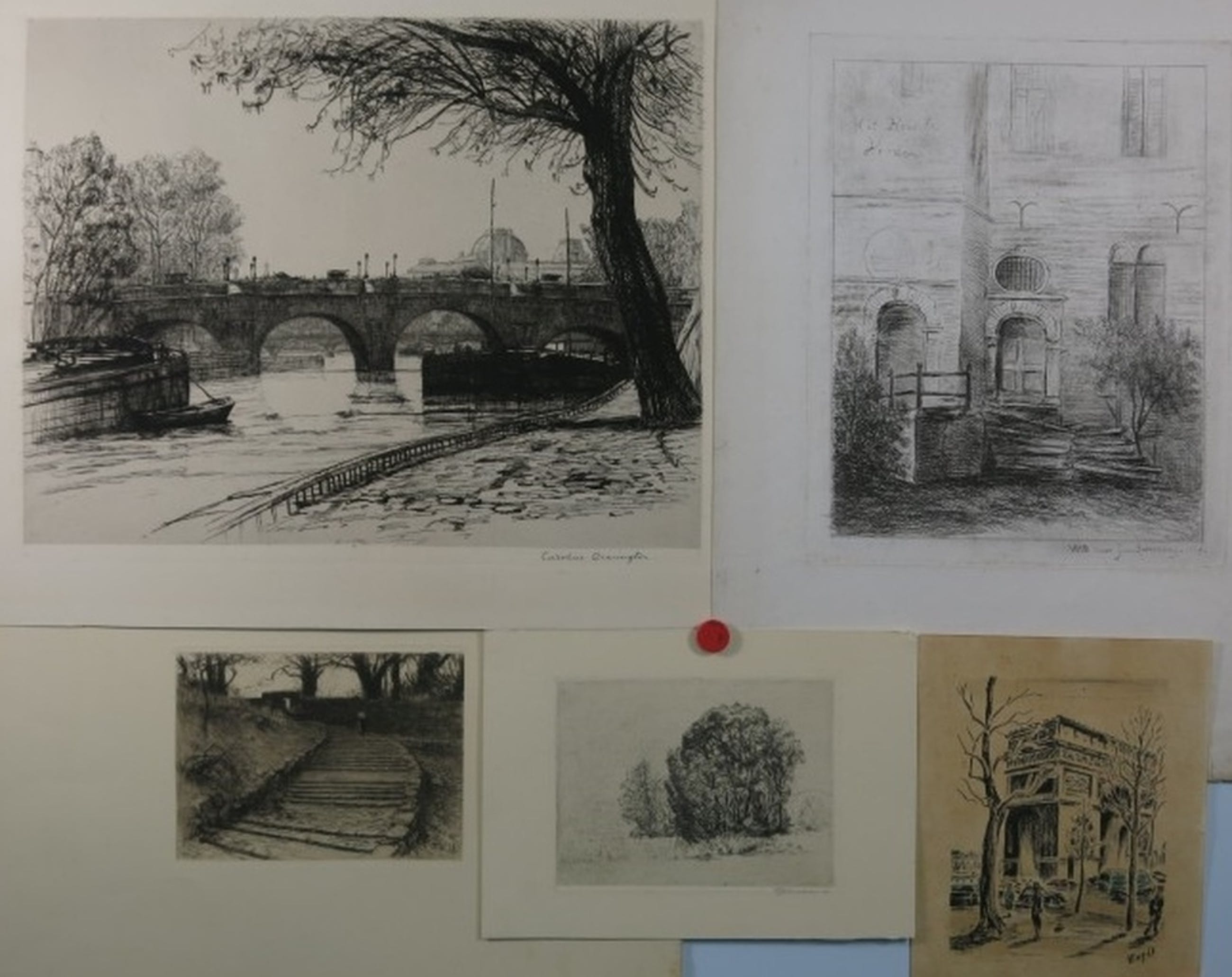 4 etsen en een druk, waaronder een ets van Caroline Armington: