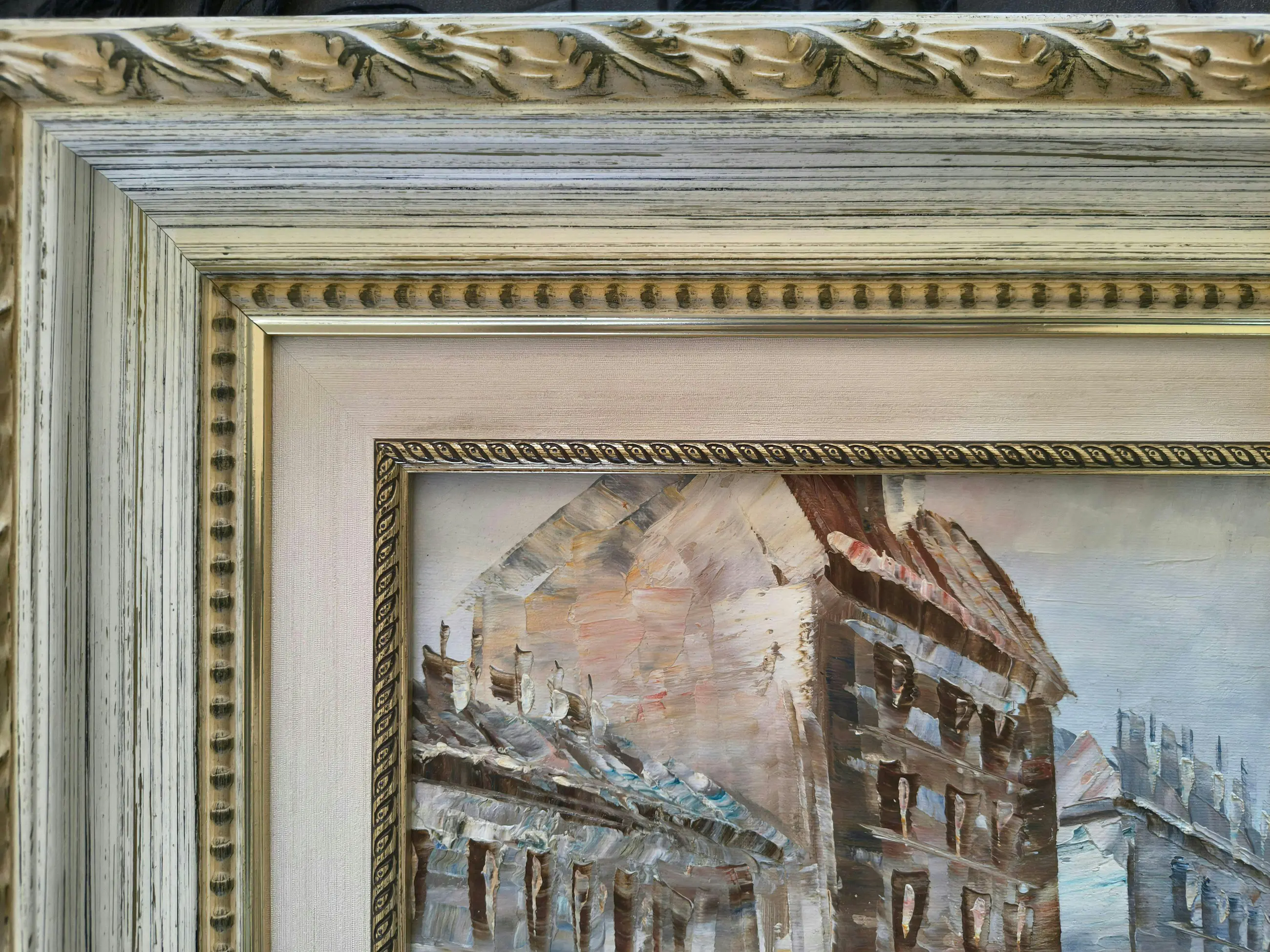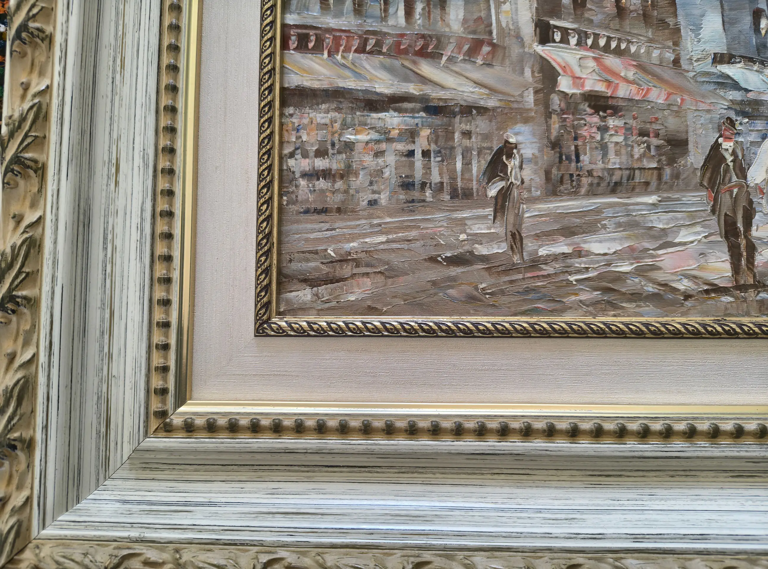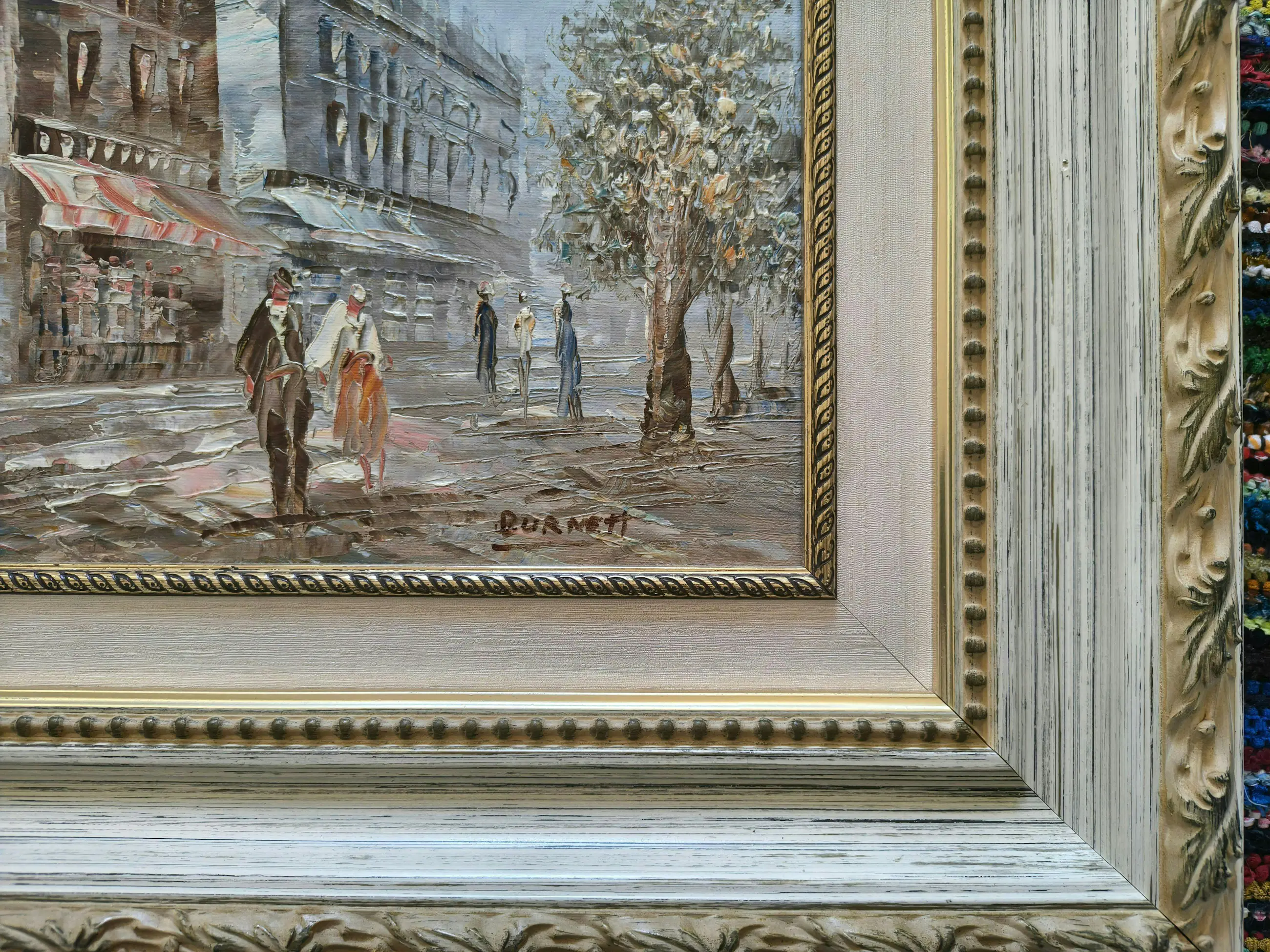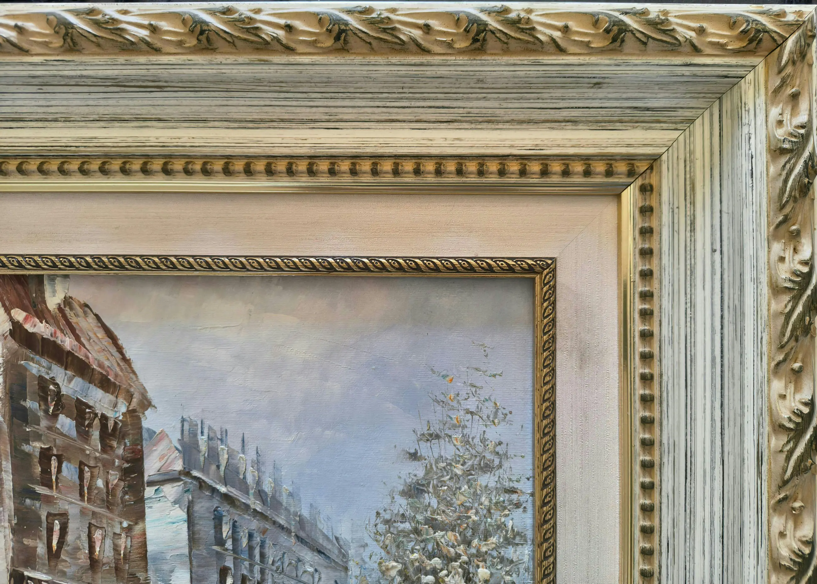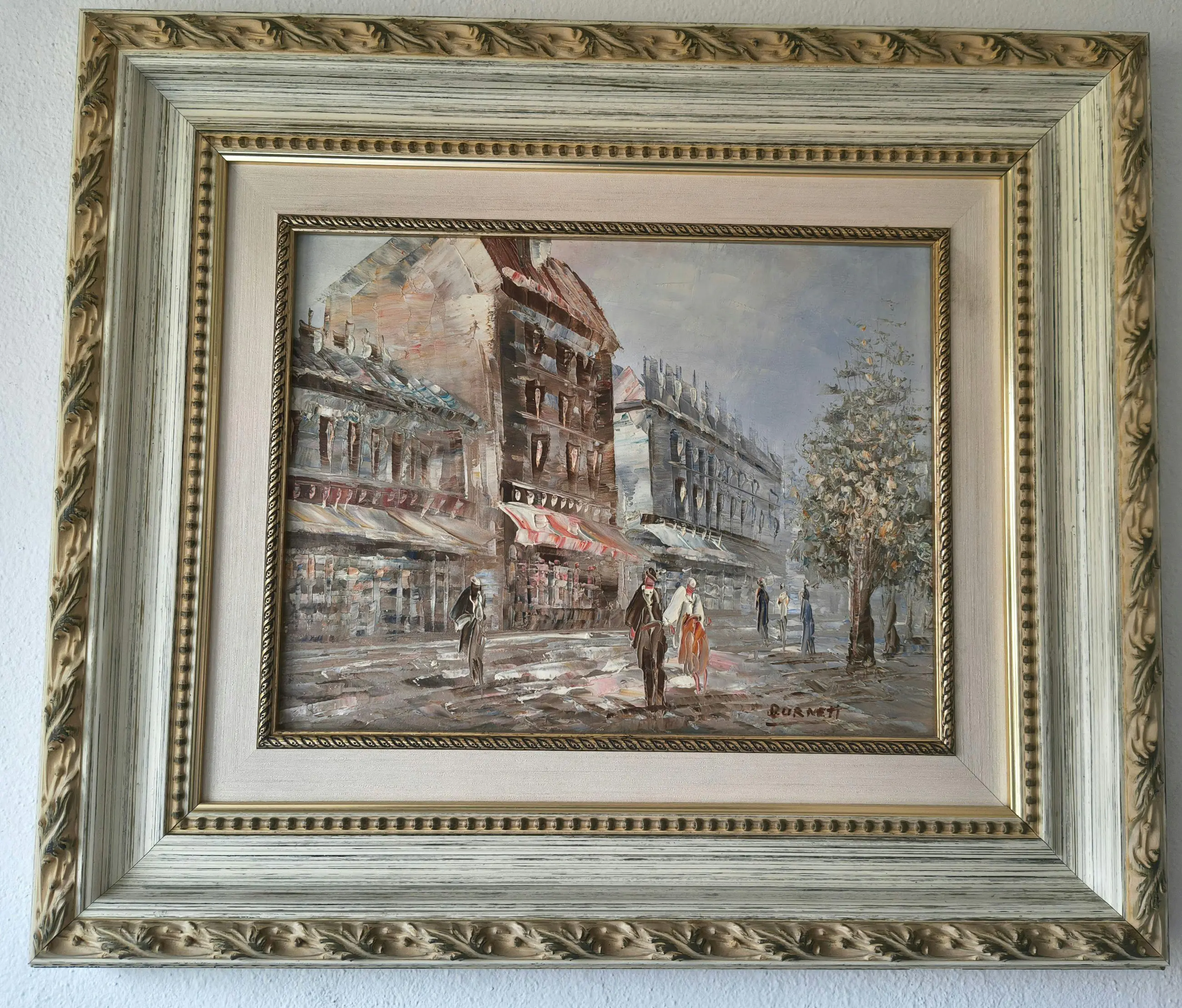 Sfeervol stadsgezicht van een Parijse boulevard in impressionistische stijl, uitgevoerd in olieverf op doek. Het werk is gevat in een klassieke goudkleurige ornamentlijst.