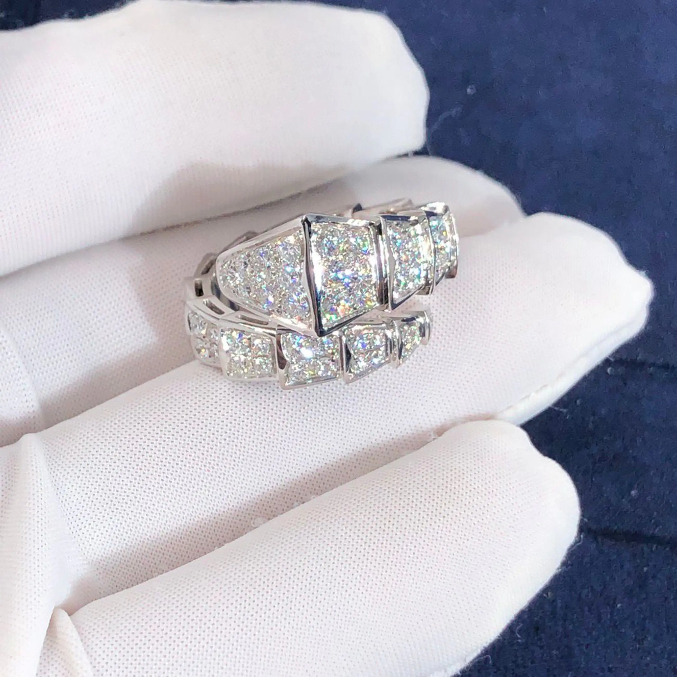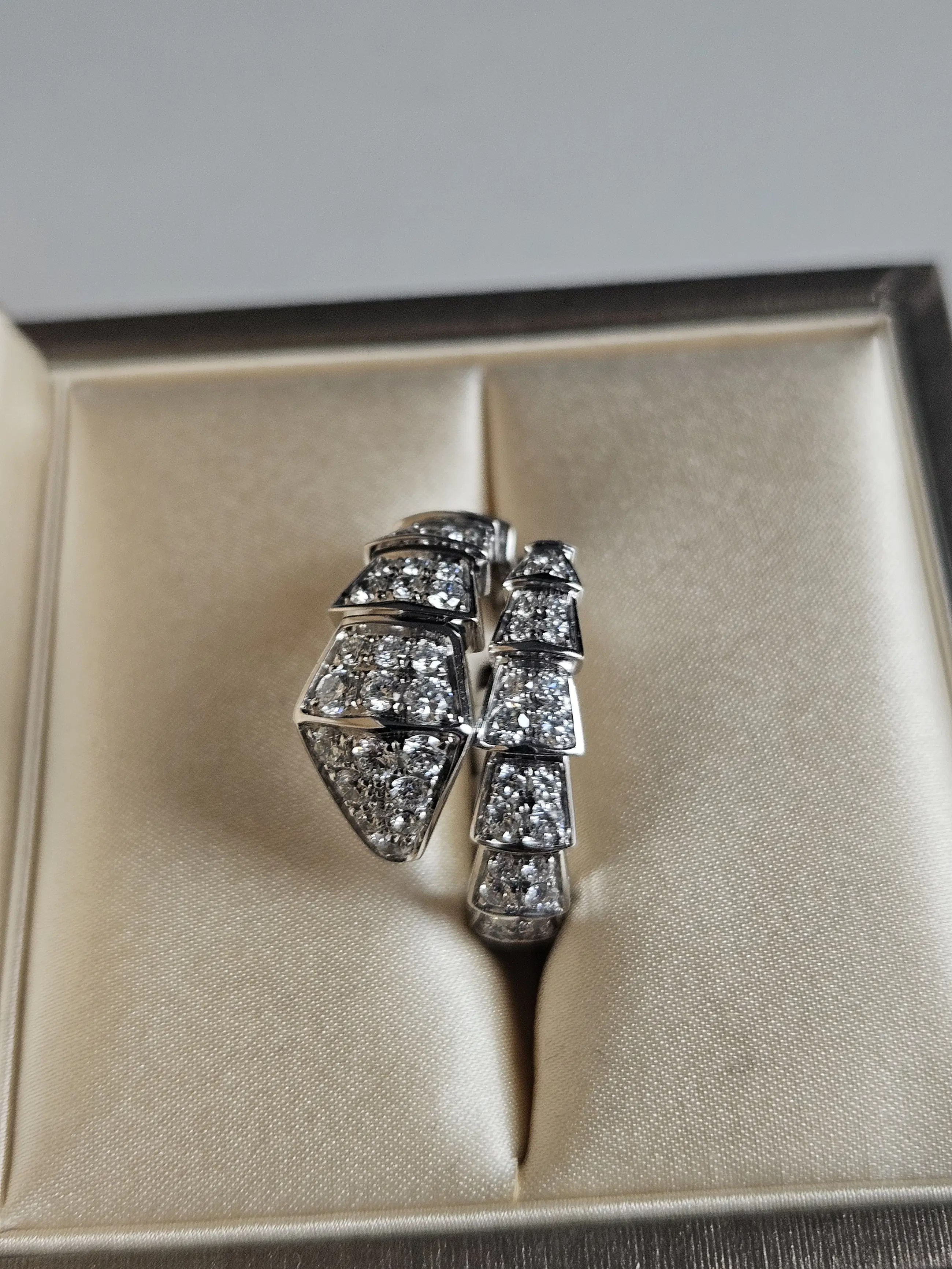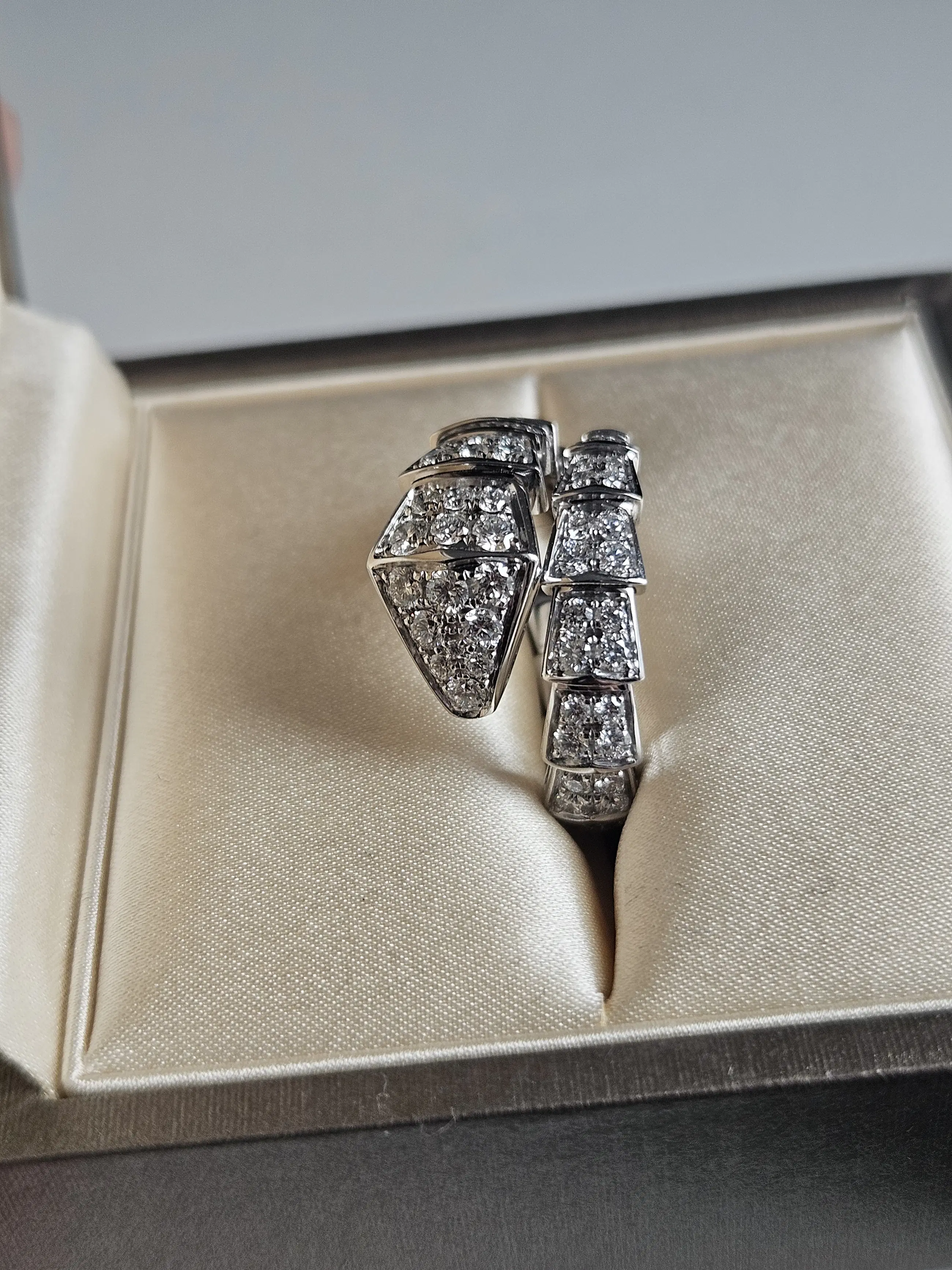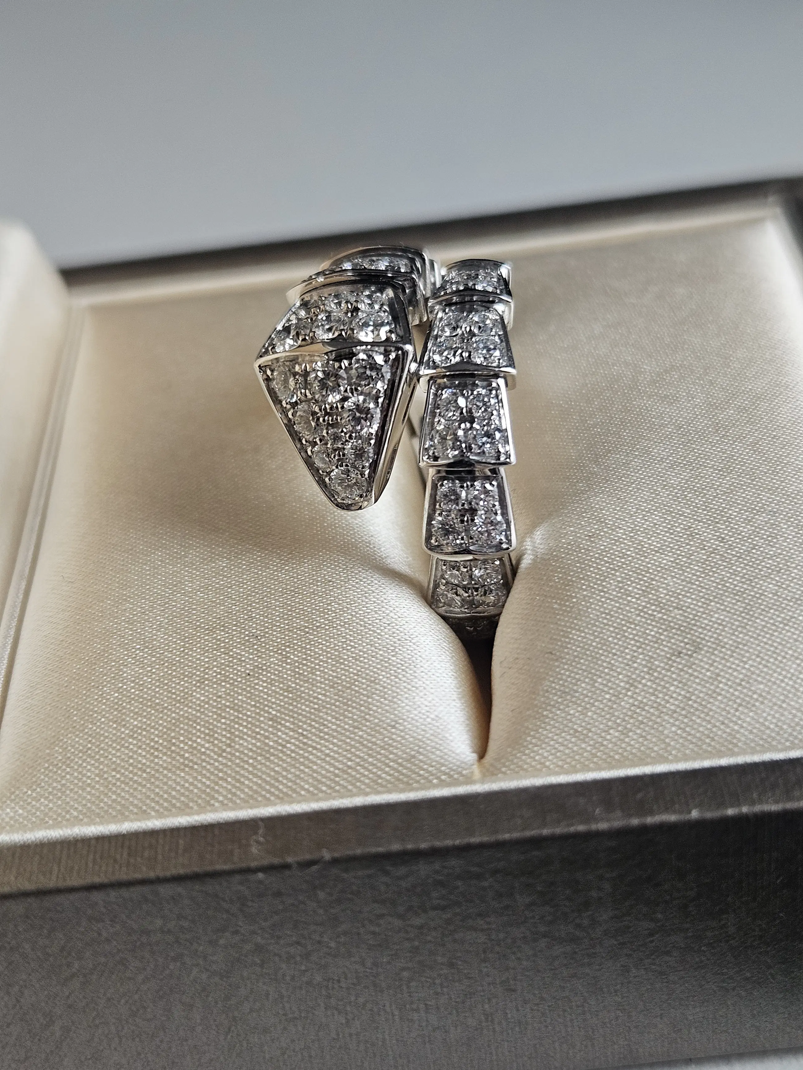 Een verfijnde diamanten ring vervaardigd van 18-karaats goud, met een elegant slangvormig design geïnspireerd op de iconische Serpenti-stijl van Bvlgari. De ring wikkelt zich sierlijk om de vinger en is bezet met fonkelende diamanten die zorgen voor een luxe en krachtige uitstraling. Let op: dit betreft geen origineel Bvlgari sieraad, maar een ontwerp geïnspireerd op deze stijl.