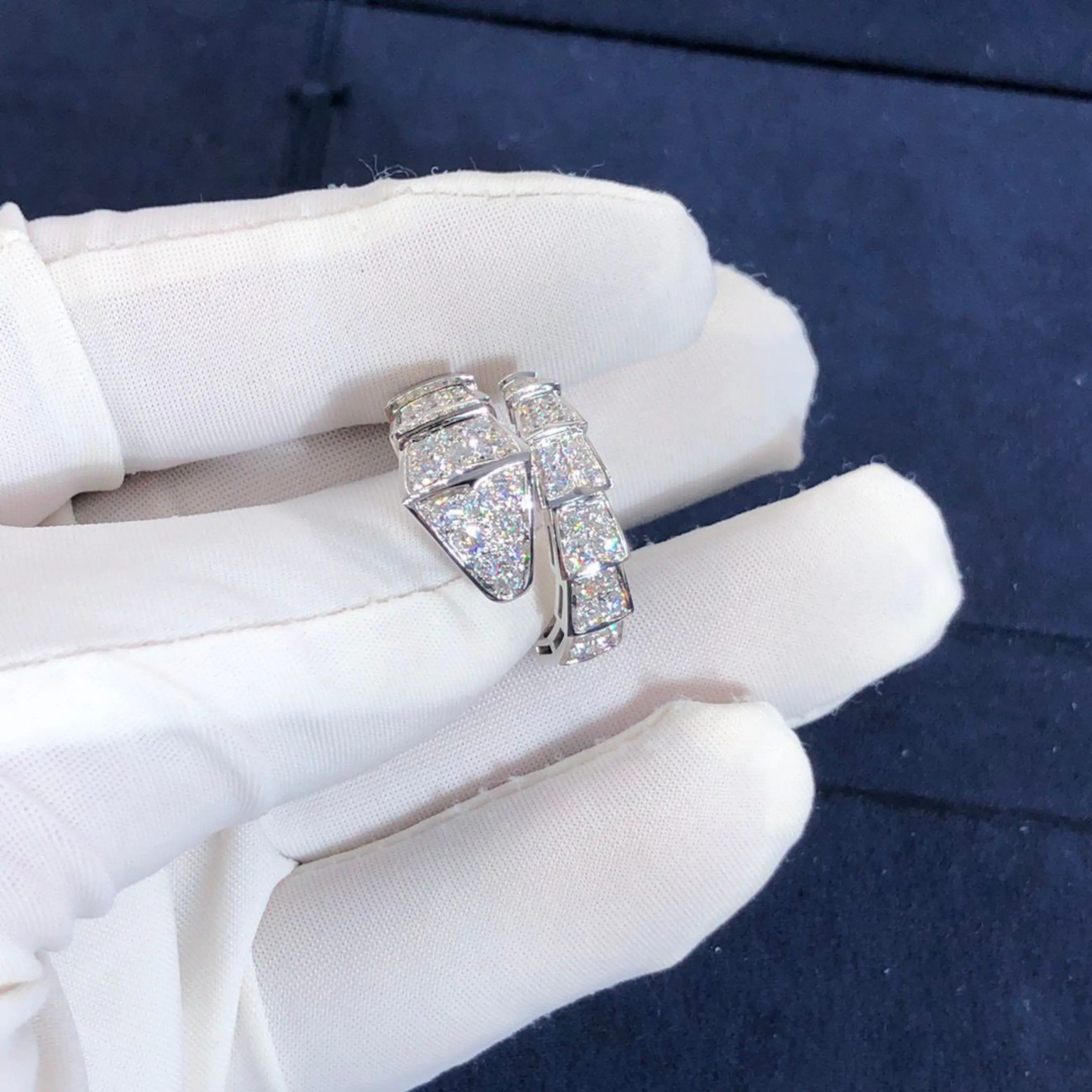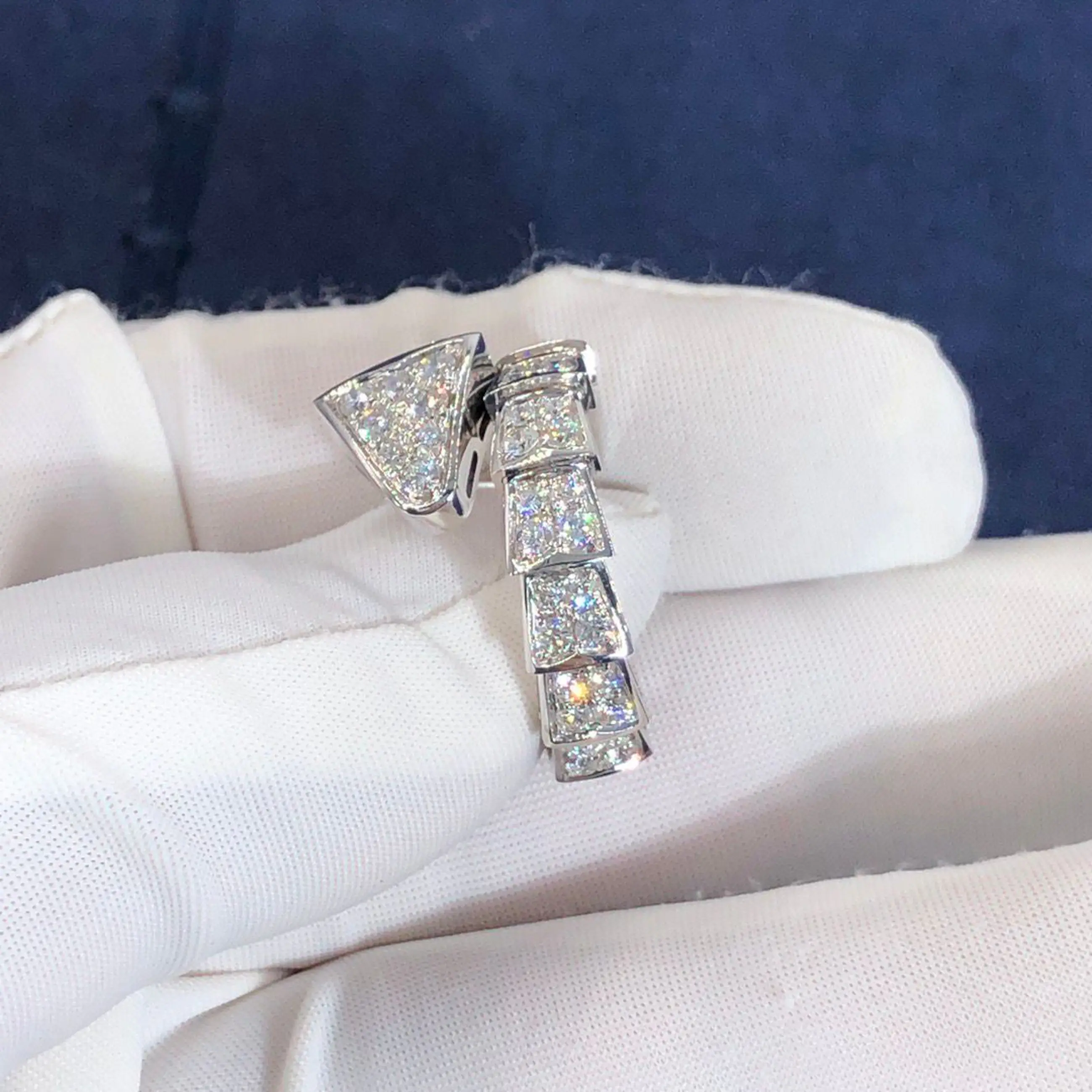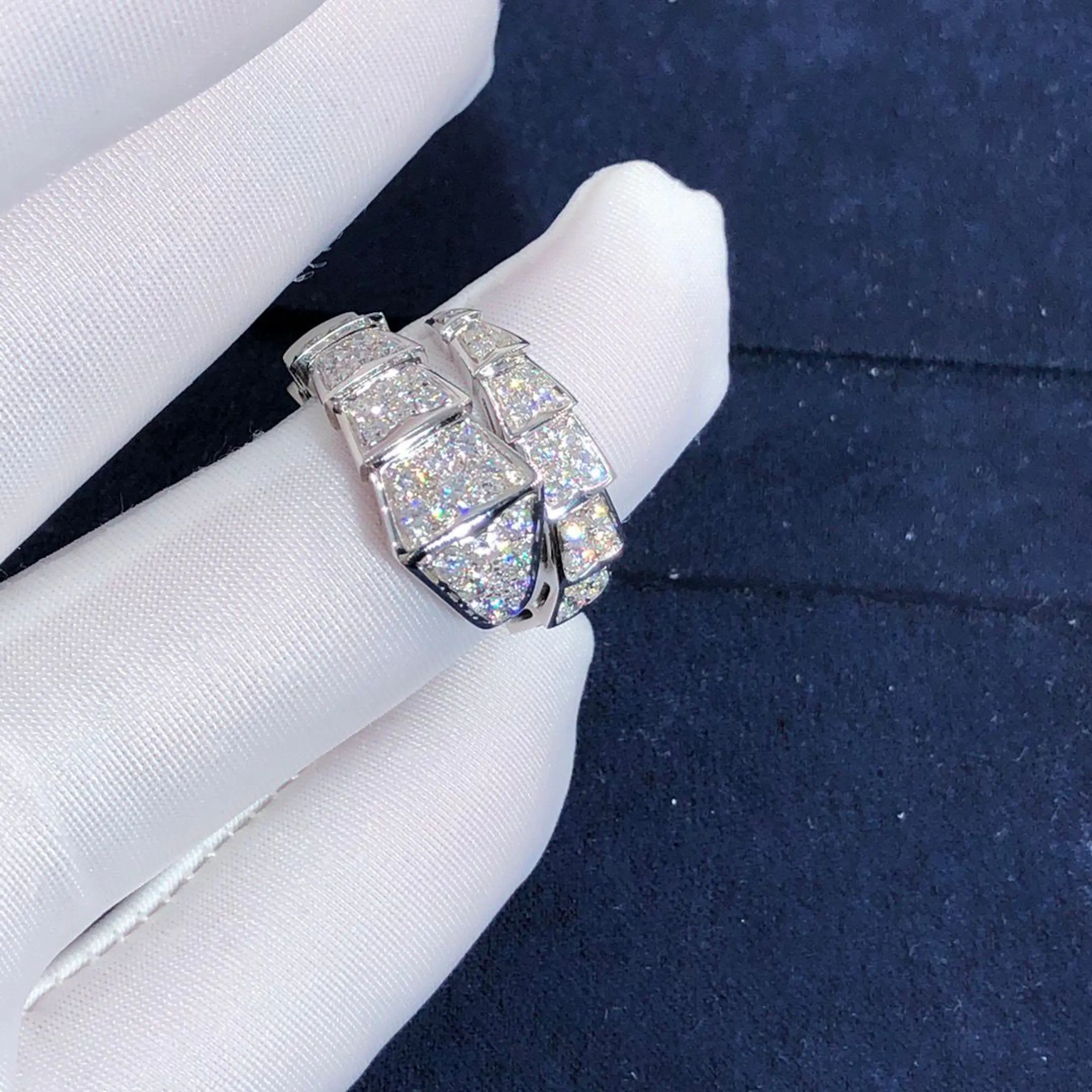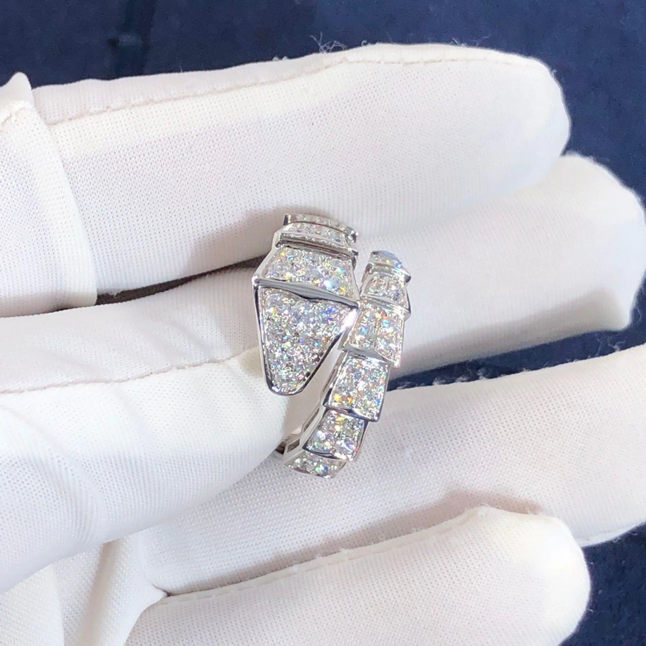 Een verfijnde diamanten ring vervaardigd van 18-karaats goud, met een elegant slangvormig design geïnspireerd op de iconische Serpenti-stijl van Bvlgari. De ring wikkelt zich sierlijk om de vinger en is bezet met fonkelende diamanten die zorgen voor een luxe en krachtige uitstraling. Let op: dit betreft geen origineel Bvlgari sieraad, maar een ontwerp geïnspireerd op deze stijl.