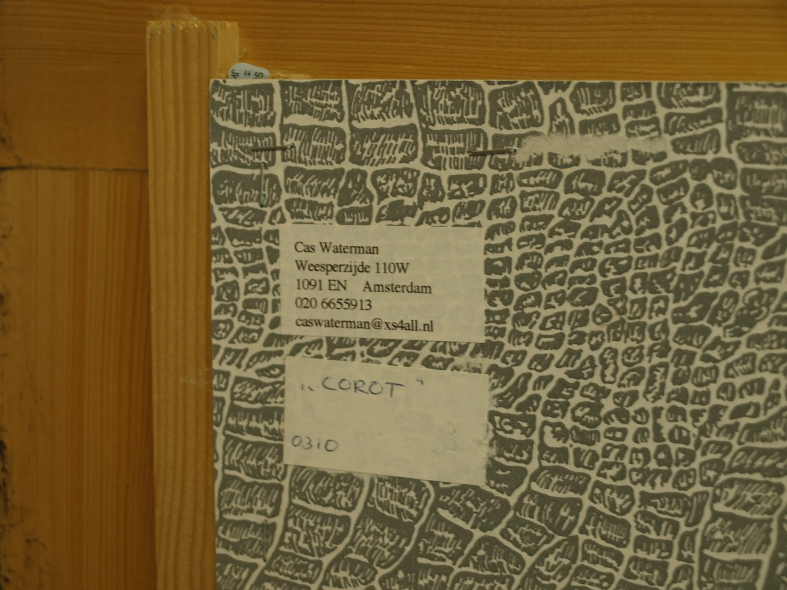 Een groot schilderij uit 2003 van de Nederlandse kunstenaar Cas Waterman (1958-), getiteld “Corot”. -Techniek: Olieverf op doek en ingelijst in een houten lijst. Kan zo aan de muur. -Gesigneerd linksonder (‘Cas’). Op de achterkant van de lijst zitten stickers van de kunstenaar. -Afmetingen: Lijst, 81 x 101 x 2½ cm. Beeld, 61 x 81 cm. -Herkomst: Uit een inboedel. De oorspronkelijke galerieprijs was € 3250,-. -Conditie: In zeer goede staat. Zie ook de foto’s voor een eigen indruk. Kan zo aan de muur.