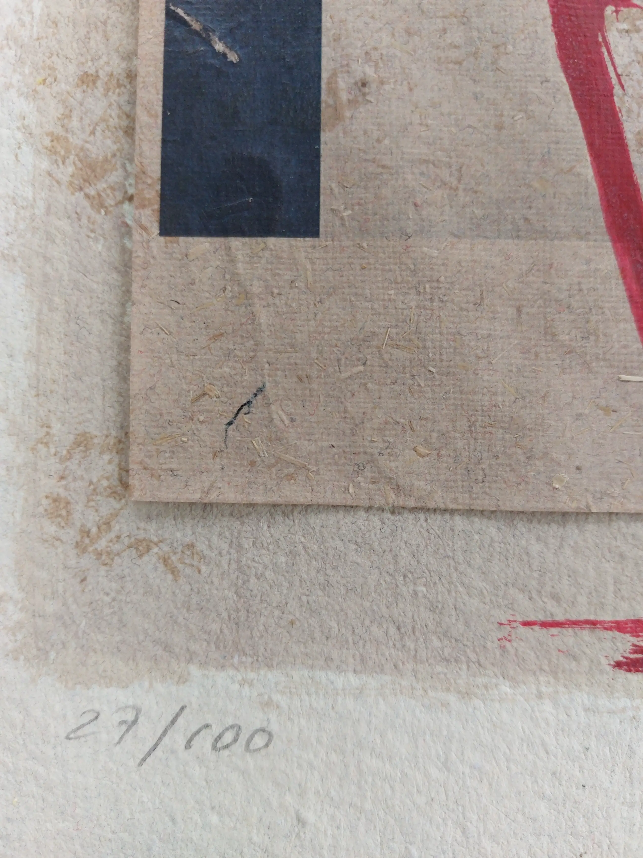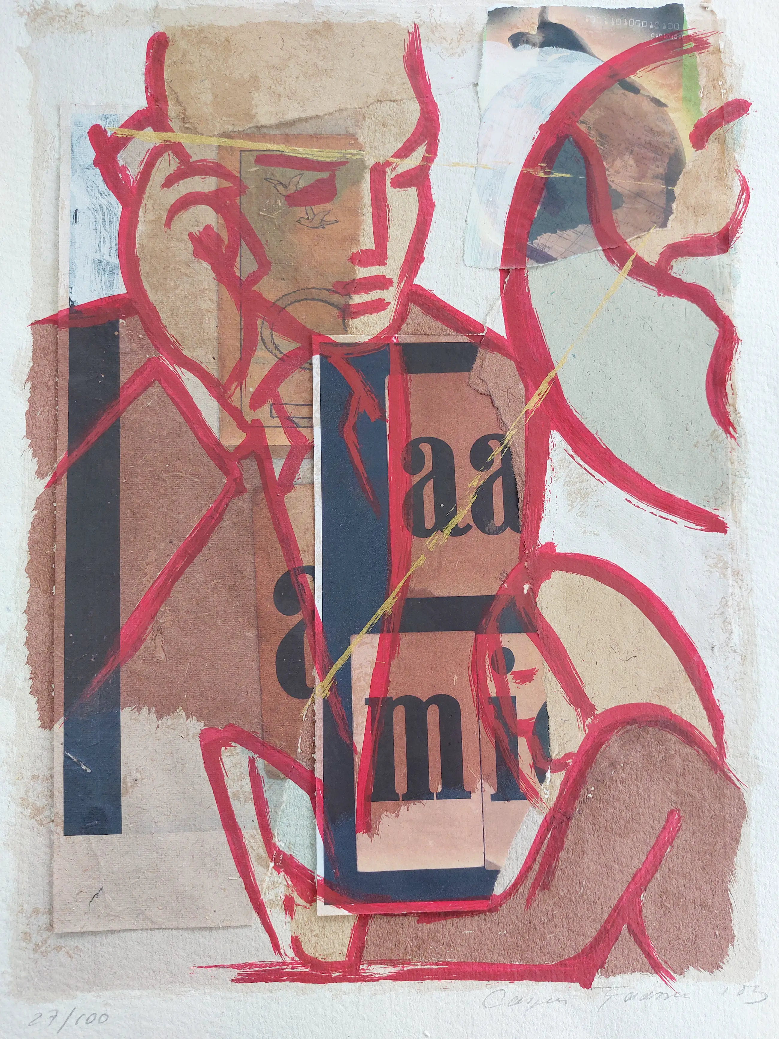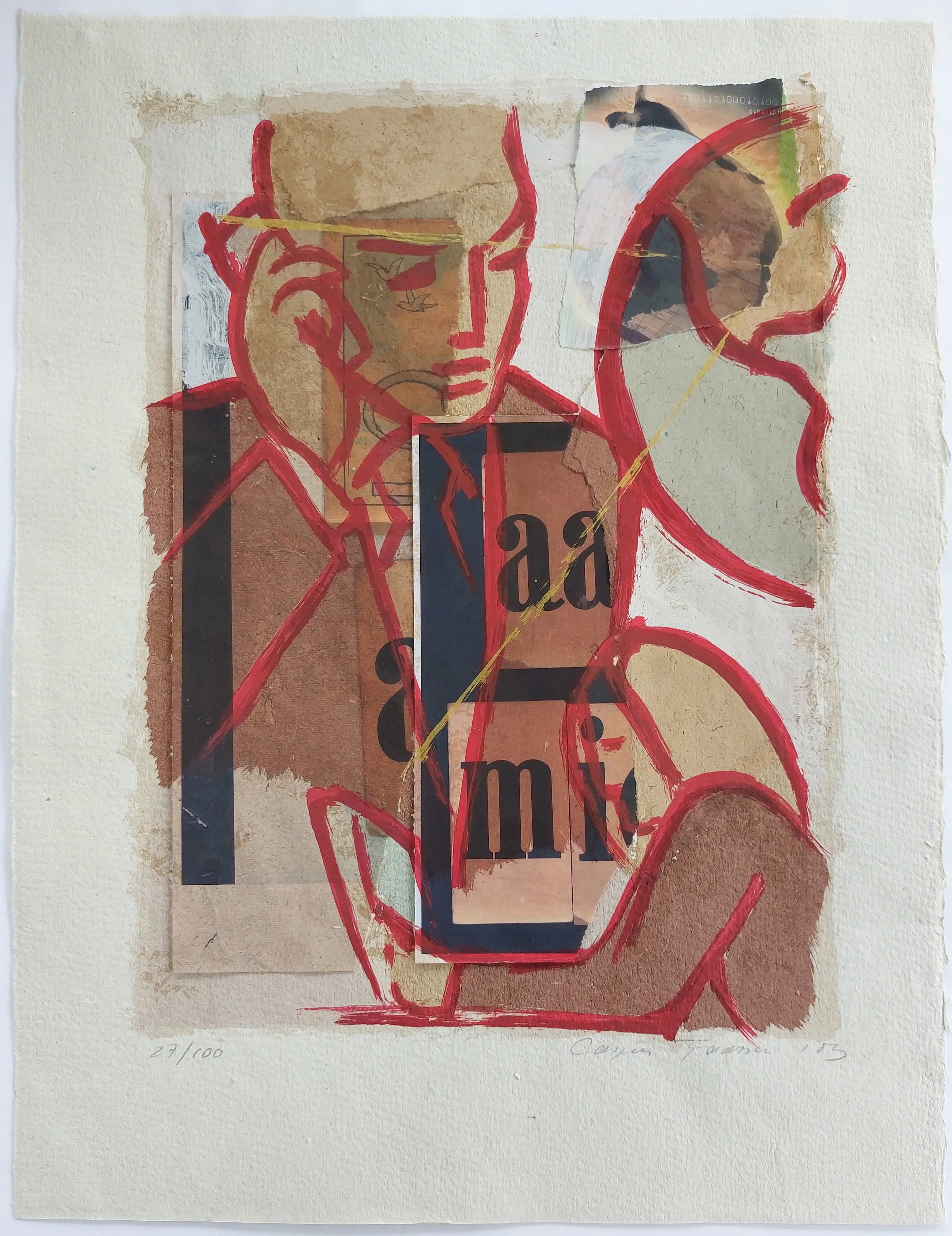 Een zeer fraaie, handbewerkte collage van vellen papier met zeefdruk en acrylverf van Casper Faassen. Uit de serie Aap, noot, Mies. Elk werk is uniek geworden. In potlood handgesigneerd en genummerd (oplage 100 ex., dit is no. 27).