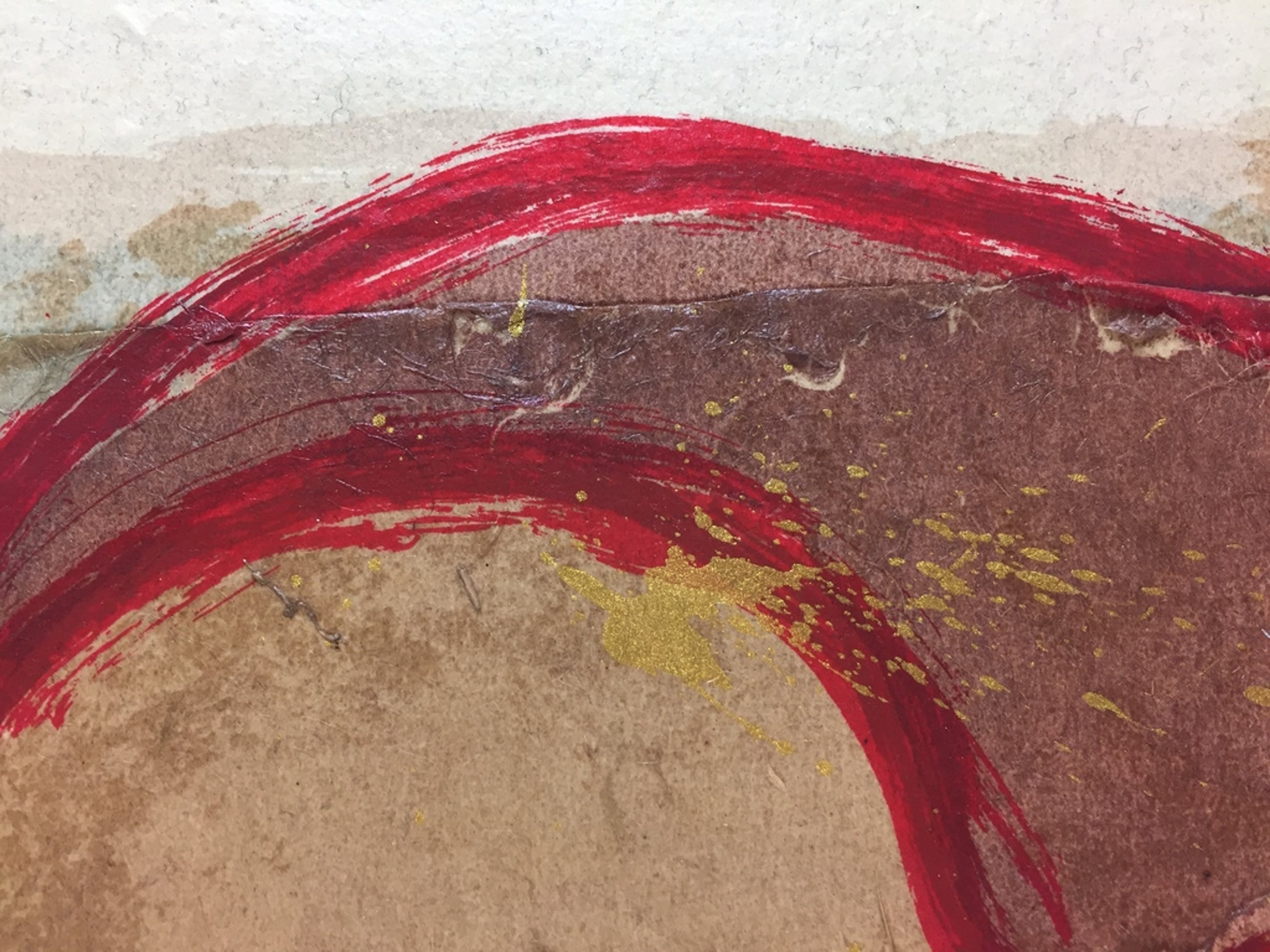 Gemengde techniek - zeefdruk, collage, spuitbus, goudverf. De zeefdrukken zijn op door de kunstenaar voorbewerkte collages gedrukt, dit maakt de afzonderlijke zeefdrukken / collages uniek.