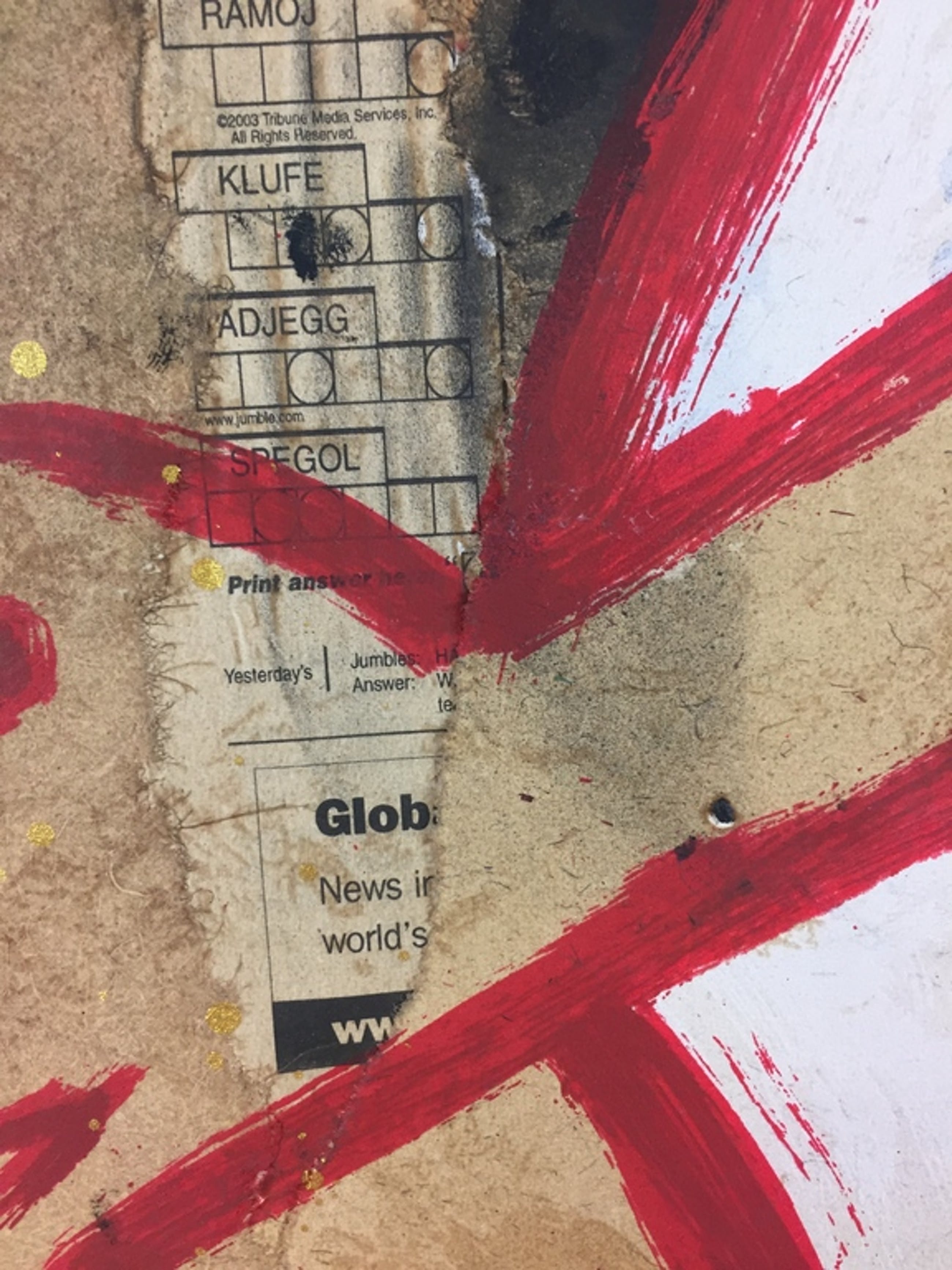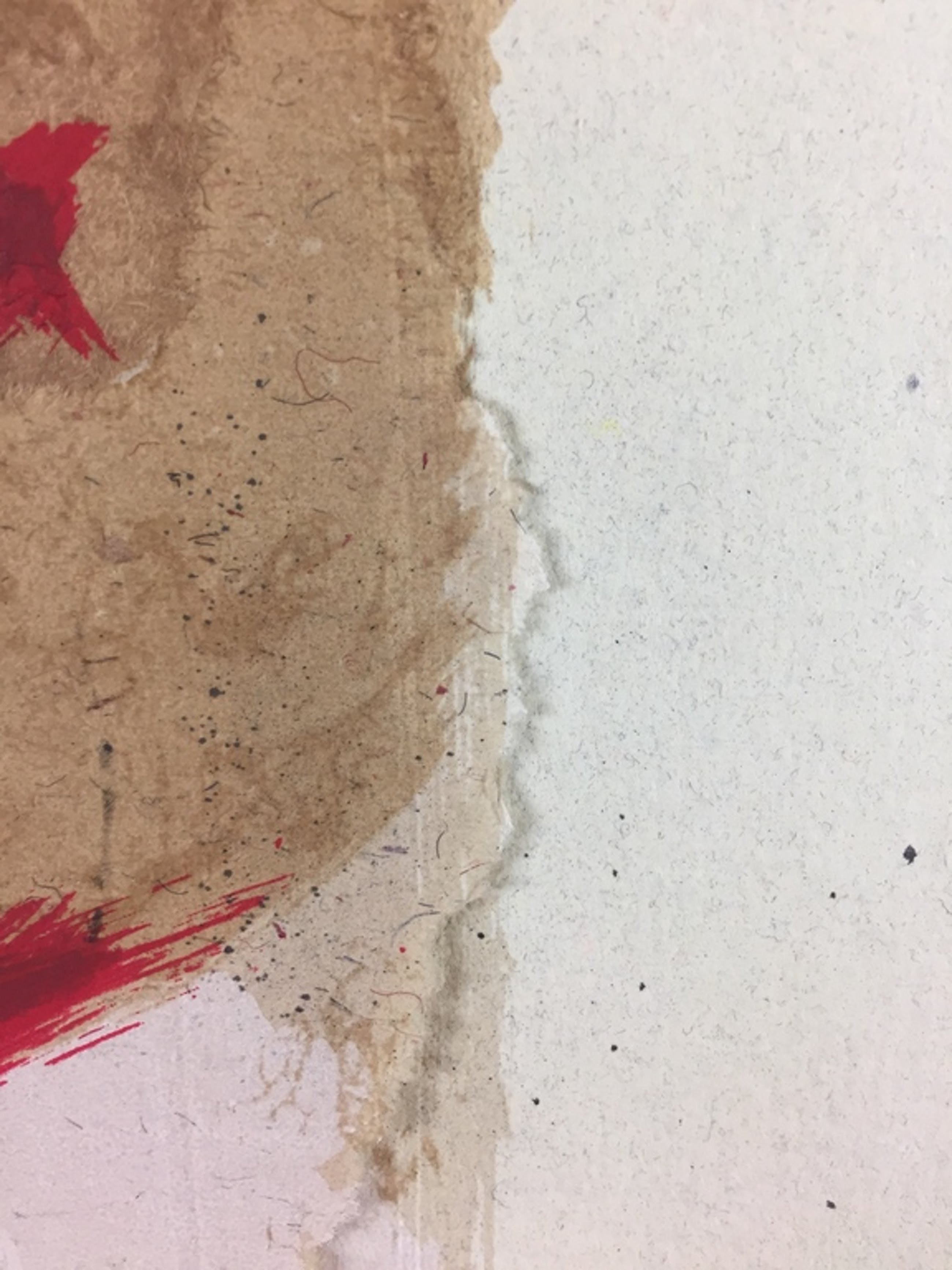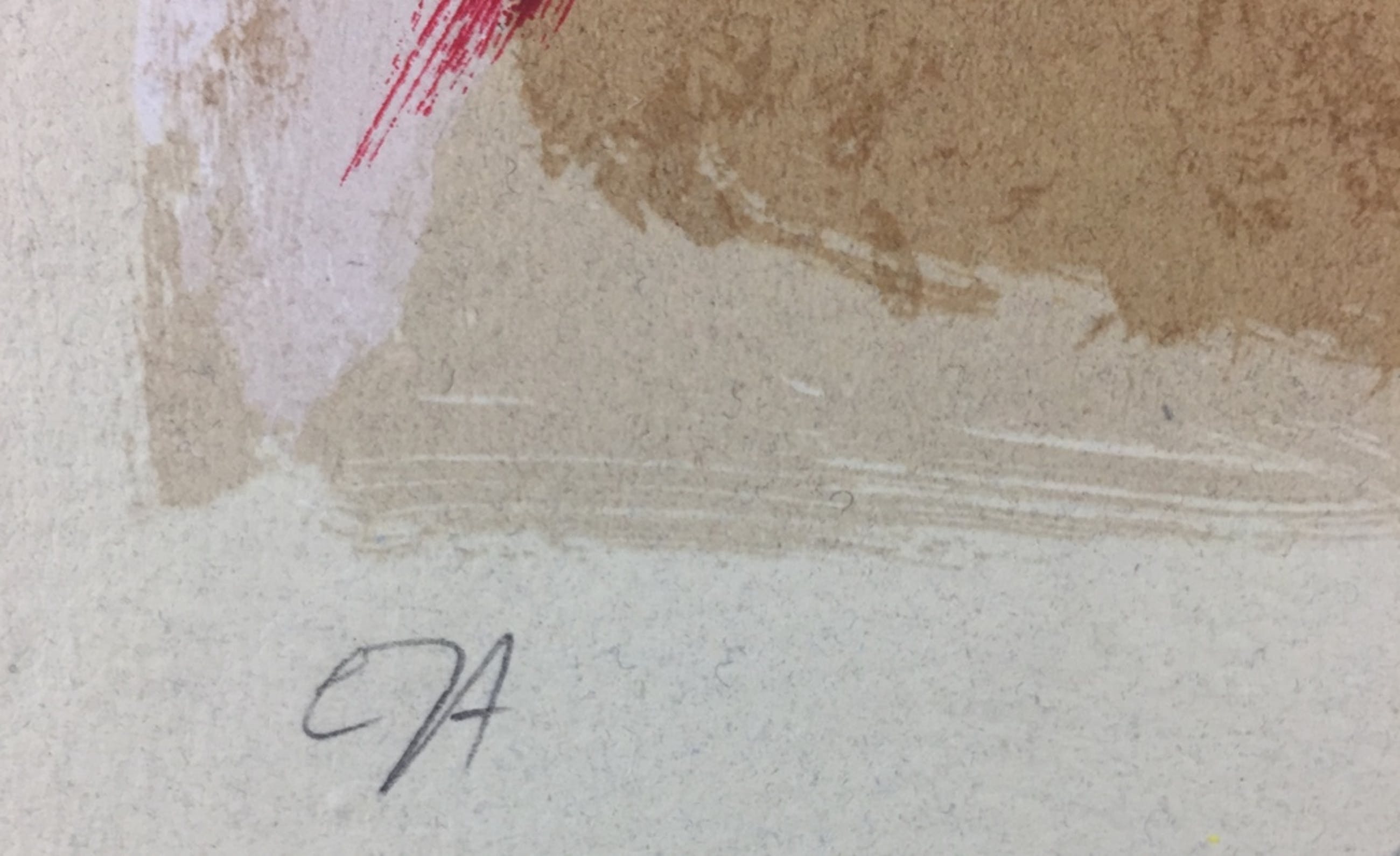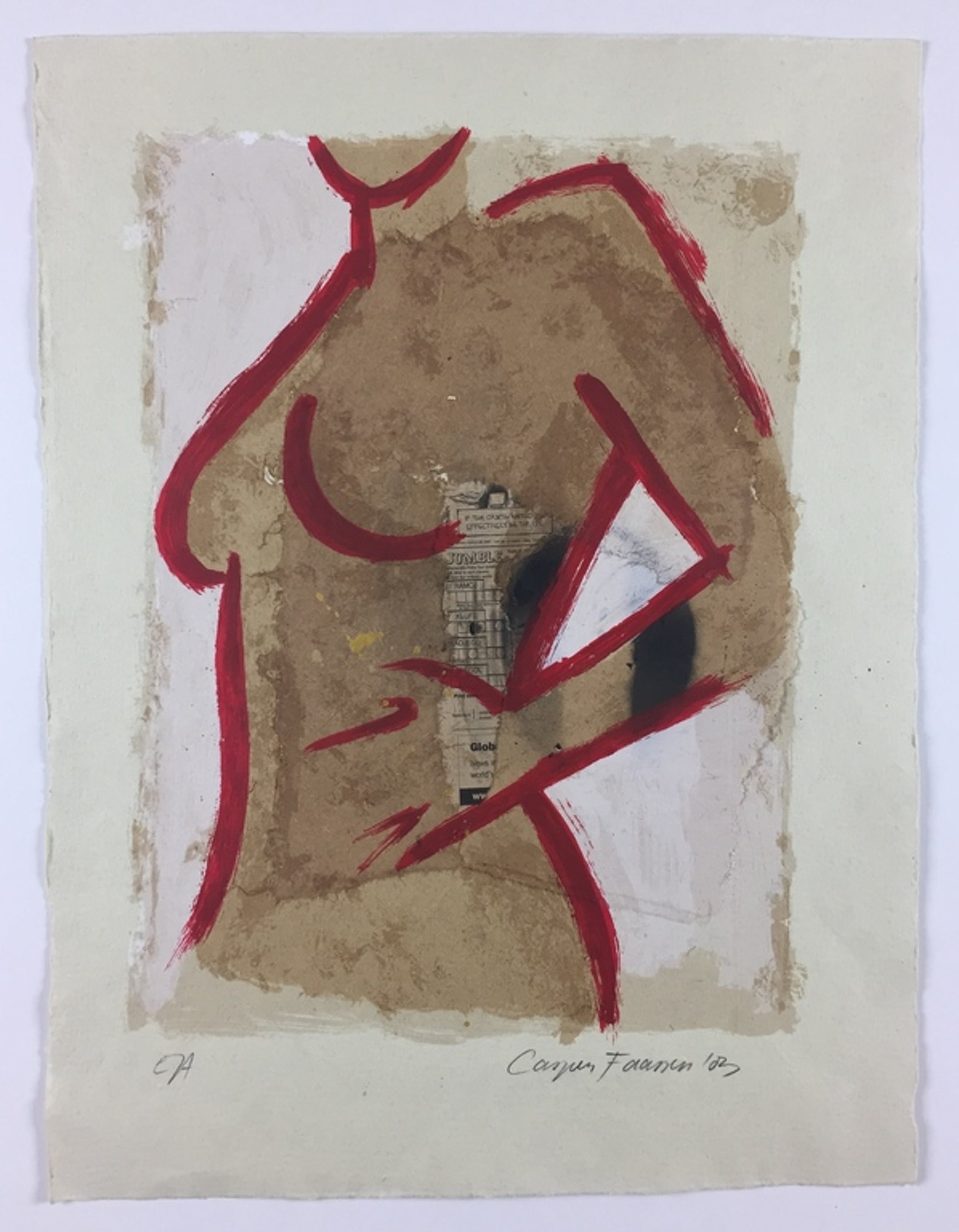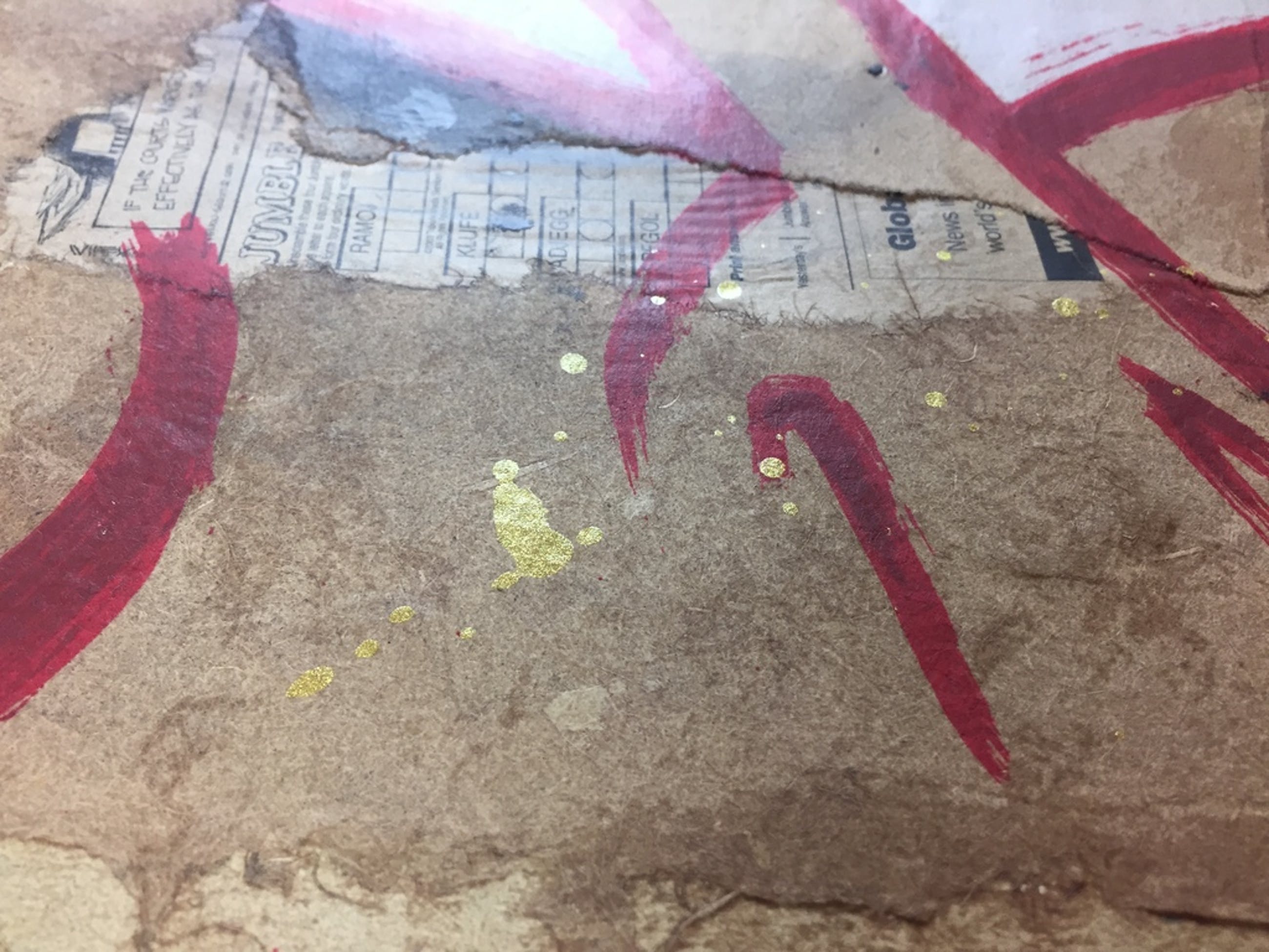 Gemengde techniek - zeefdruk, collage, spuitbus, goudverf. De zeefdrukken zijn op door de kunstenaar voorbewerkte collages gedrukt, dit maakt de afzonderlijke zeefdrukken / collages uniek.