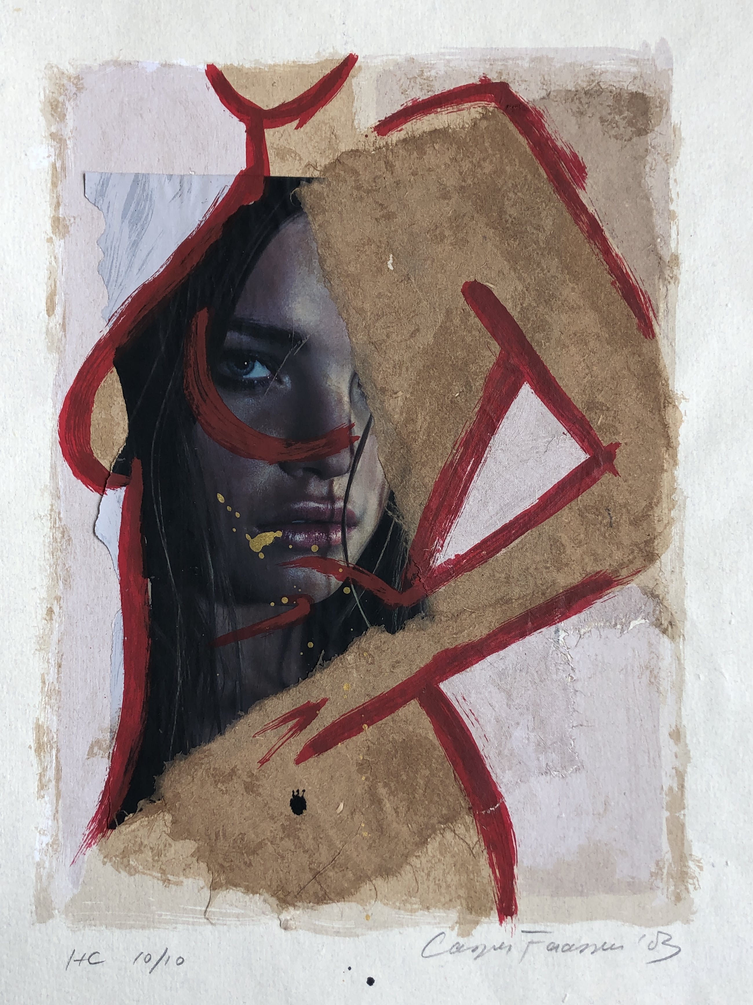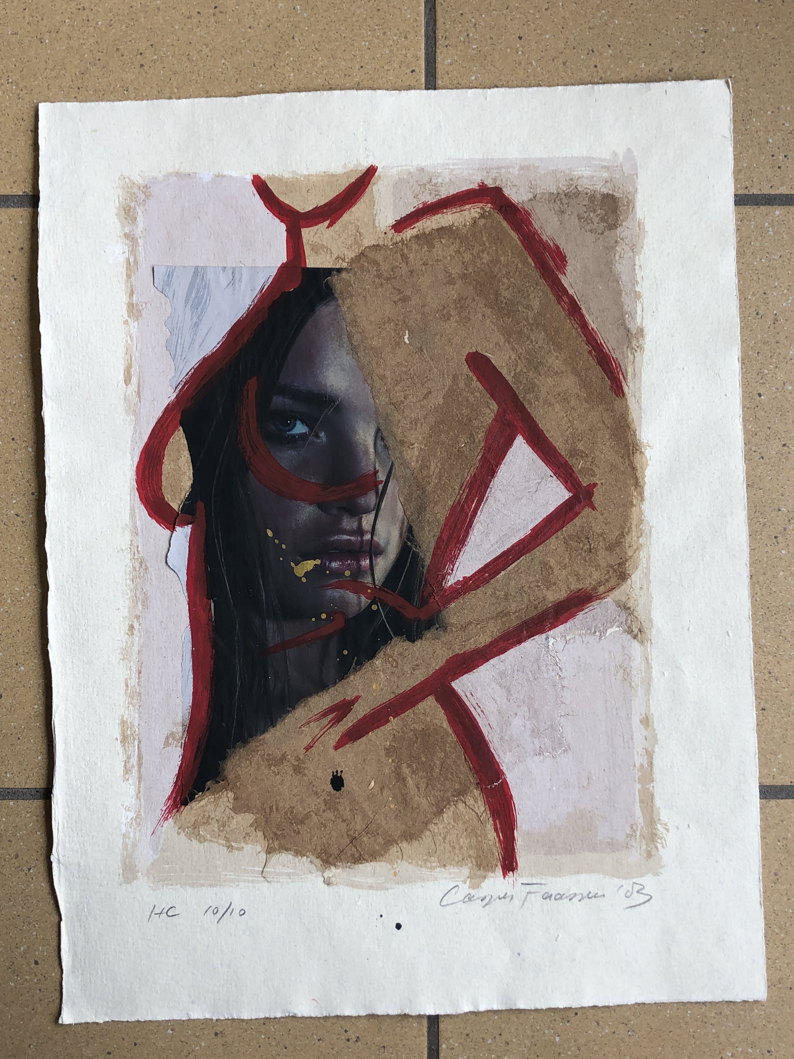 Hand bewerkte(acryl verf en goud verf.)  zeefdruk/collage ( boekpagina's) van Casper Faassen. Elke zeefdruk uit deze serie is uniek, omdat deze collage is bewerkt door de kunstenaar. Het werk verkeert in perfecte conditie.U kunt het werk vooraf komen bekijken bij galerie Rotor of na aankoop ophalen. het werk kan ook verzonden worden via aangetekende post.