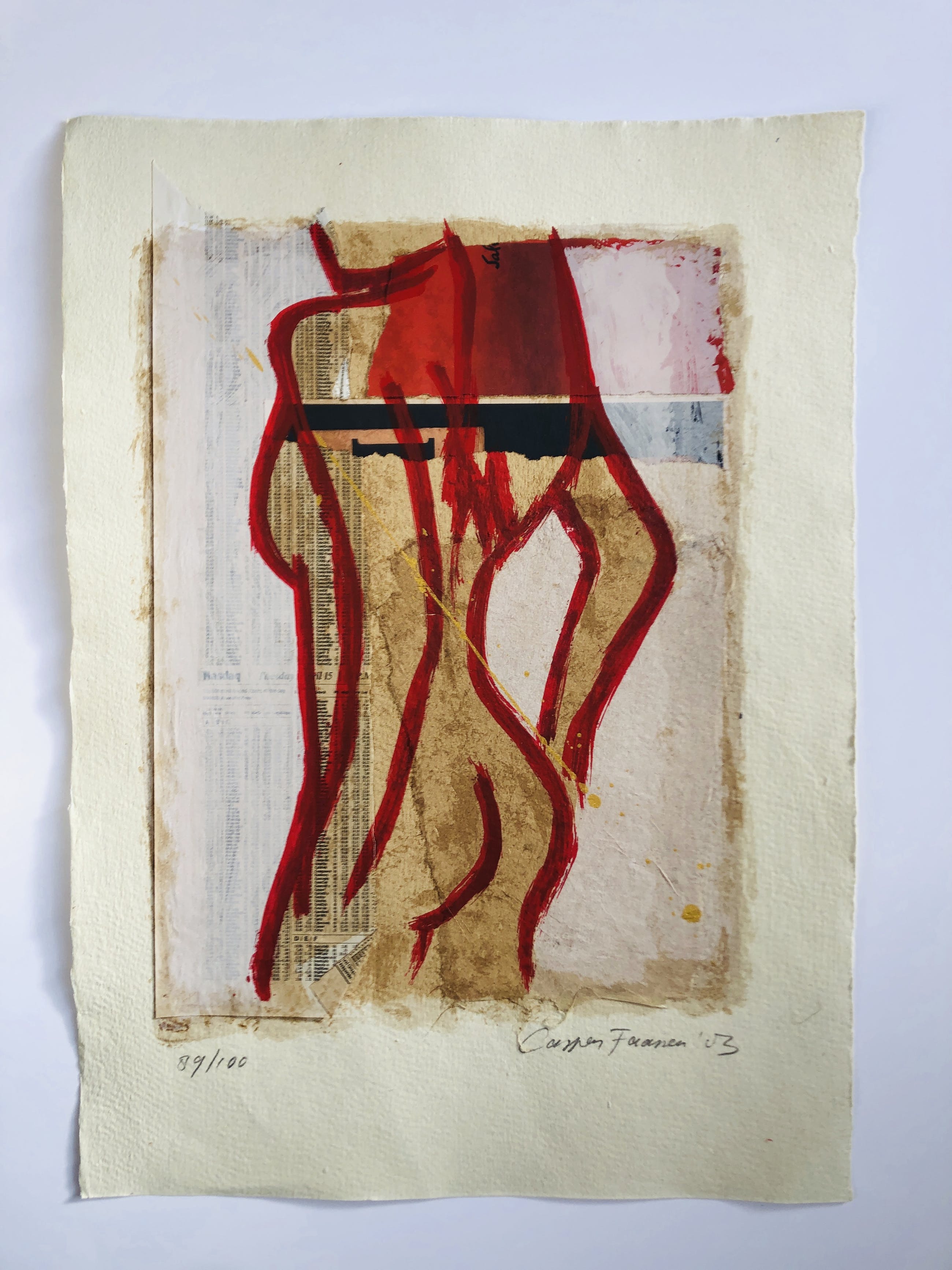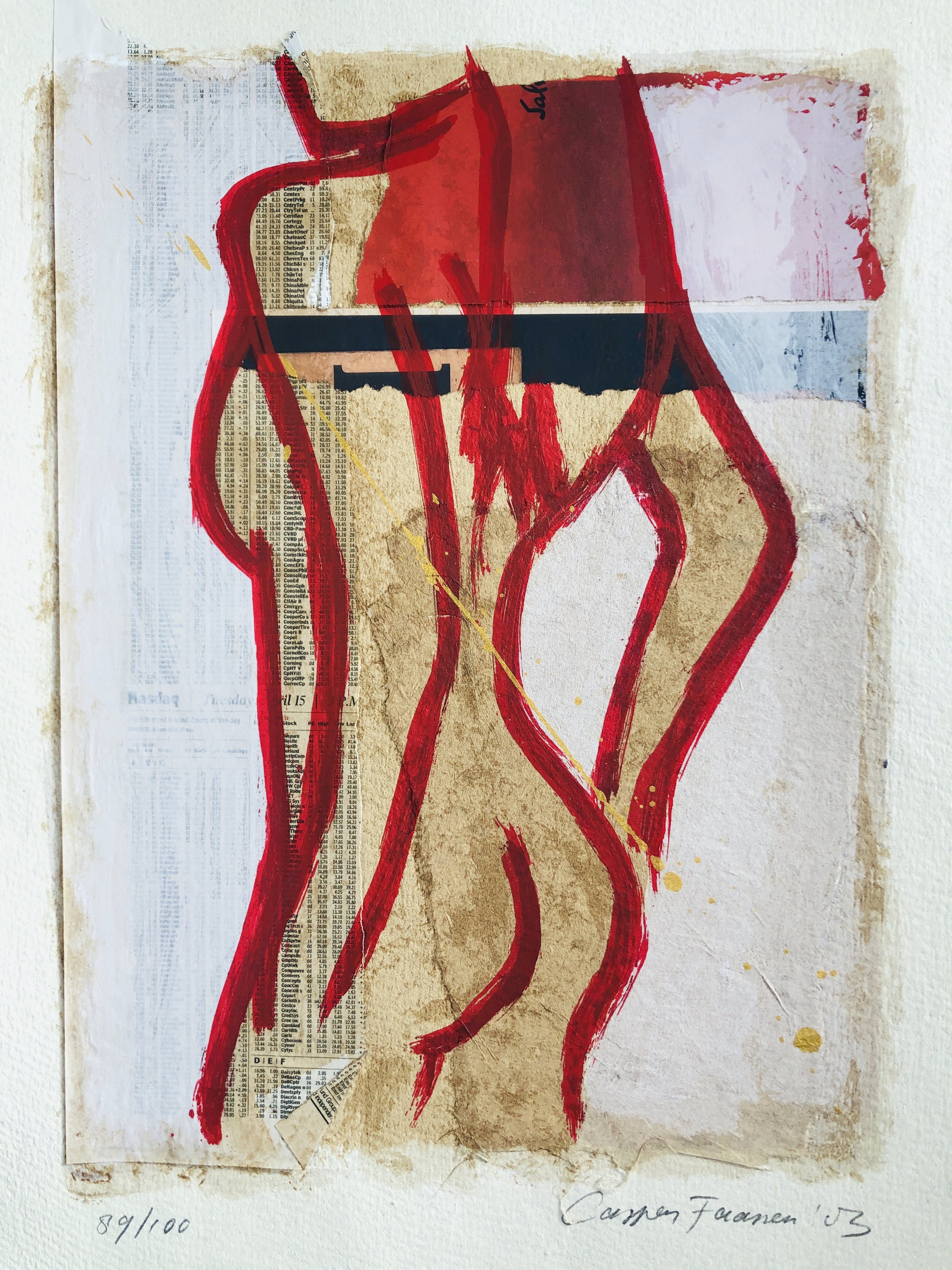 Hand bewerkte(acryl verf en goud verf.) zeefdruk/collage ( boekpagina's) van Casper Faassen. Elke zeefdruk uit deze serie is uniek, omdat deze collage is bewerkt door de kunstenaar. Het werk verkeert in perfecte conditie. U kunt het werk vooraf komen bekijken bij galerie Rotor of na aankoop ophalen. Het werk kan ook verzonden worden via aangetekende post.