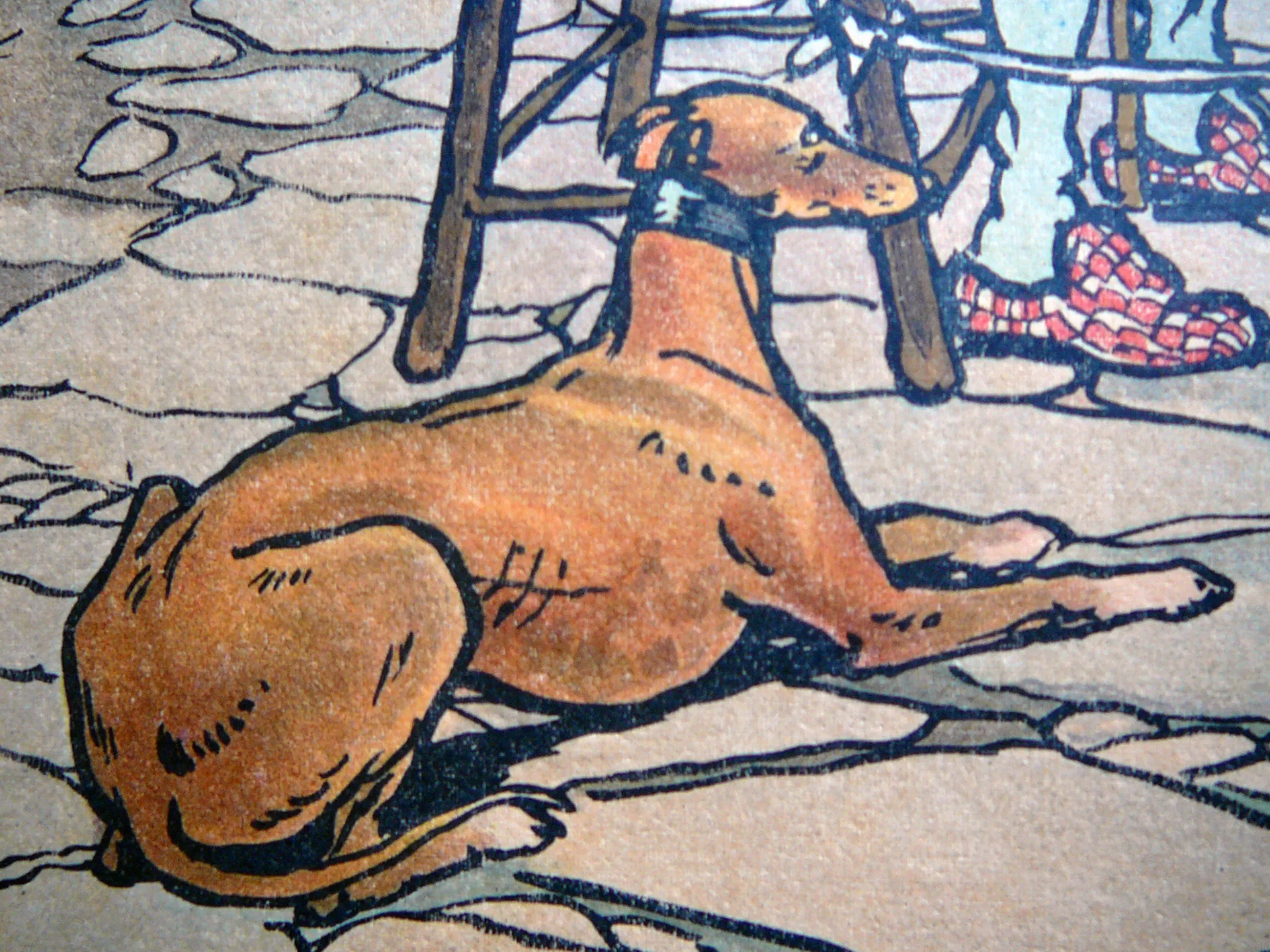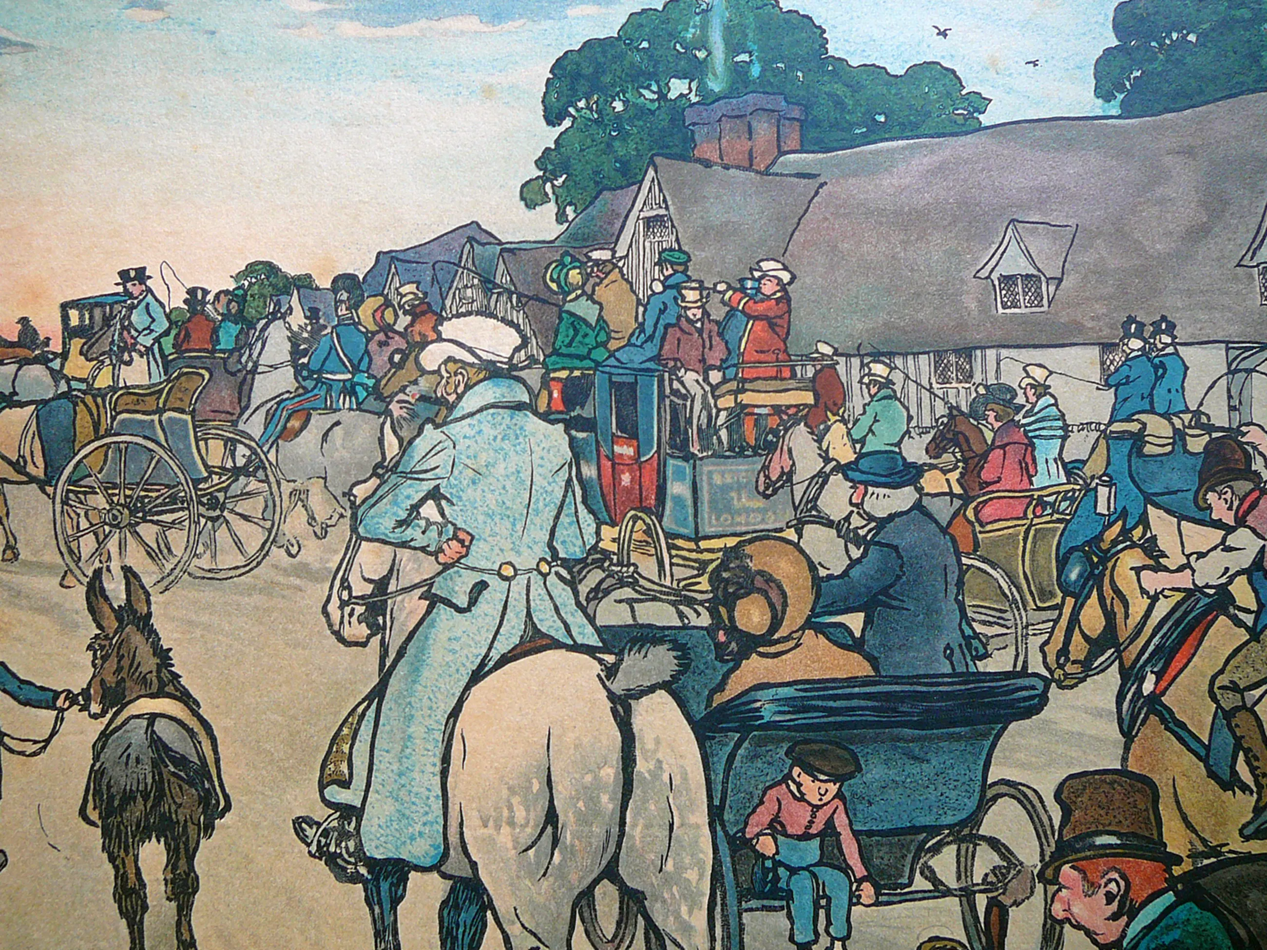 Originele litho van Cecil Aldin, linksonder gesigneerd in de steen en met potlood buiten beeld. Afmeting inclusief passe-partout 53 x 75 cm. Beeldformaat 36 x 59 cm.