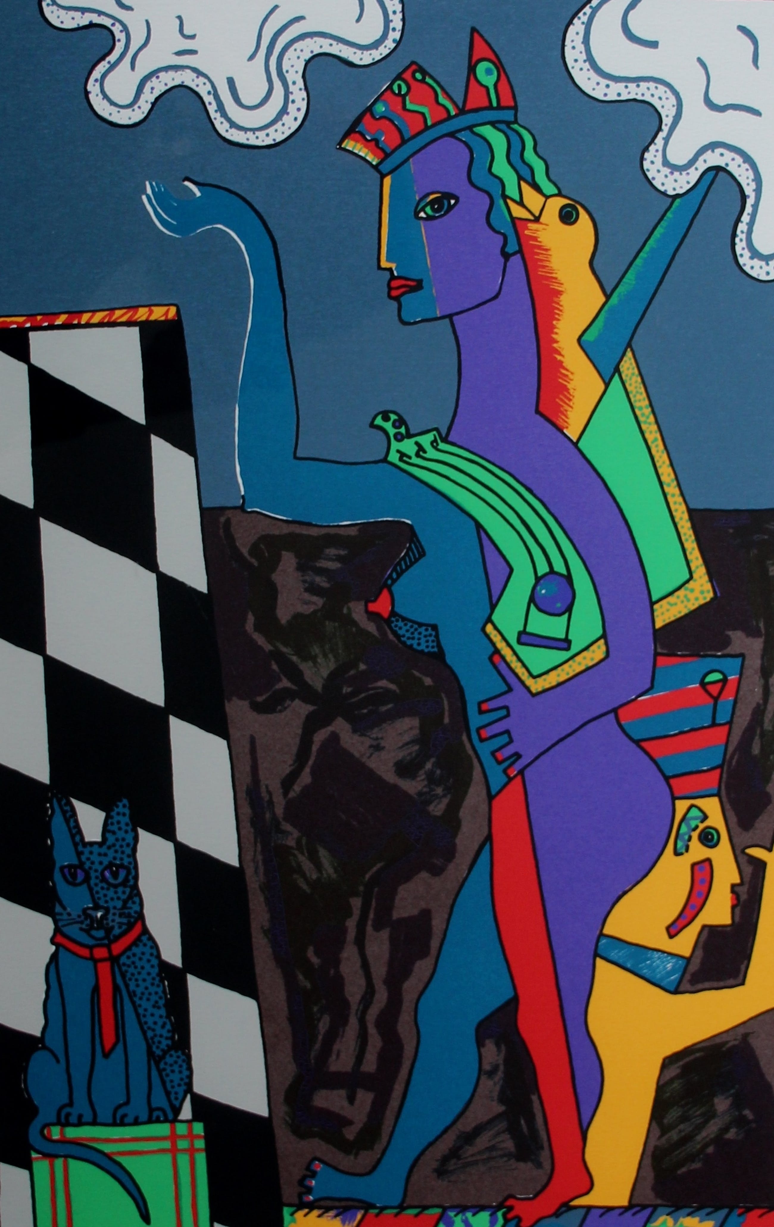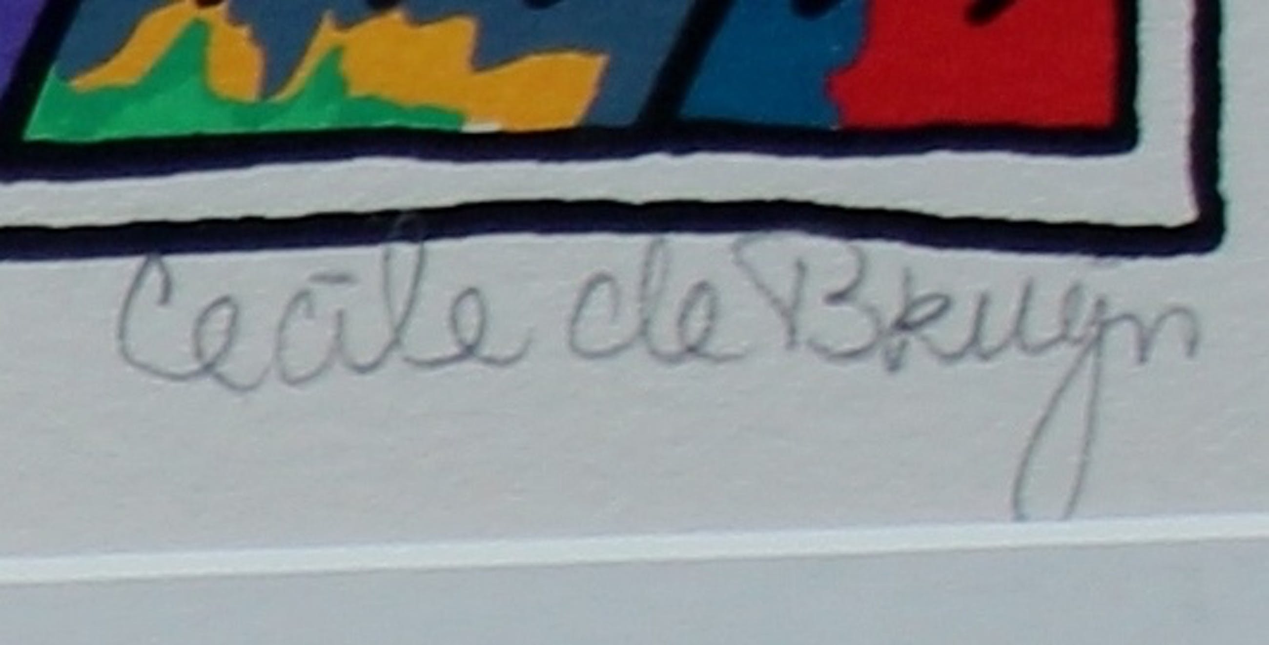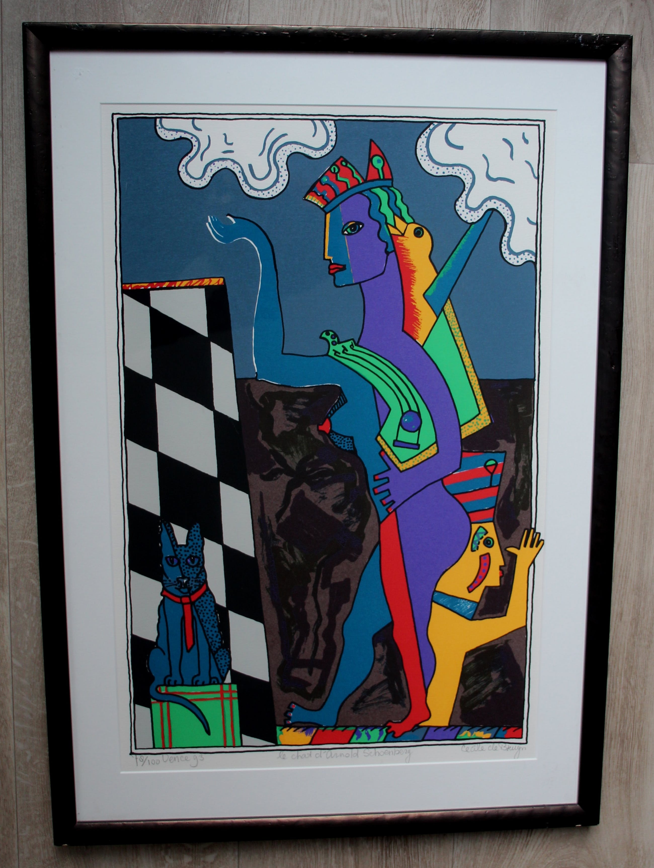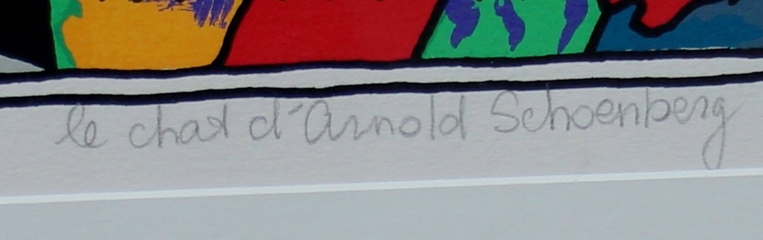 Kleurrijke ingelijste zeefdruk van Cecile de Bruijn met de titel: Le chat d 'Arnold Schoenberg. Nummer: 78/100. Jaar: 1993. Afmetingen incl. lijst: h70 x b49,5 cm. Afmetingen voorstelling: h54,5 x b35,5 cm. De authenticiteit van het aangeboden werk wordt volledig gegarandeerd. Een certificaat van echtheid kan, op aanvraag, worden gemaild.